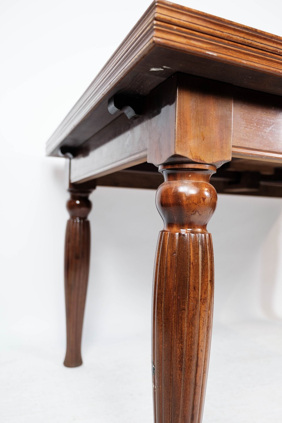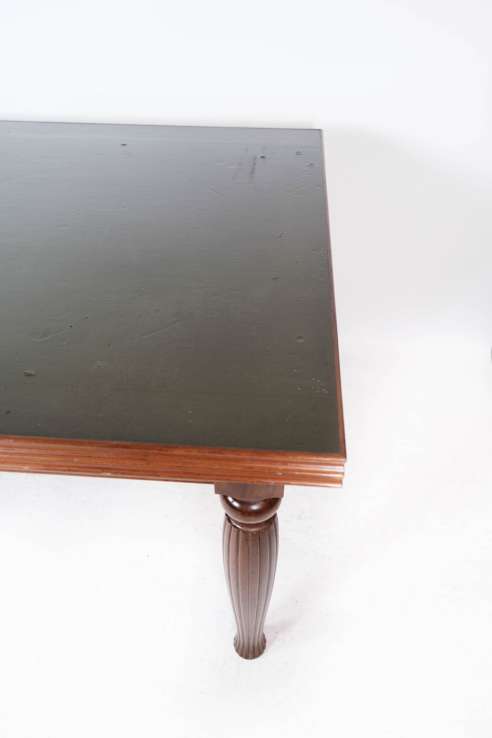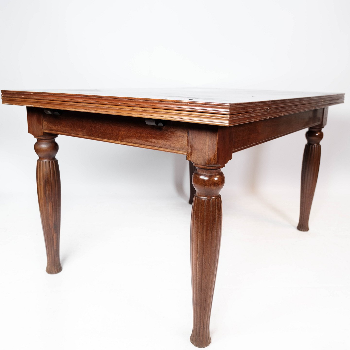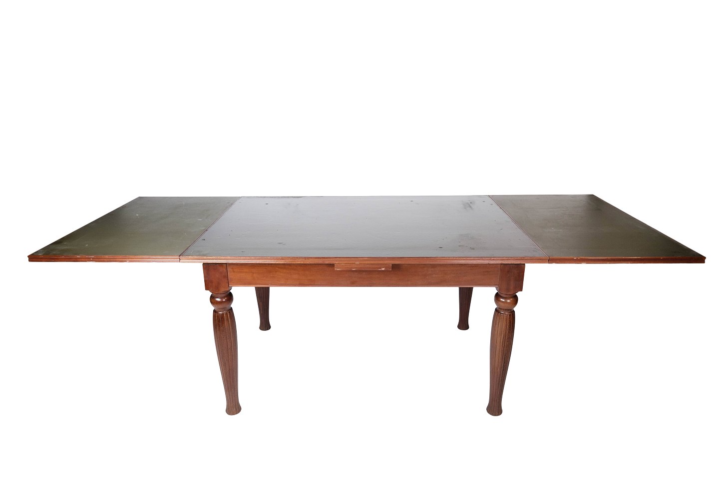 SolgtSpisebord i mahogni med mørk linoleum plade og udtræk, i flot antik stand fra omkring 1930.