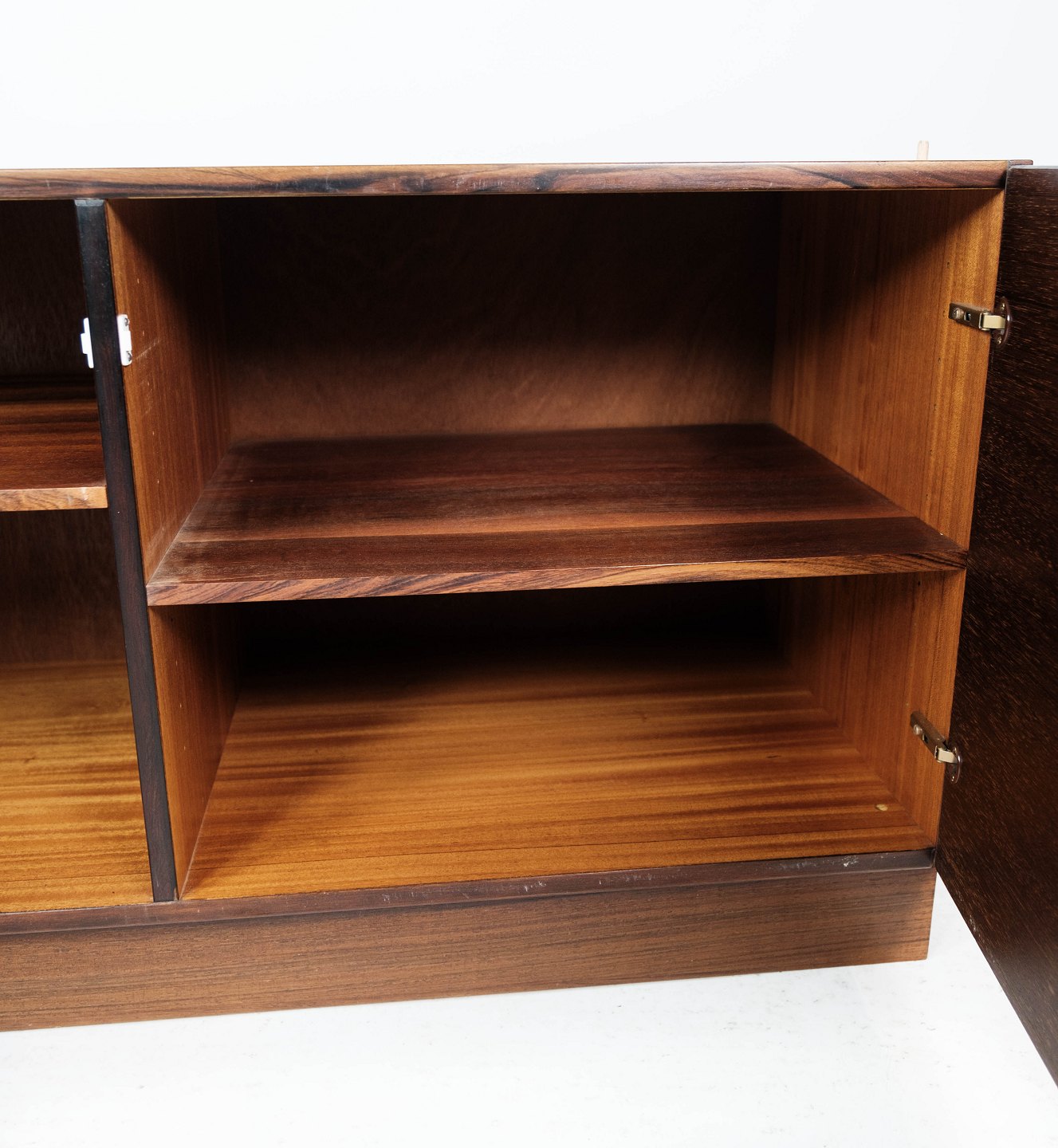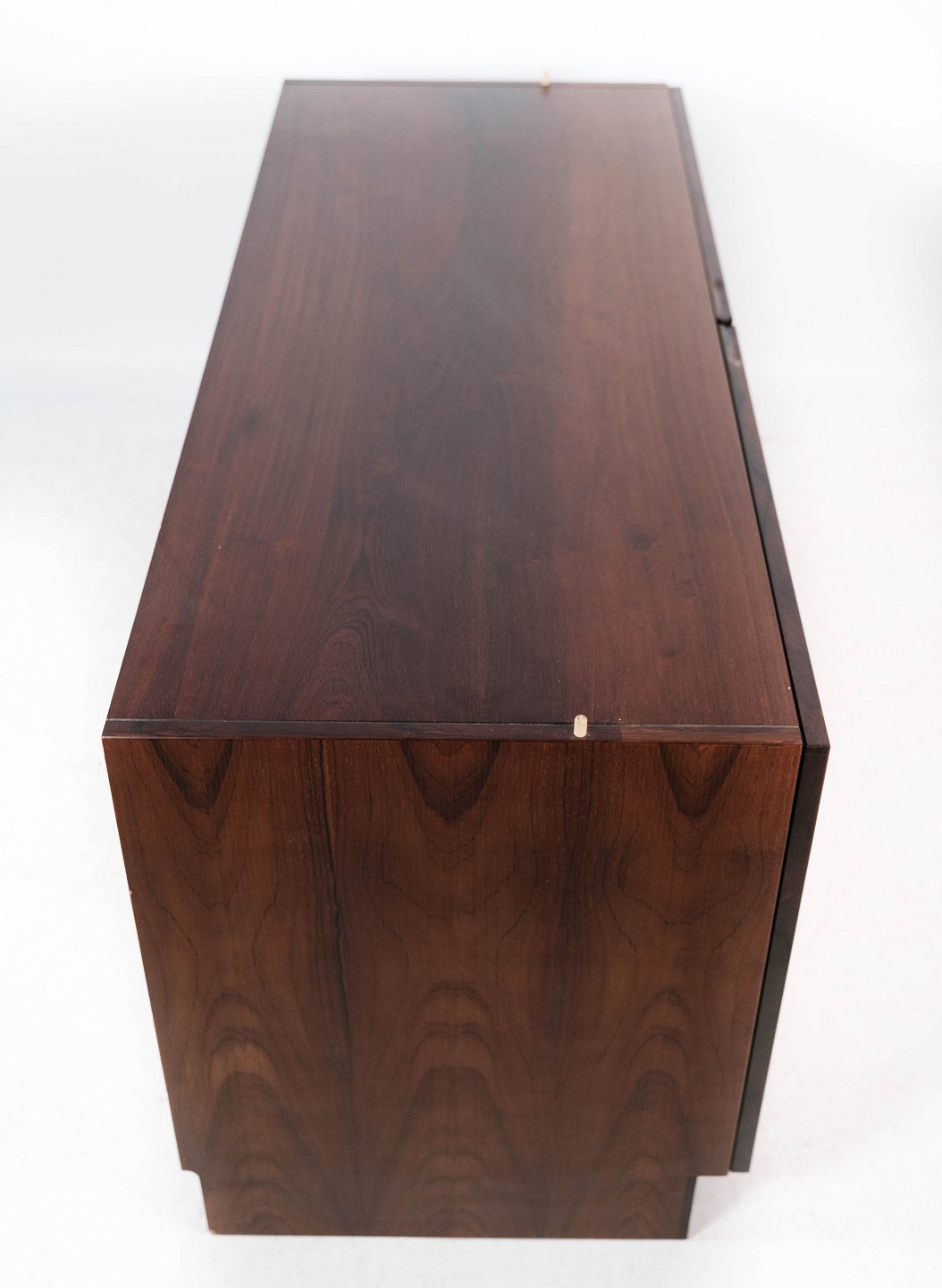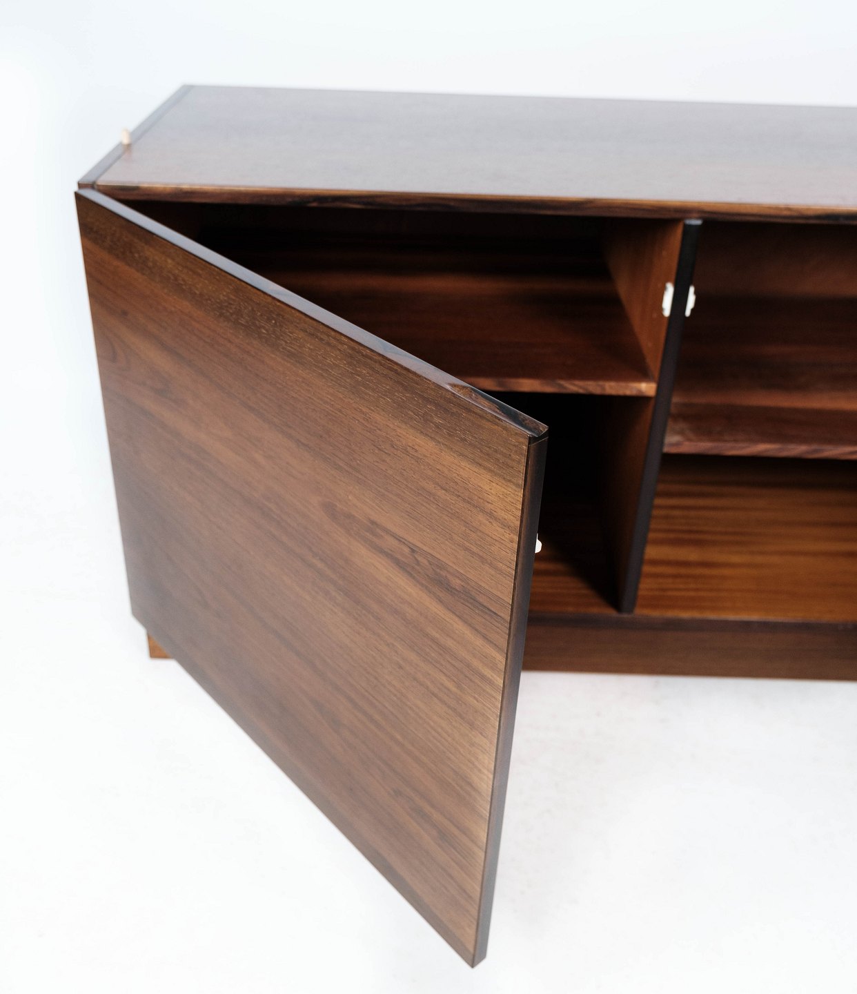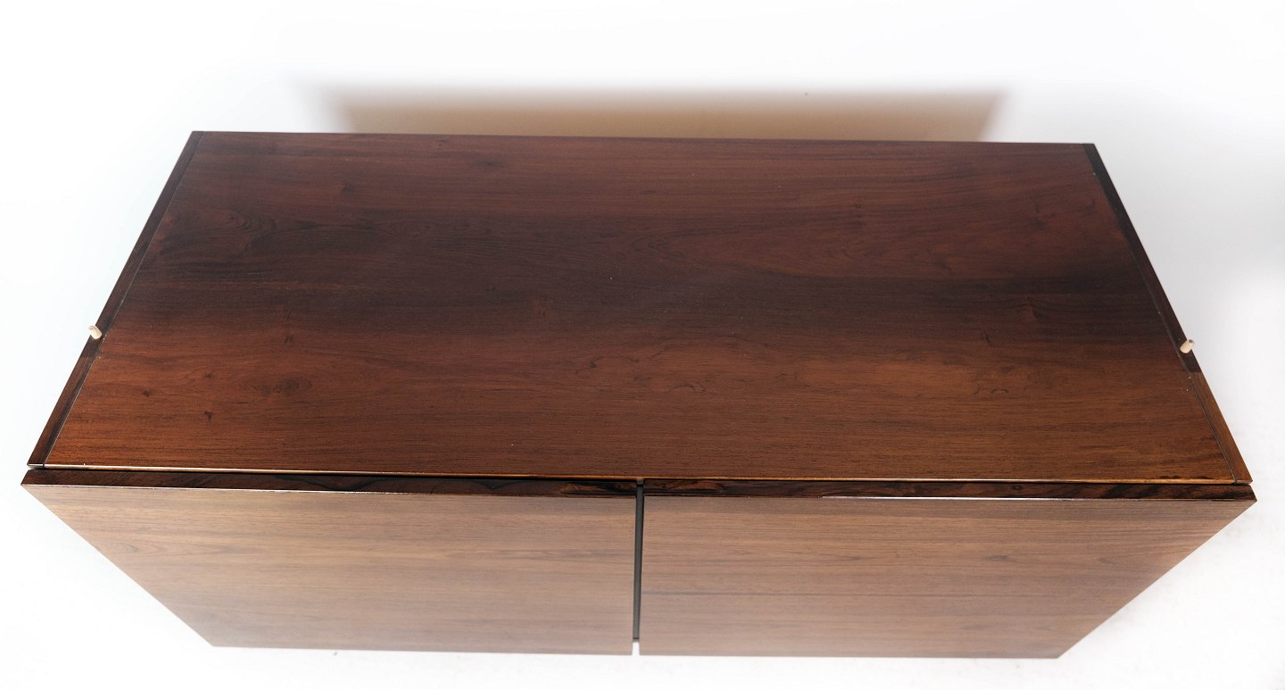 SolgtDenne lav kommode af palisander er et strålende eksempel på dansk design fra 1960'erne. Palisandertræet giver kommoden en varm og dyb farve, og dens unikke årer tilføjer en naturlig skønhed og karakter til møblet.