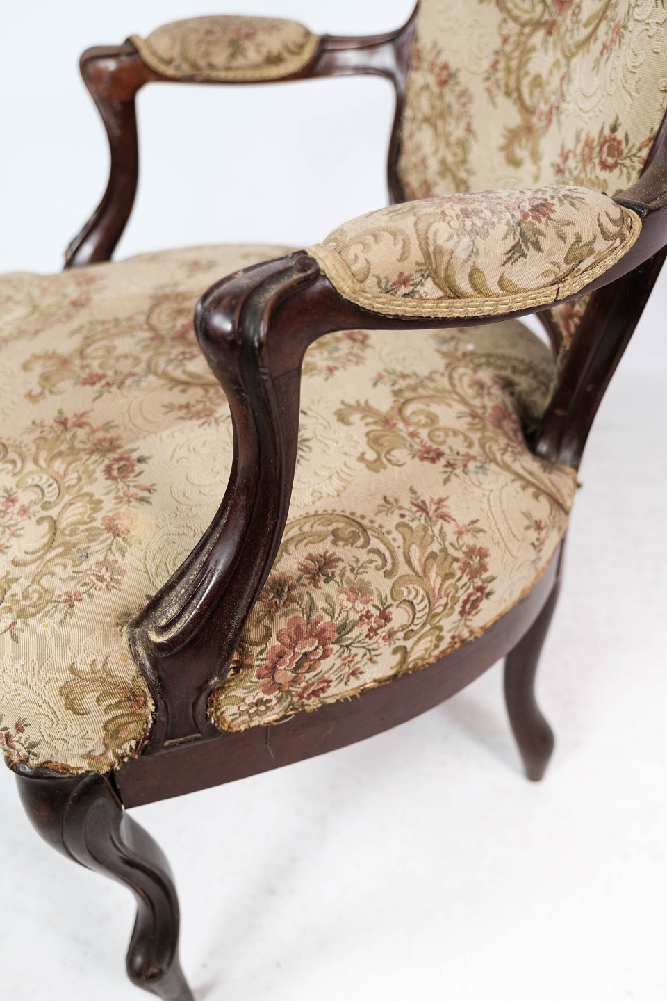 Rokoko armstol af palisander og polstret med blomstret stof, i flot antik stand fra omkring 1880.