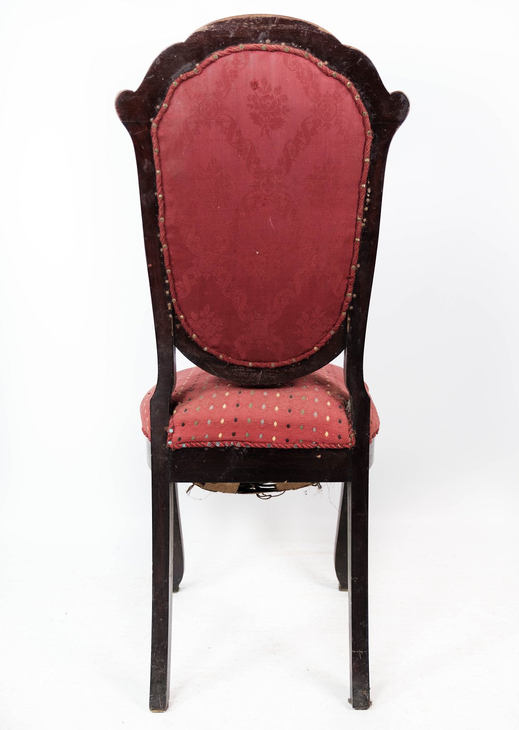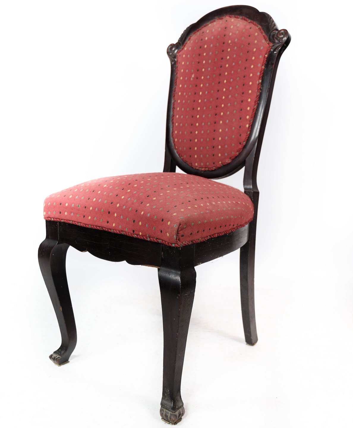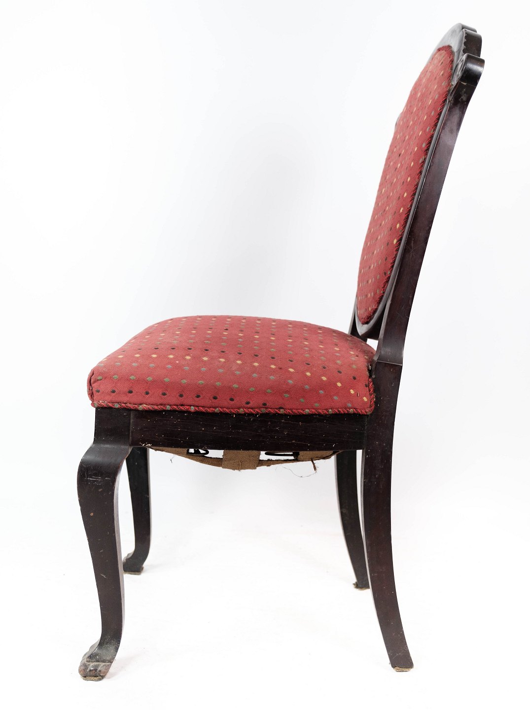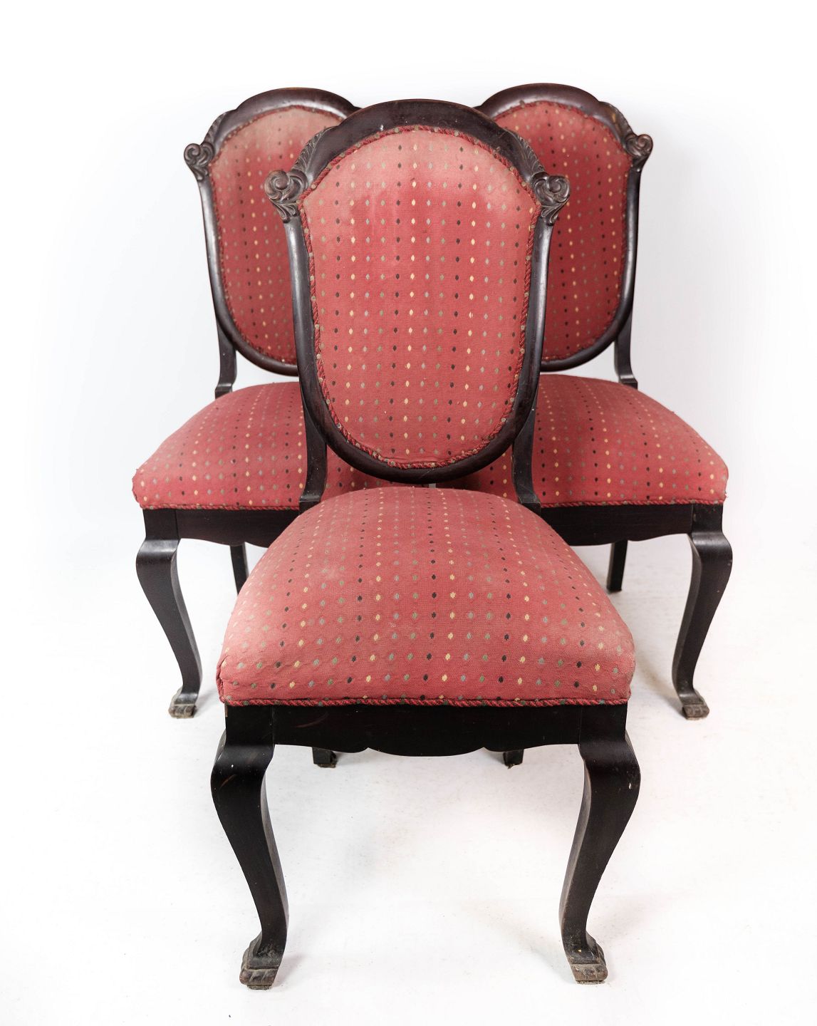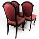 Sæt af tre spisestuestole af mahogni og polstret med rødt stof fra omkring 1920. Stolene er i flot antik stand.