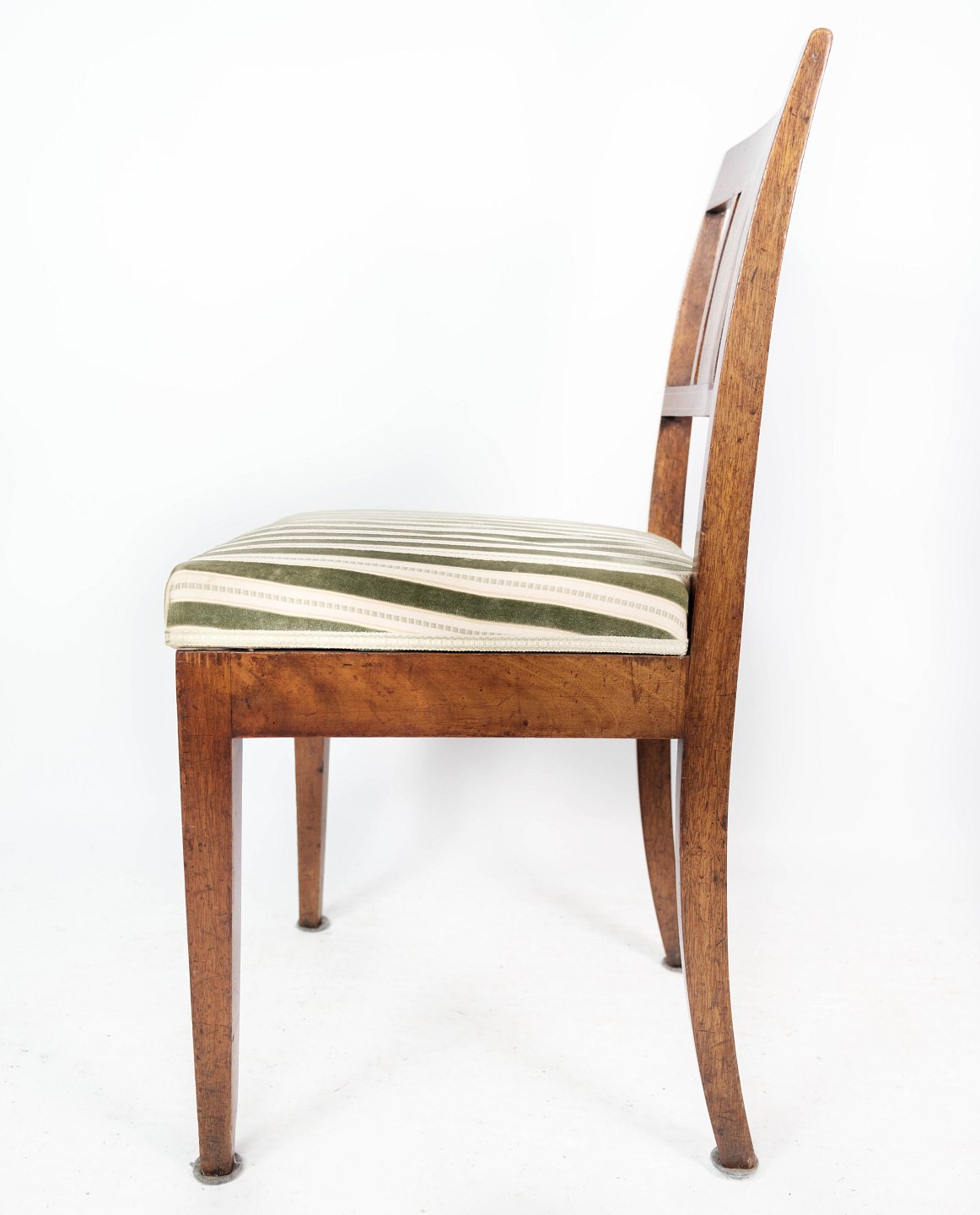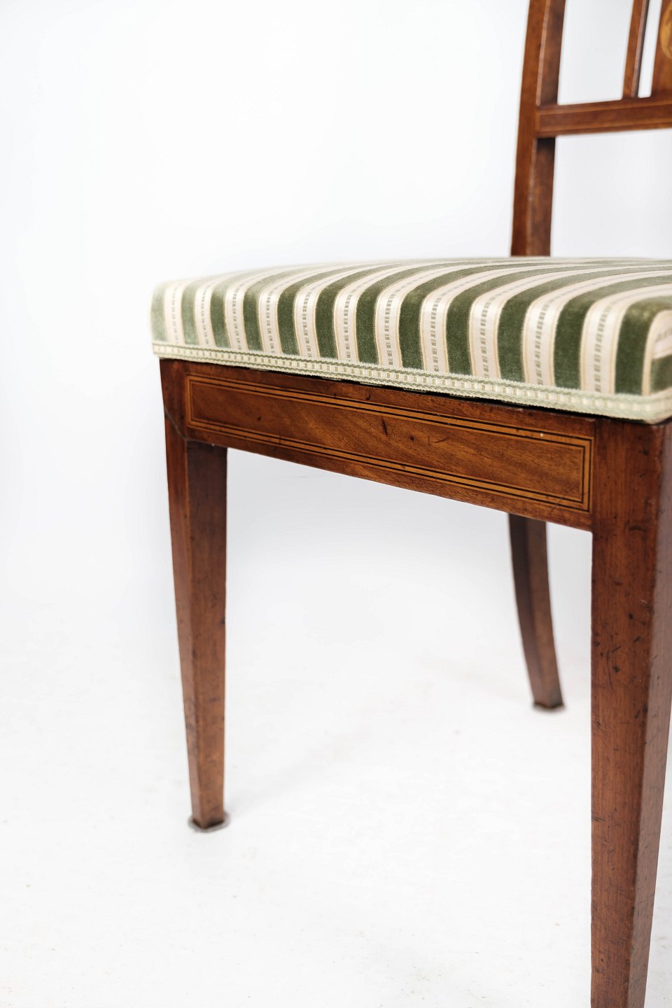 Spisestuestol af mahogni med intarsia og polstret med stribet stof fra 1920erne.