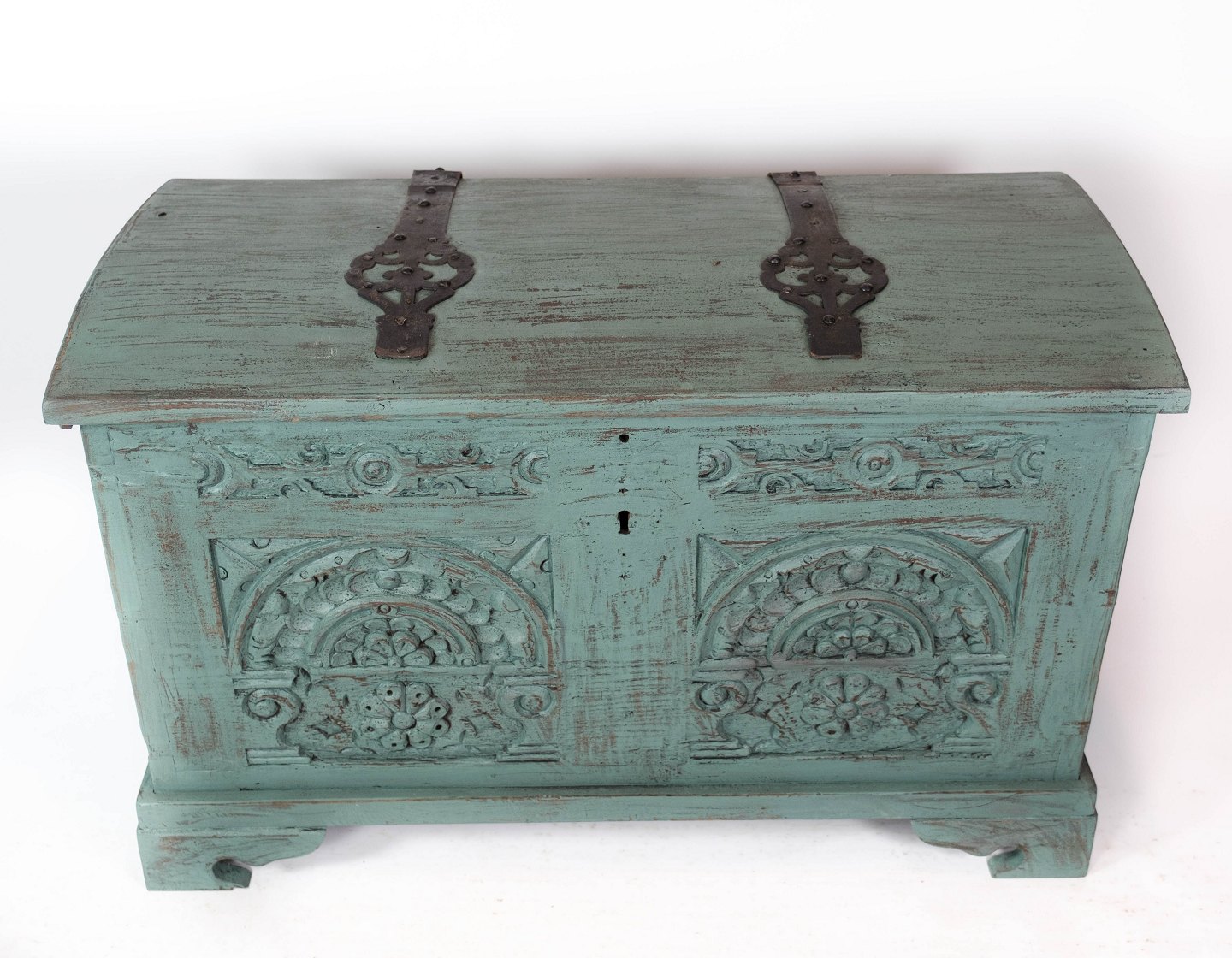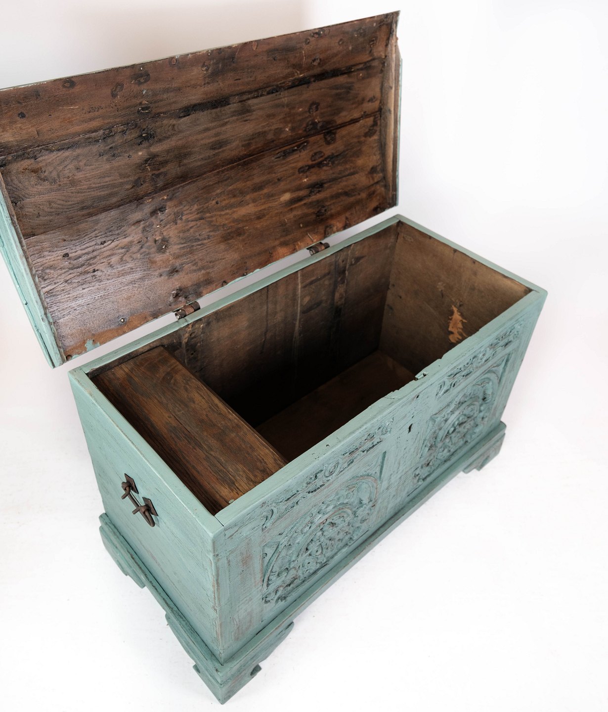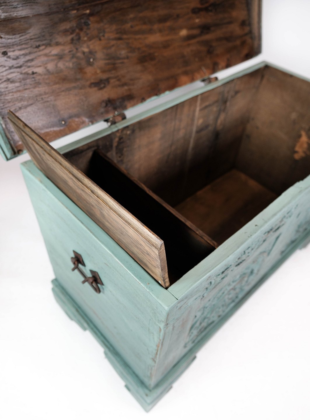 SolgtAntik kiste med udskæringer og original turkis bemaling. Kisten er i flot brugt stand og fra omkring år 1740.