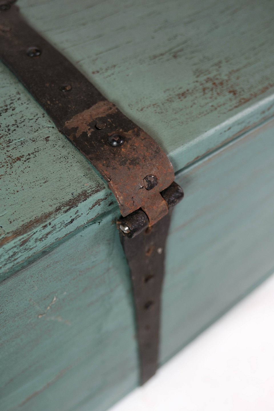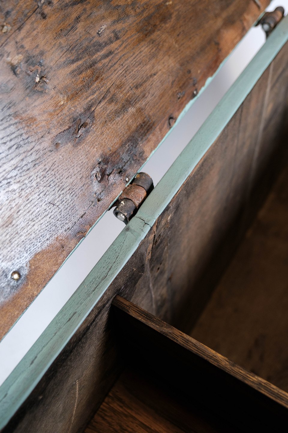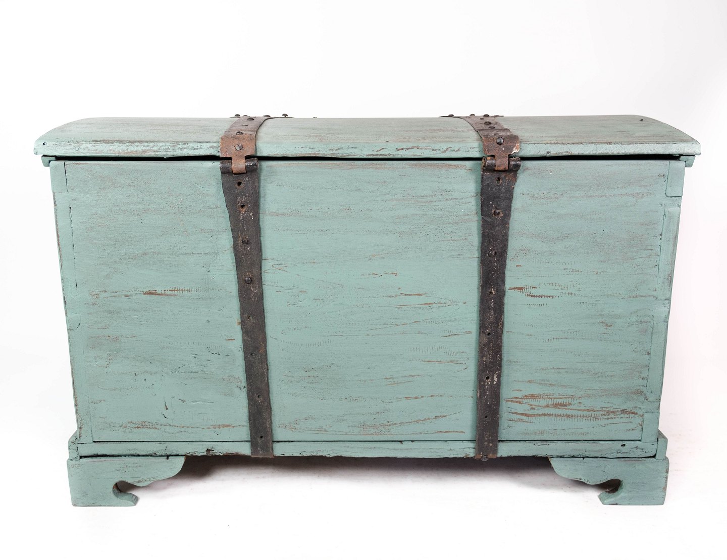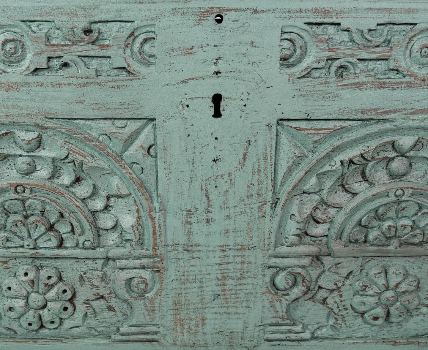 SolgtAntik kiste med udskæringer og original turkis bemaling. Kisten er i flot brugt stand og fra omkring år 1740.