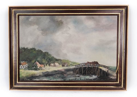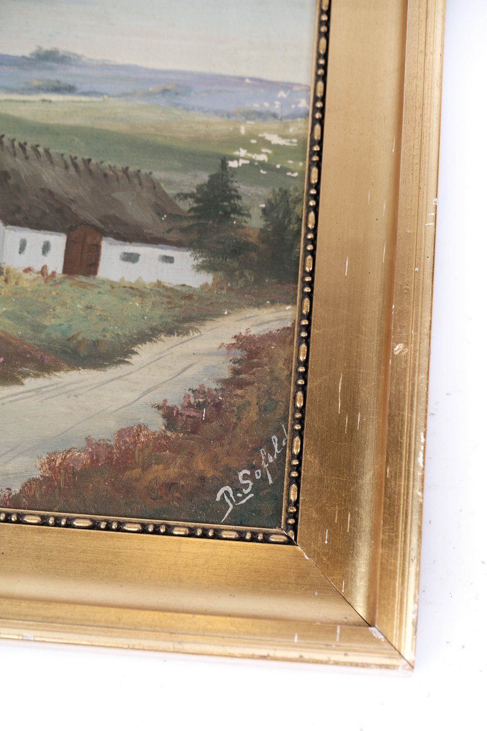 Maleri på lærred med land motiv og forgyldt ramme, med ukendt signatur fra 1920erne.