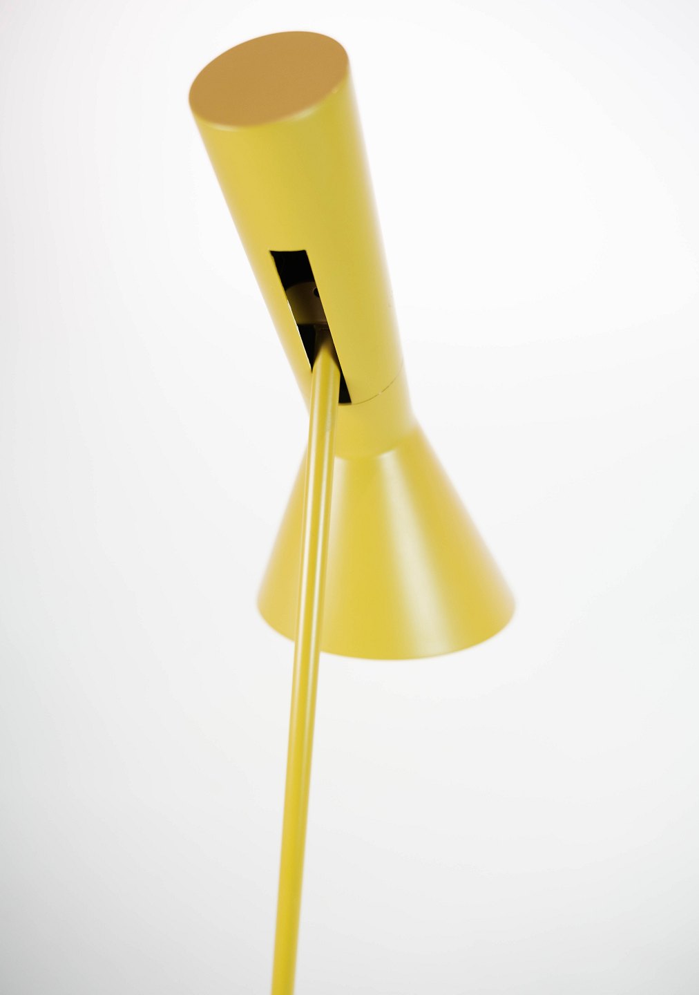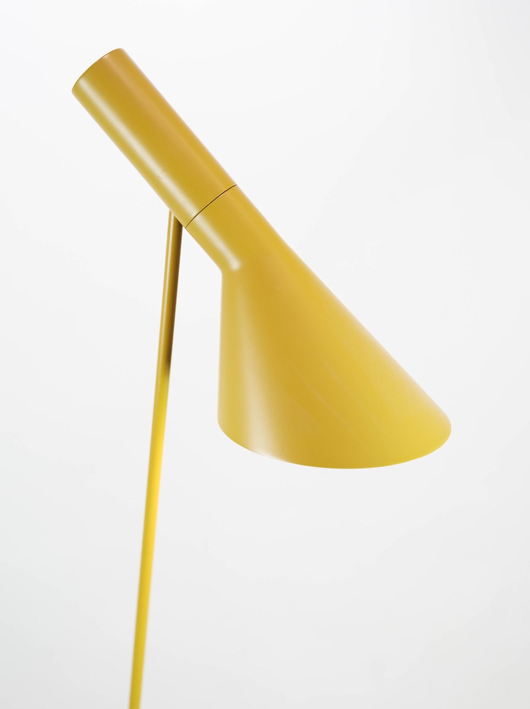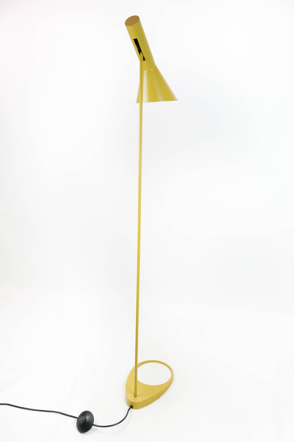Gul gulvlampe designet af Arne Jacobsen og fremstillet af Louis Poulsen.