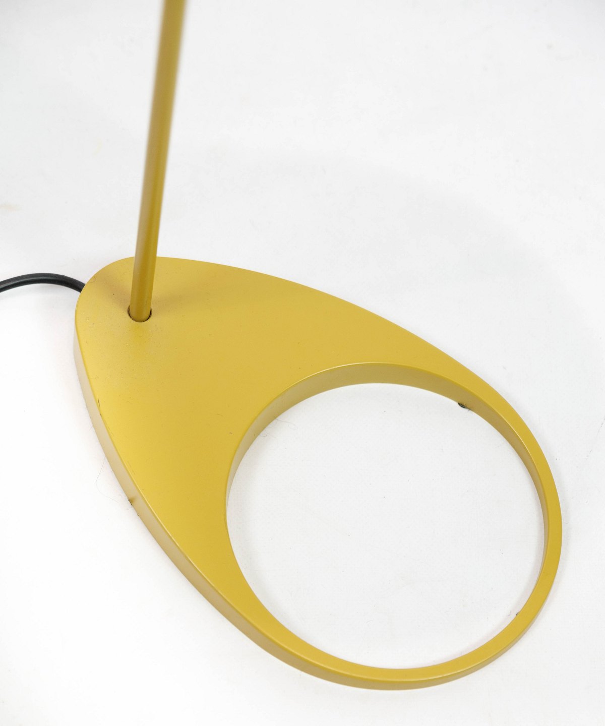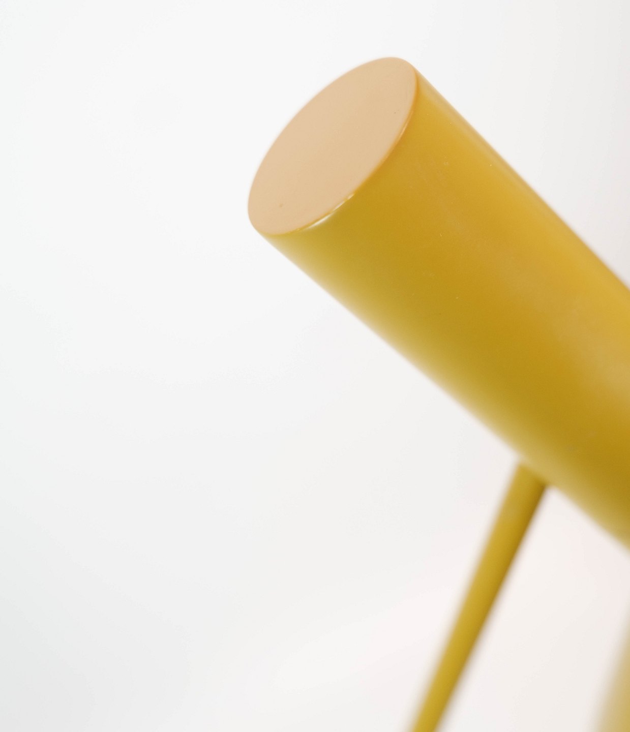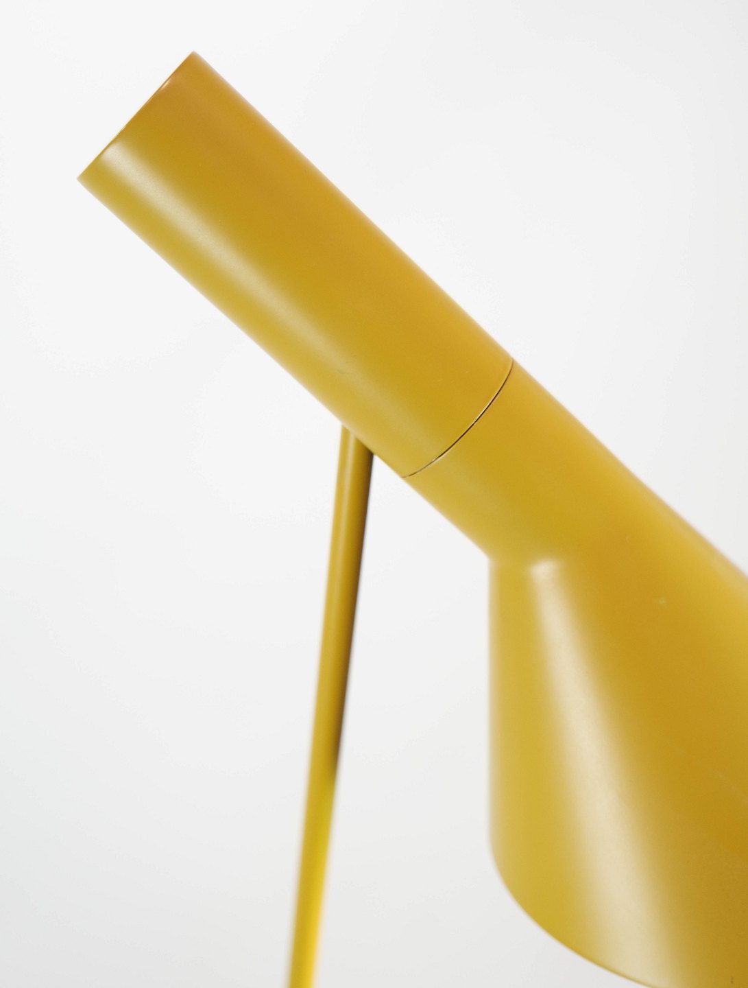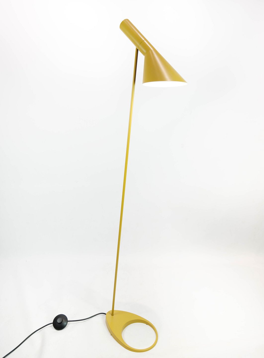 Gul gulvlampe designet af Arne Jacobsen og fremstillet af Louis Poulsen.