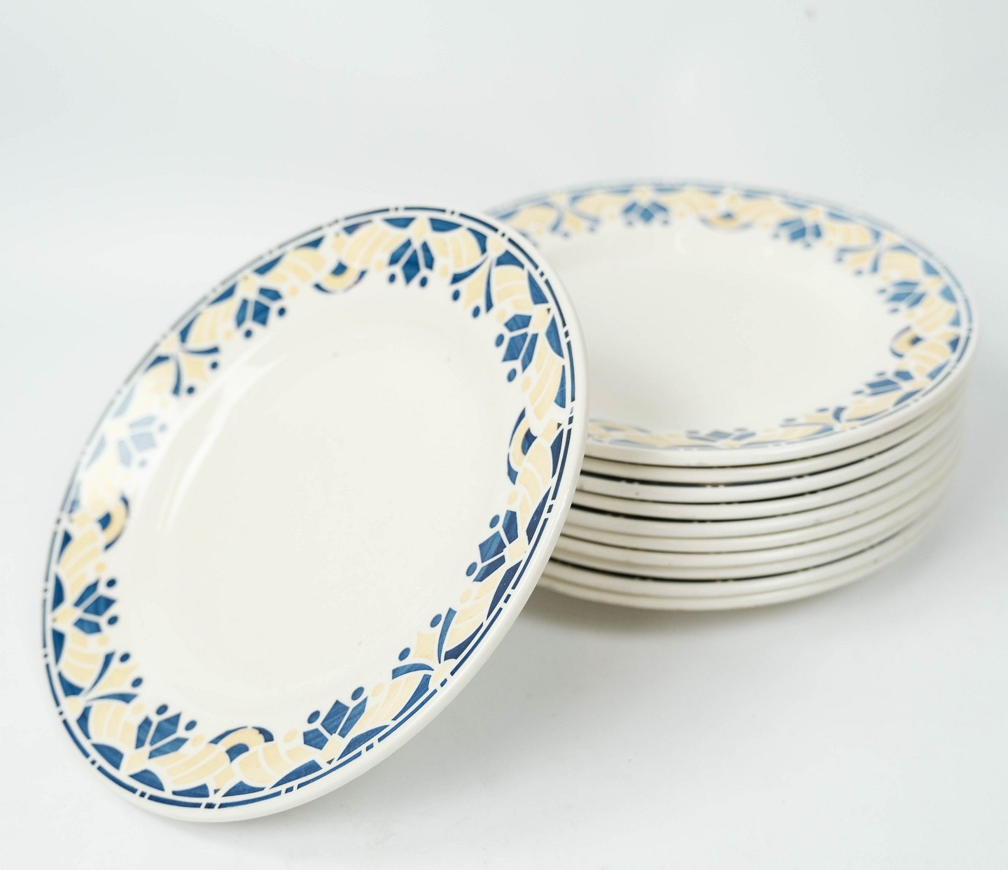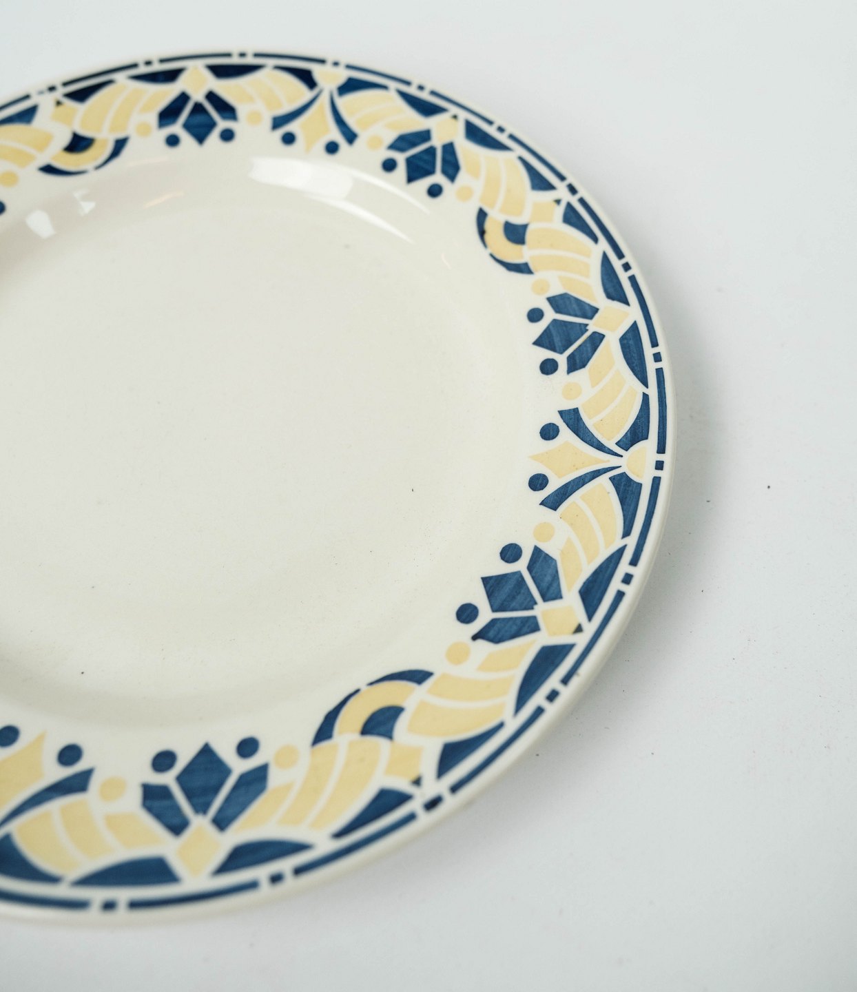 Middagstallerken dekoreret med gul og blå farver fra 1960erne. Vi har 11 stk. på lager.