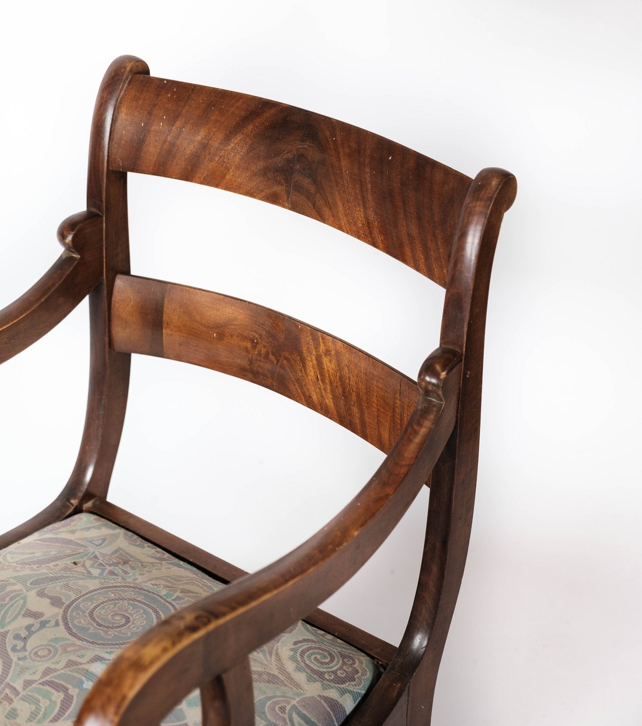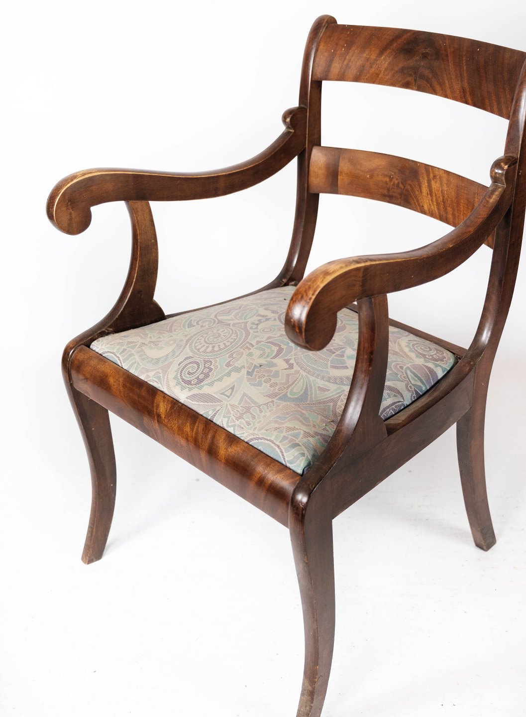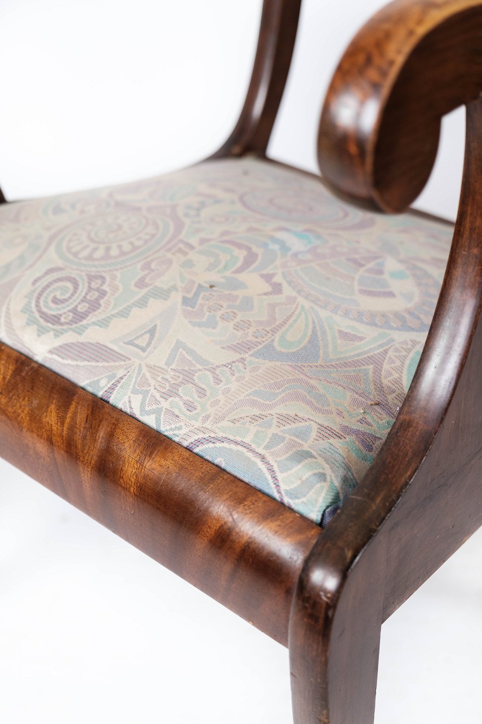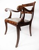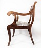 Sen Empire antik armstol af mahogni og polstret med lyst stof fra 1840erne.