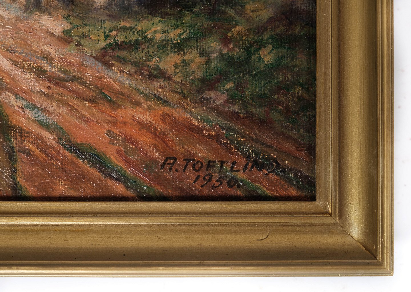 Maleri på lærred med skovmotiv og forgyldt ramme, signeret A. Toftlind 1950.