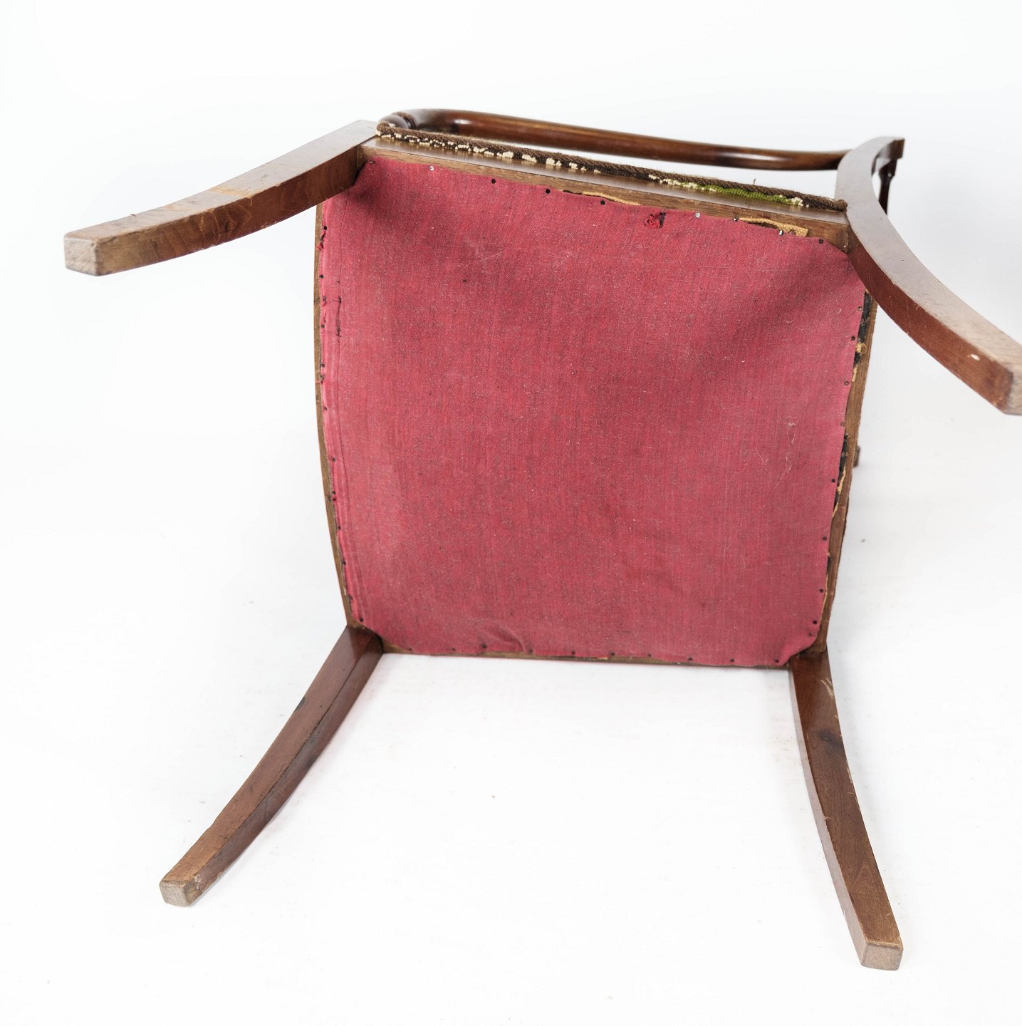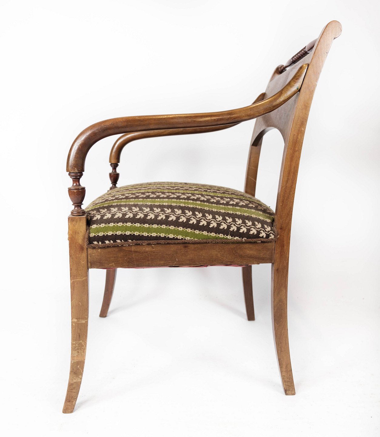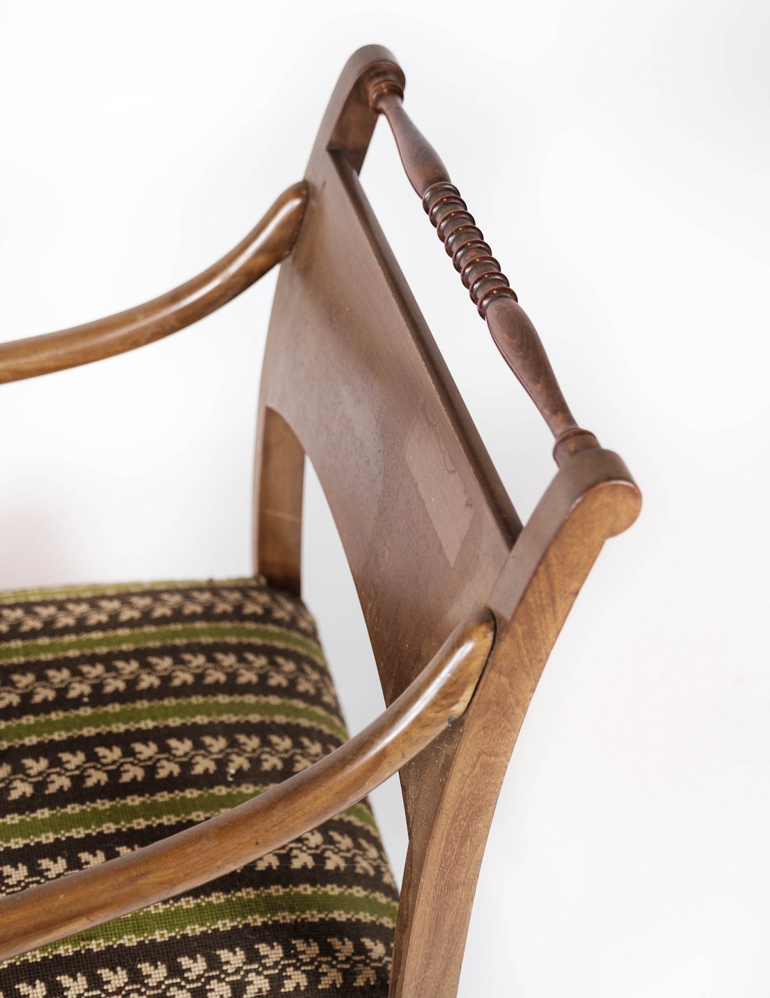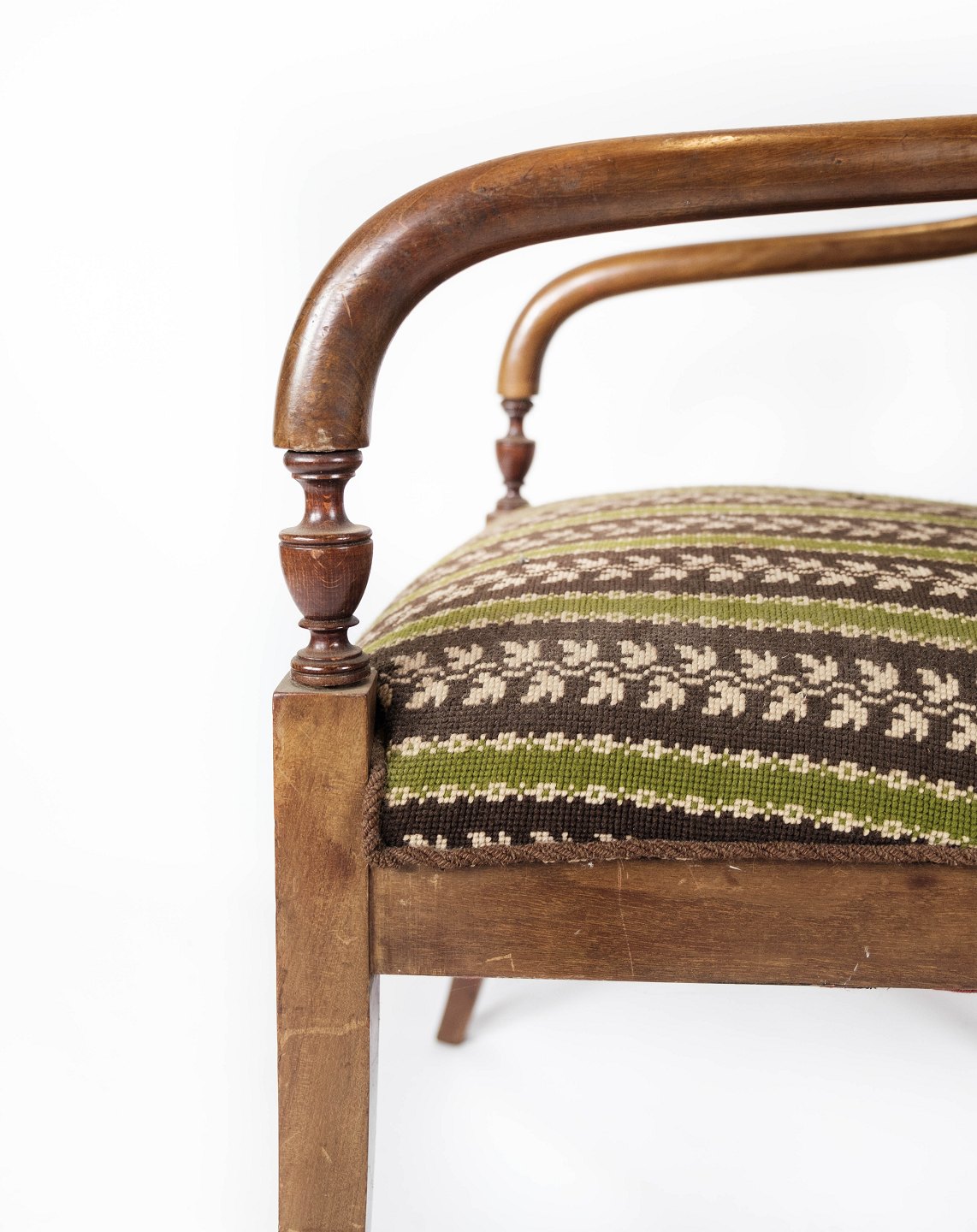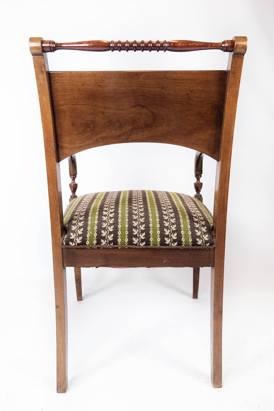 Armstol af poleret mahogni og polstret med grønt stribet stof, fra 1860erne.