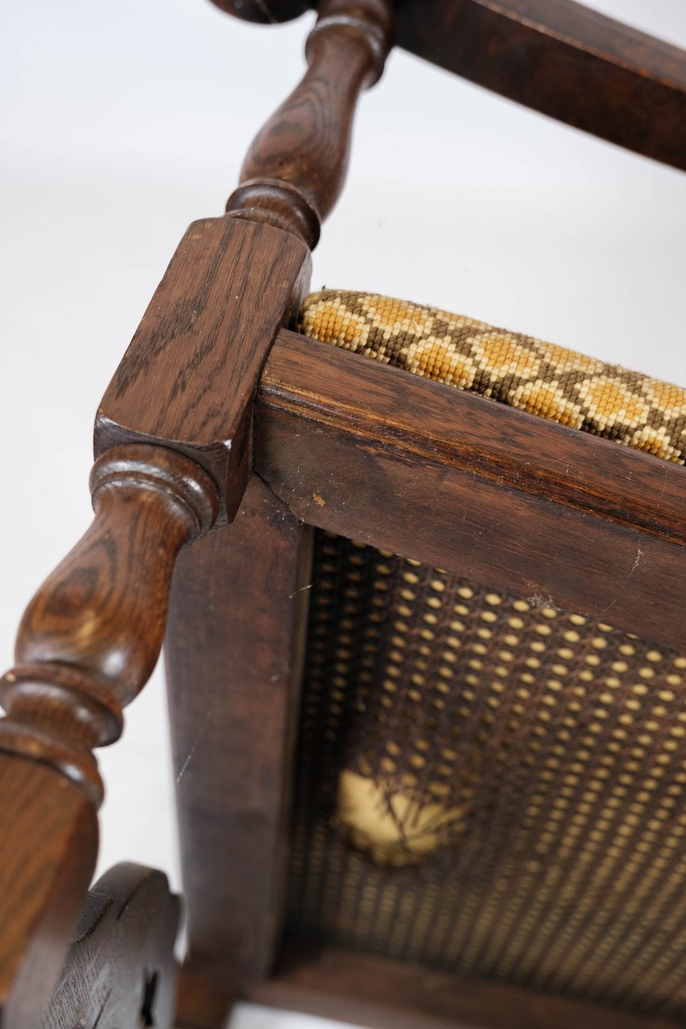 Antik armstol af eg, med original polstring af lyst stof og rørflet, fra 1920erne.