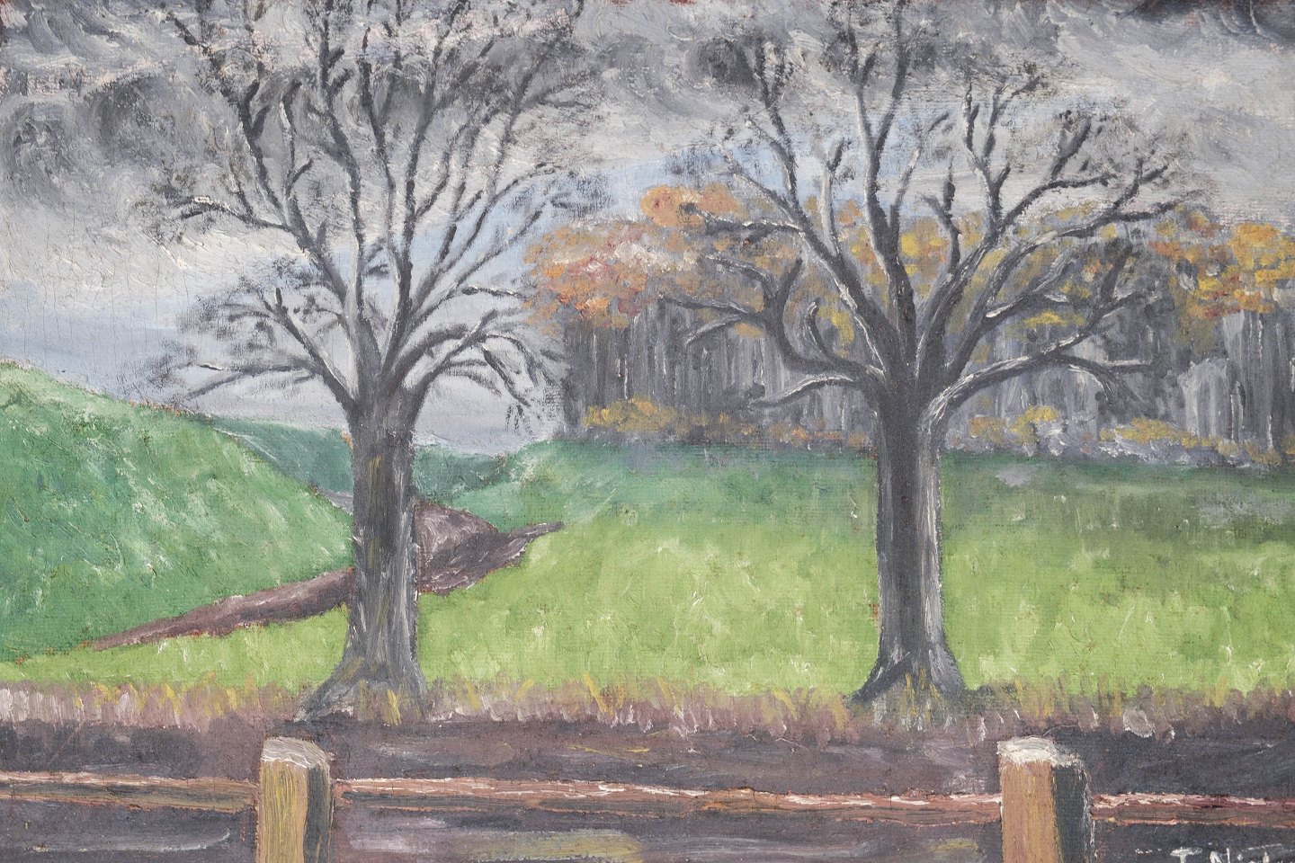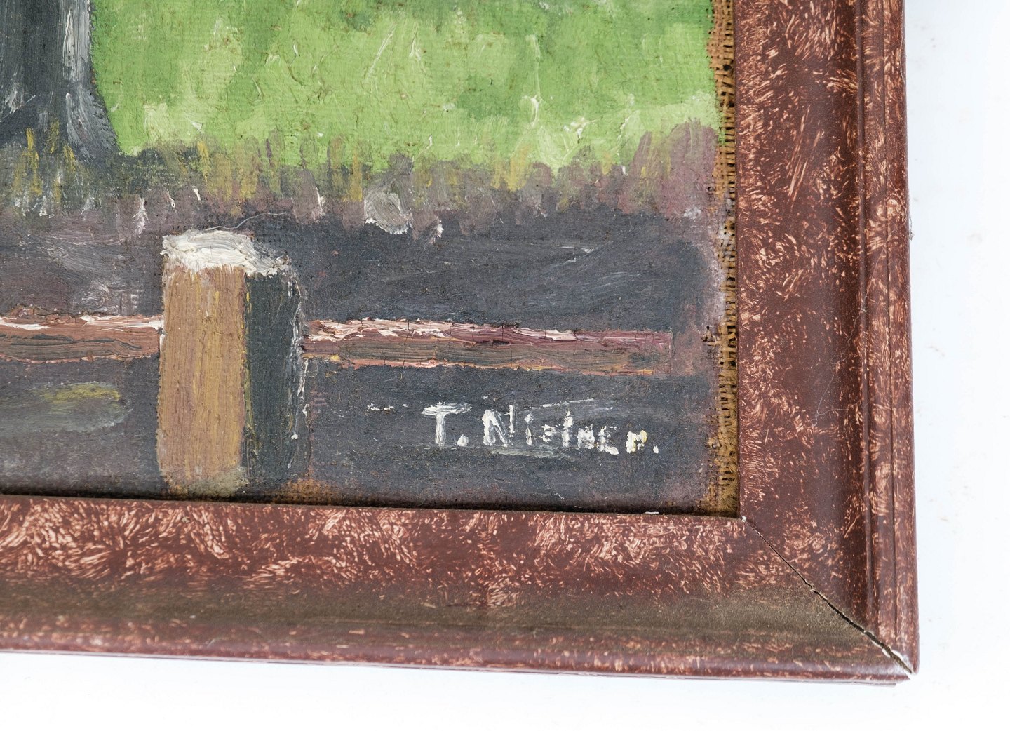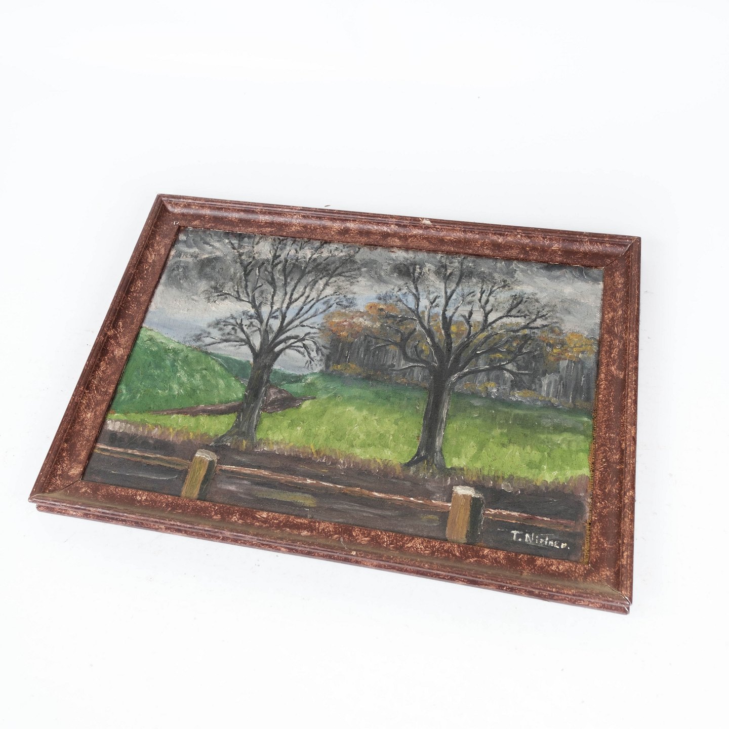 Maleri på lærred med natur motiv og mørk ramme, signeret T. Nielsen fra 1930erne.