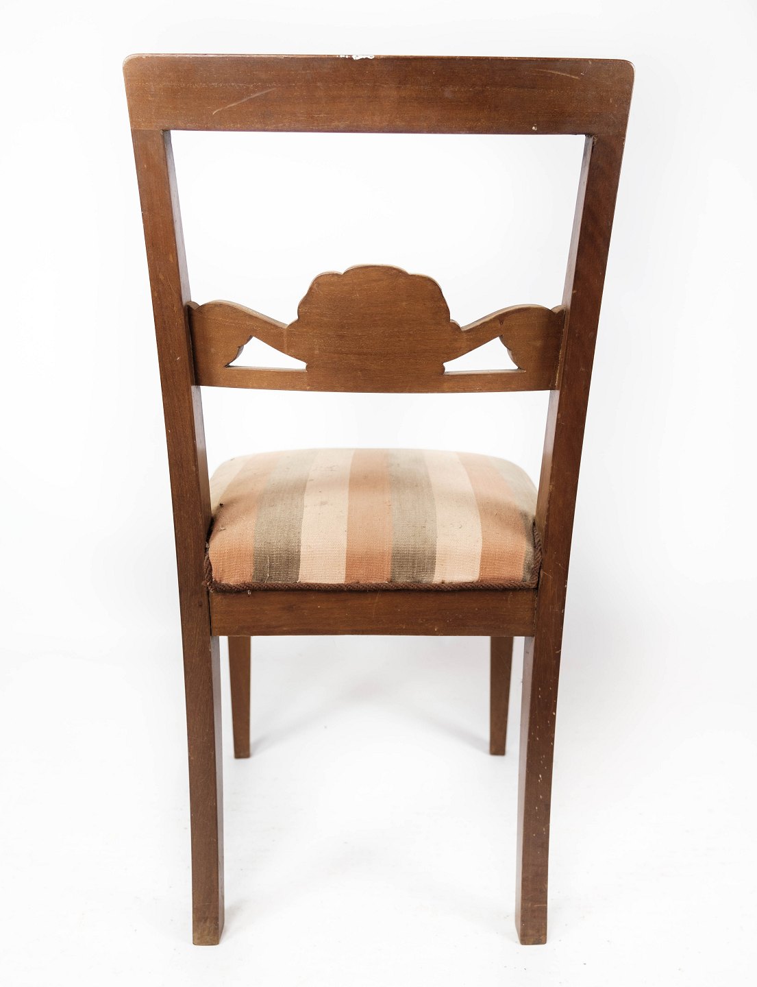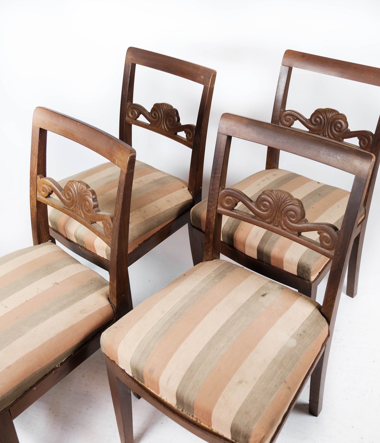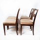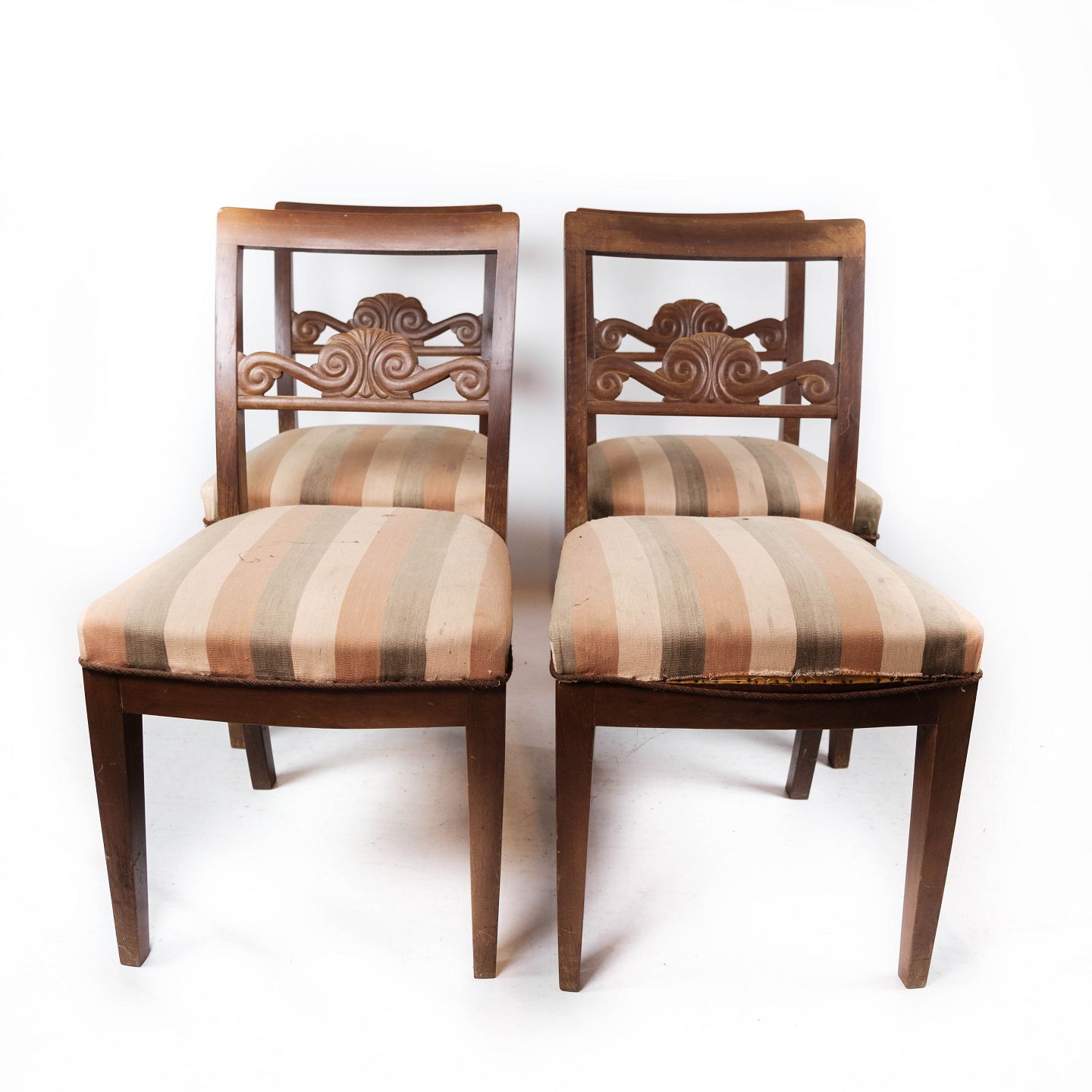 Sæt af fire spisestuestole af mahogni og med originalt stribet polstring, fra 1910erne.