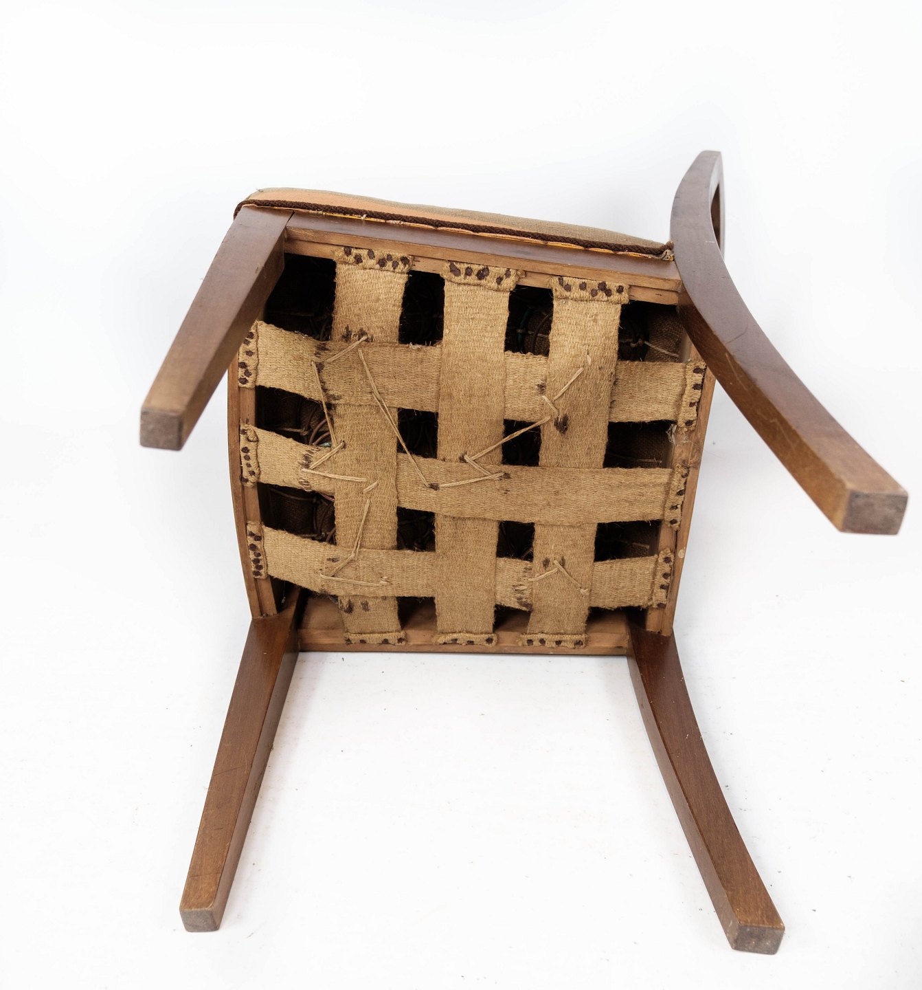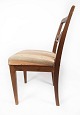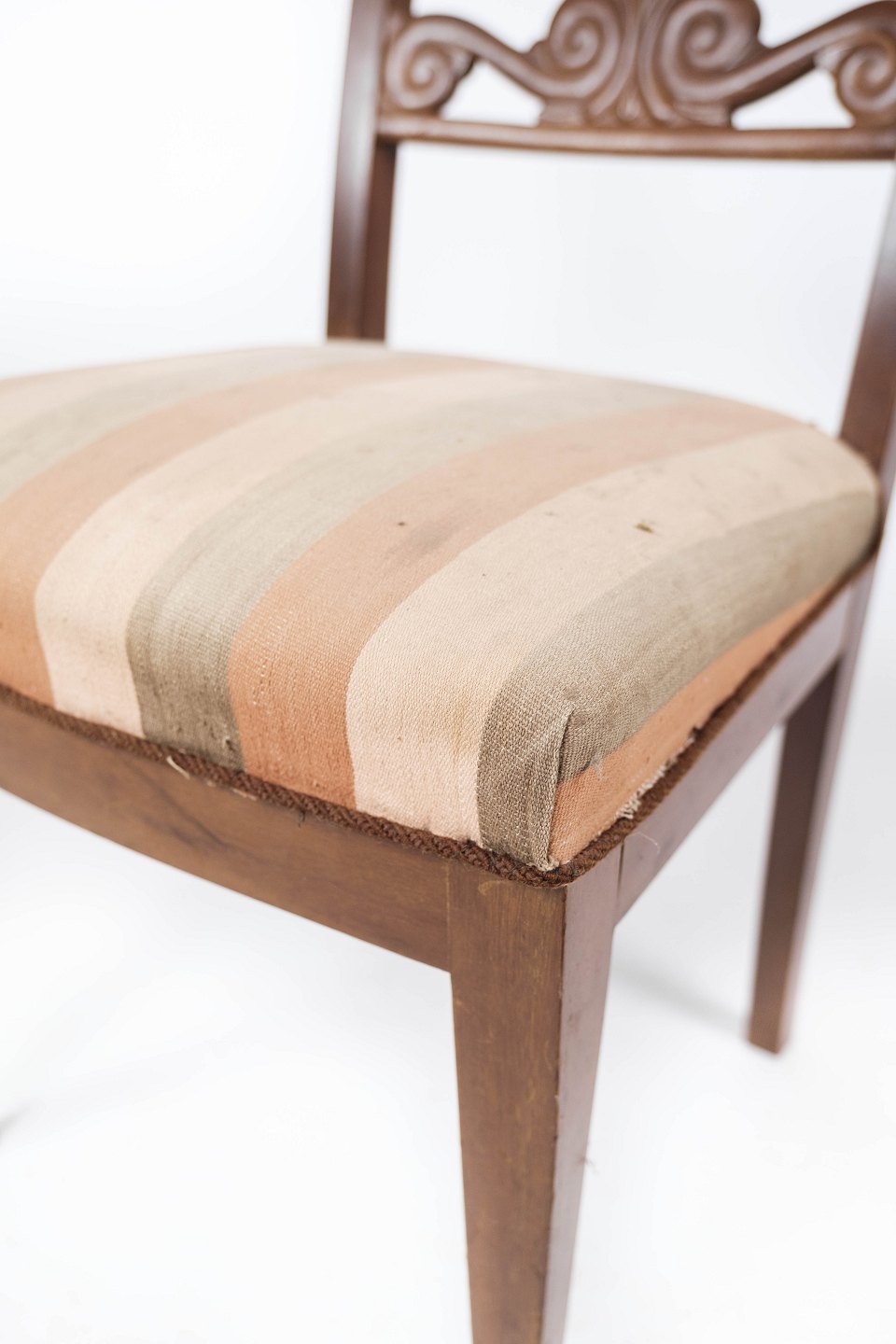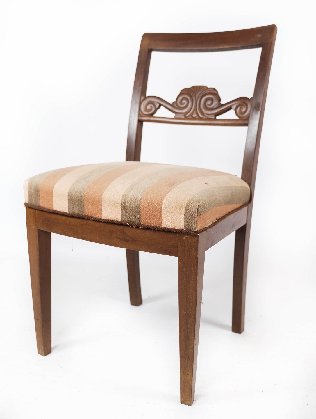 Sæt af fire spisestuestole af mahogni og med originalt stribet polstring, fra 1910erne.