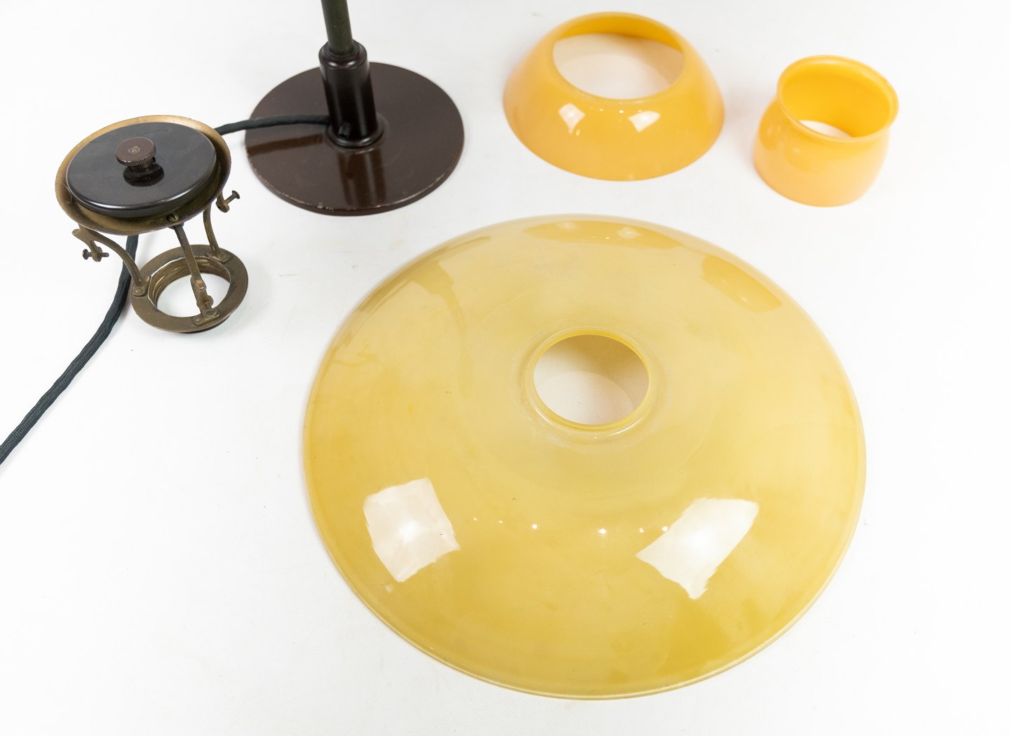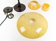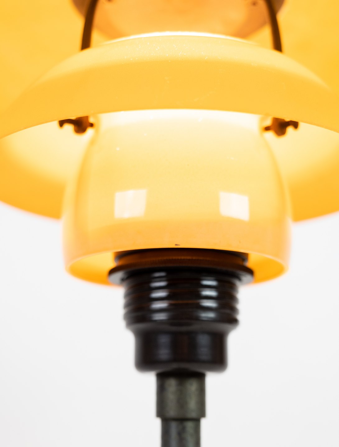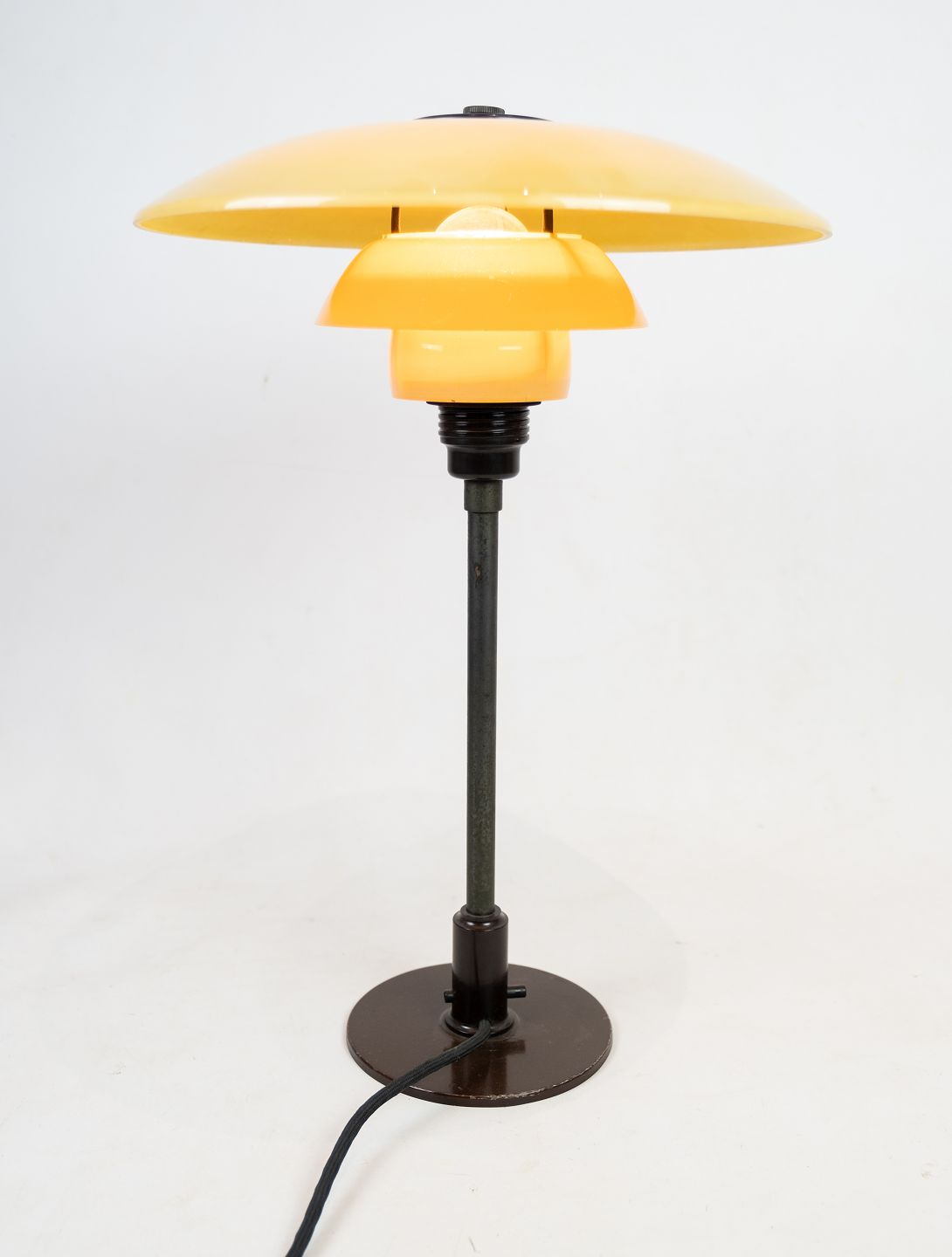SolgtPH 3-1/2 2-1/2 bord lampe med bruneret metalstel og gul mat opalskærme med gennem gående afbryder fra år 1933. Lampen fremstår i meget fin brugt stand.