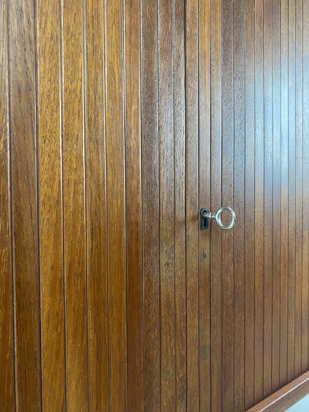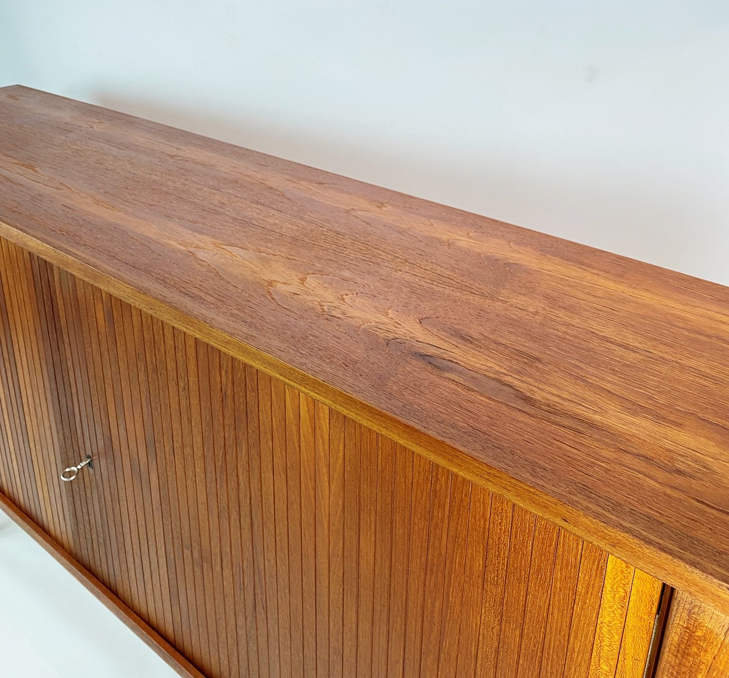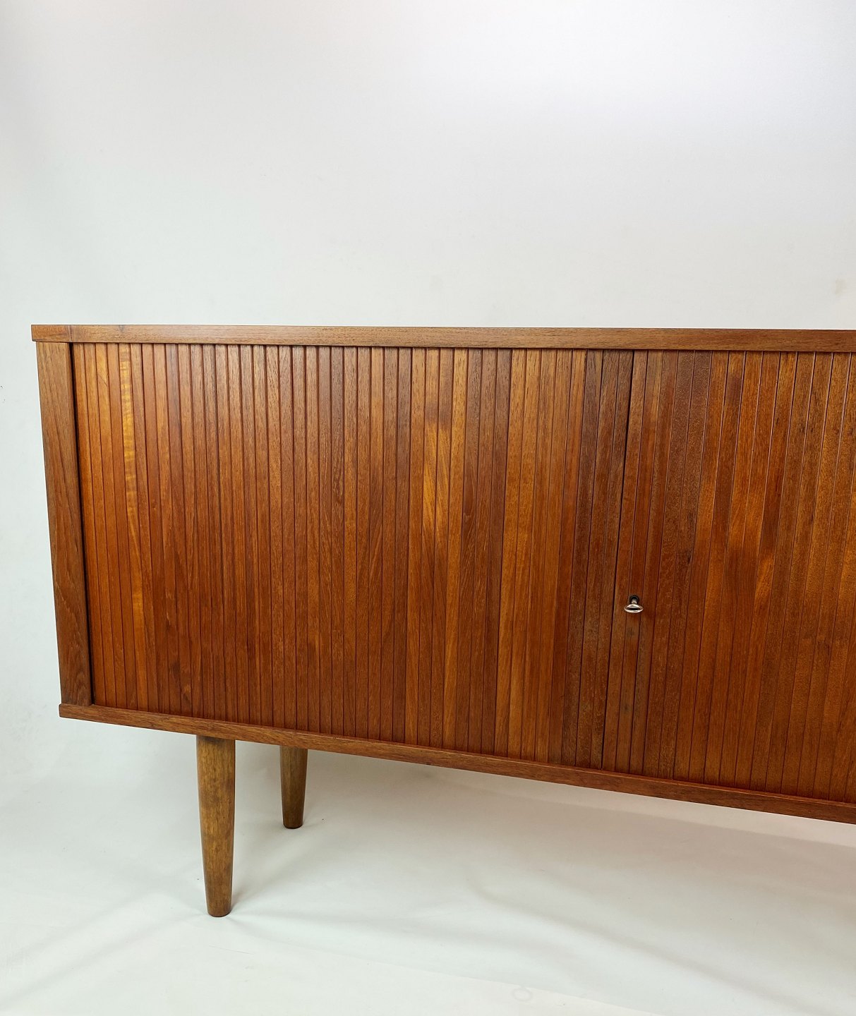 SolgtLav skænk med jalousi låger i teak af dansk design fra 1960erne. Skænken er i flot brugt stand.