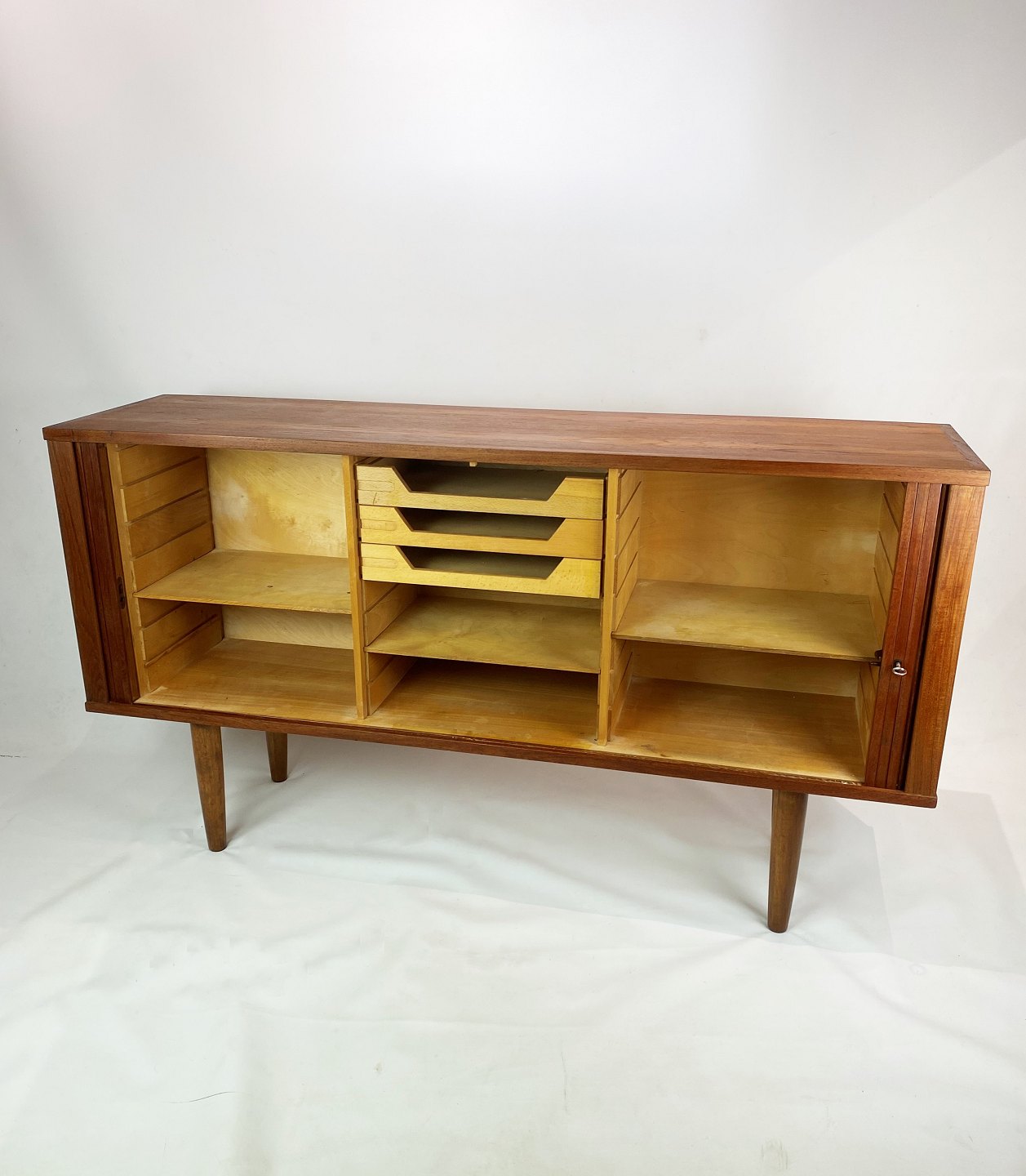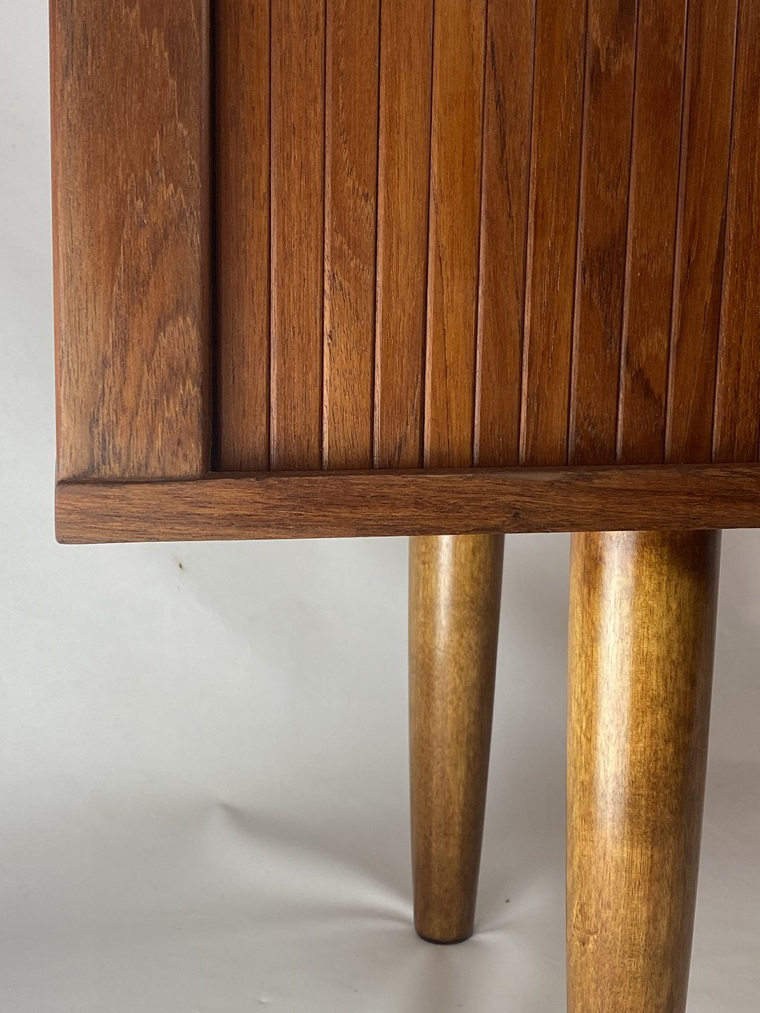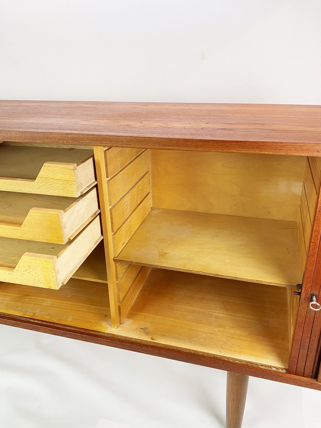 SolgtLav skænk med jalousi låger i teak af dansk design fra 1960erne. Skænken er i flot brugt stand.