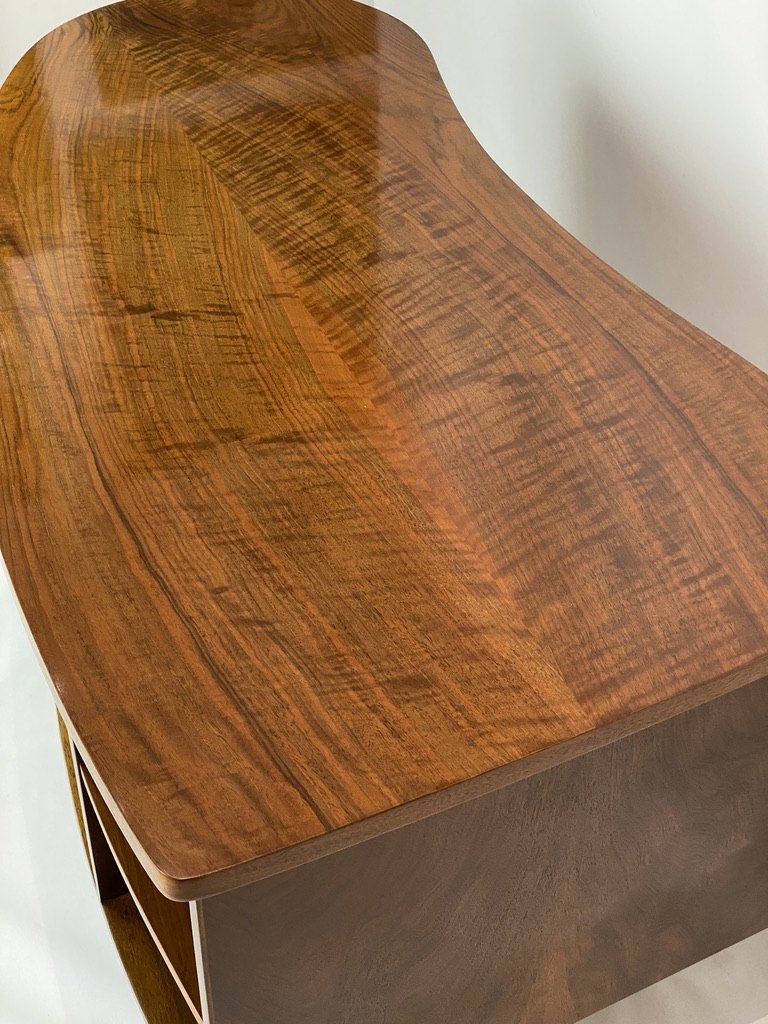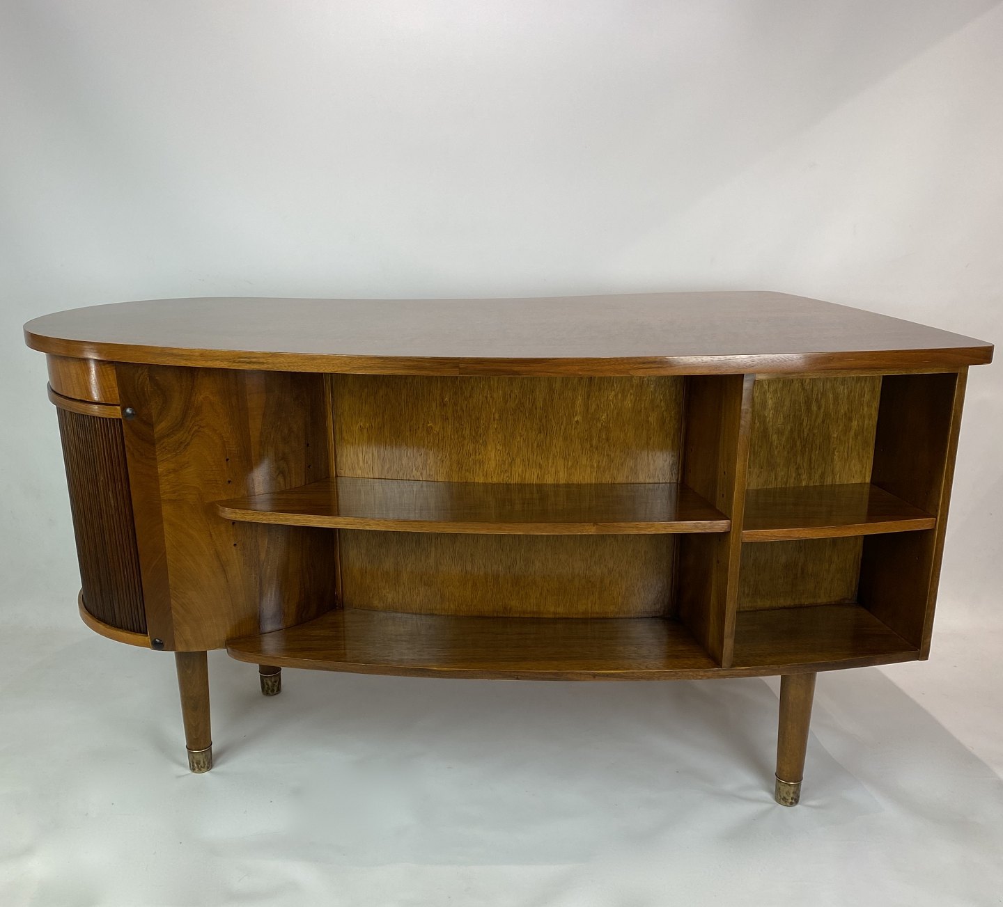 Kai Kristiansen var kendt for sit talent for at kombinere æstetik med funktionalitet, og dette skrivebord er et glimrende eksempel på dette. Det indbyggede barskab og jalousilåger tilføjer ekstra opbevaringsplads og skaber samtidig et rent og strømlinet udseende.