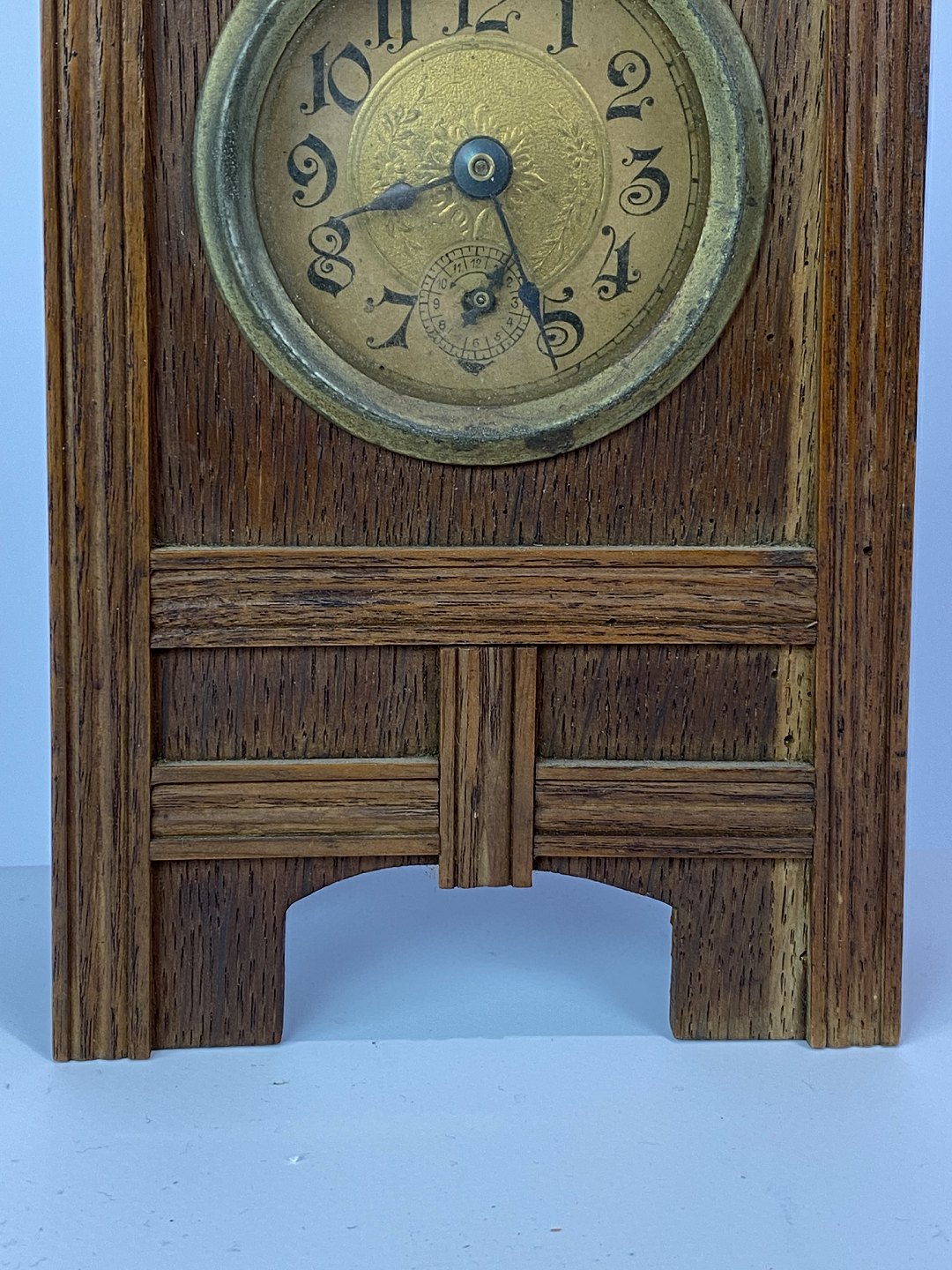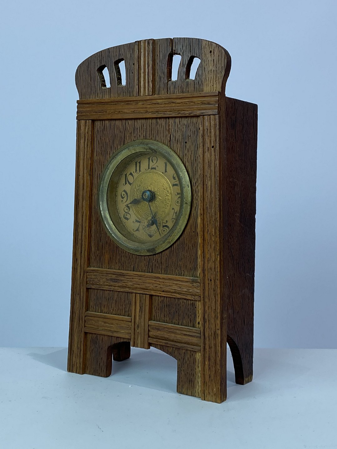 Kaminur af eg og skiven er af messing, fra omkring 1920erne. Uret er i pæn antik stand.