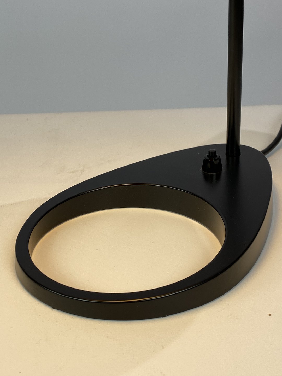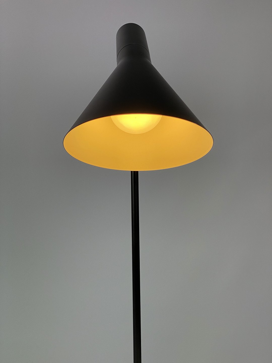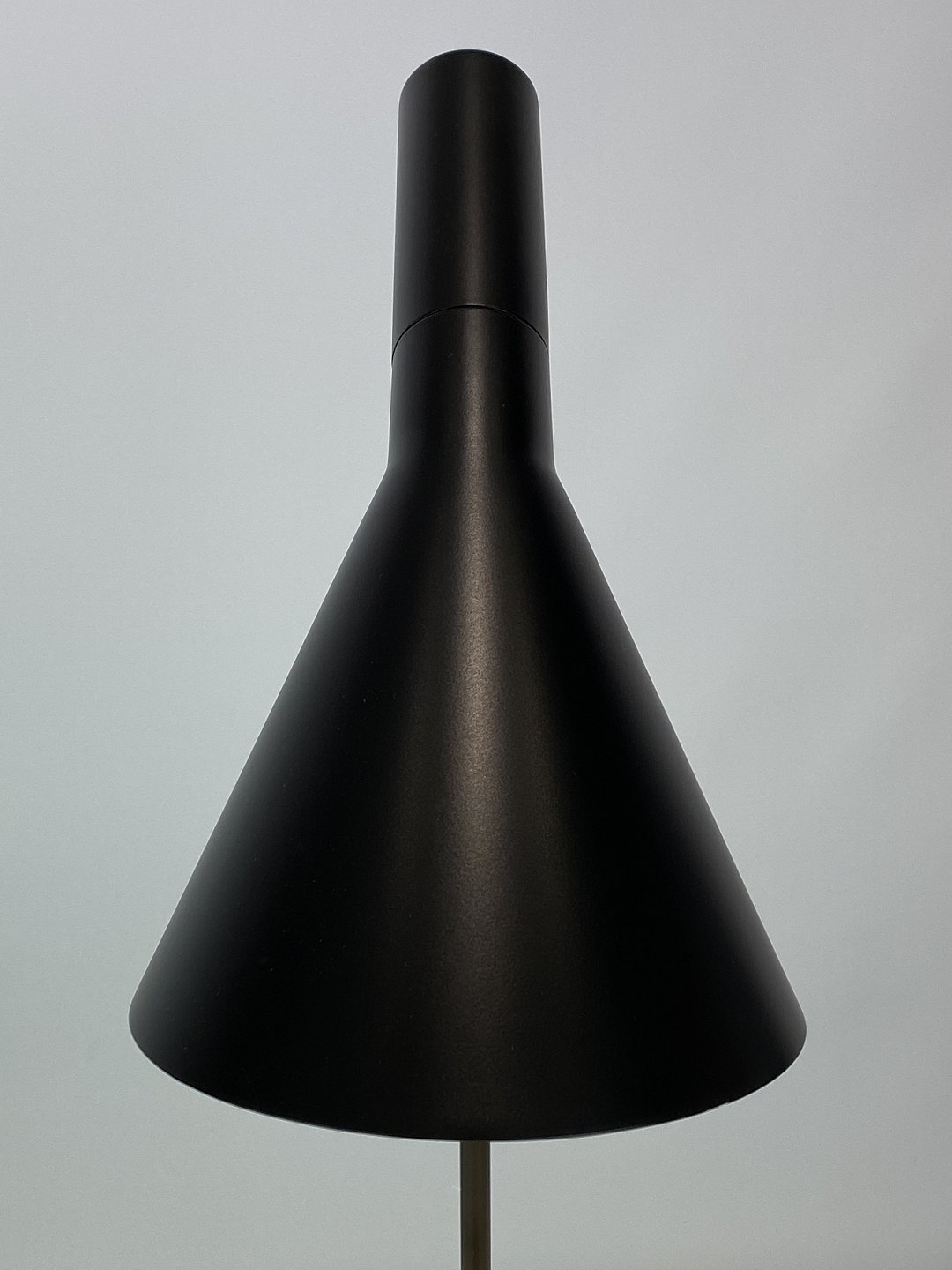 SolgtSort bordlampe designet af Arne Jacobsen og fremstillet af Louis Poulsen. Lampen blev originalt tegnet til SAS Royal Hotel i København i 1957 til hotellets designkoncept. Lampen her er den originale af stål med vipbart hoved, som udsender et direkte og retningsbestemt lys. Den er lakeret hvid på indersiden, samt sort udvendig. Lampen er i flot brugt stand.