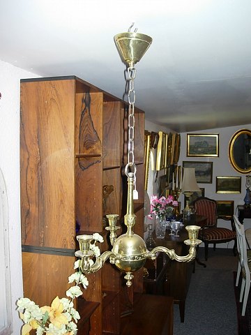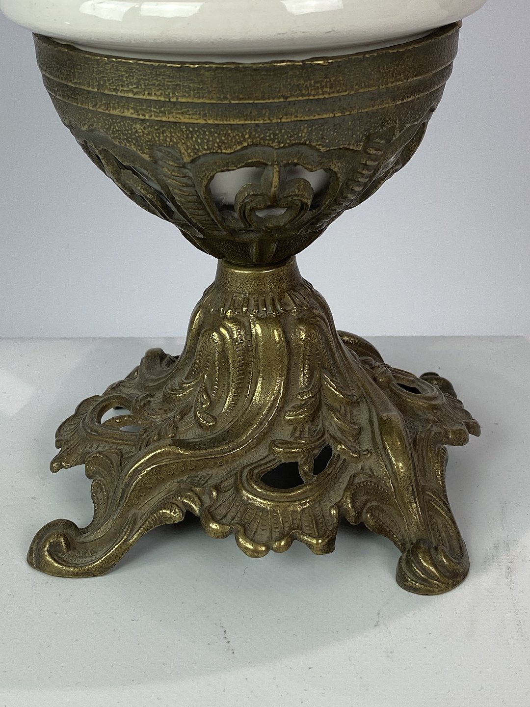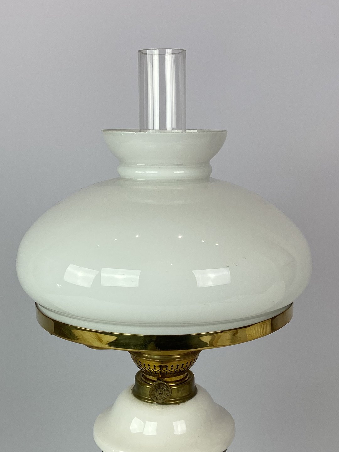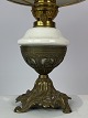 SolgtPetroleumslampe af patineret messing med skærm af hvid opal glas fra omkring 1860. Lampen er i flot antik stand.