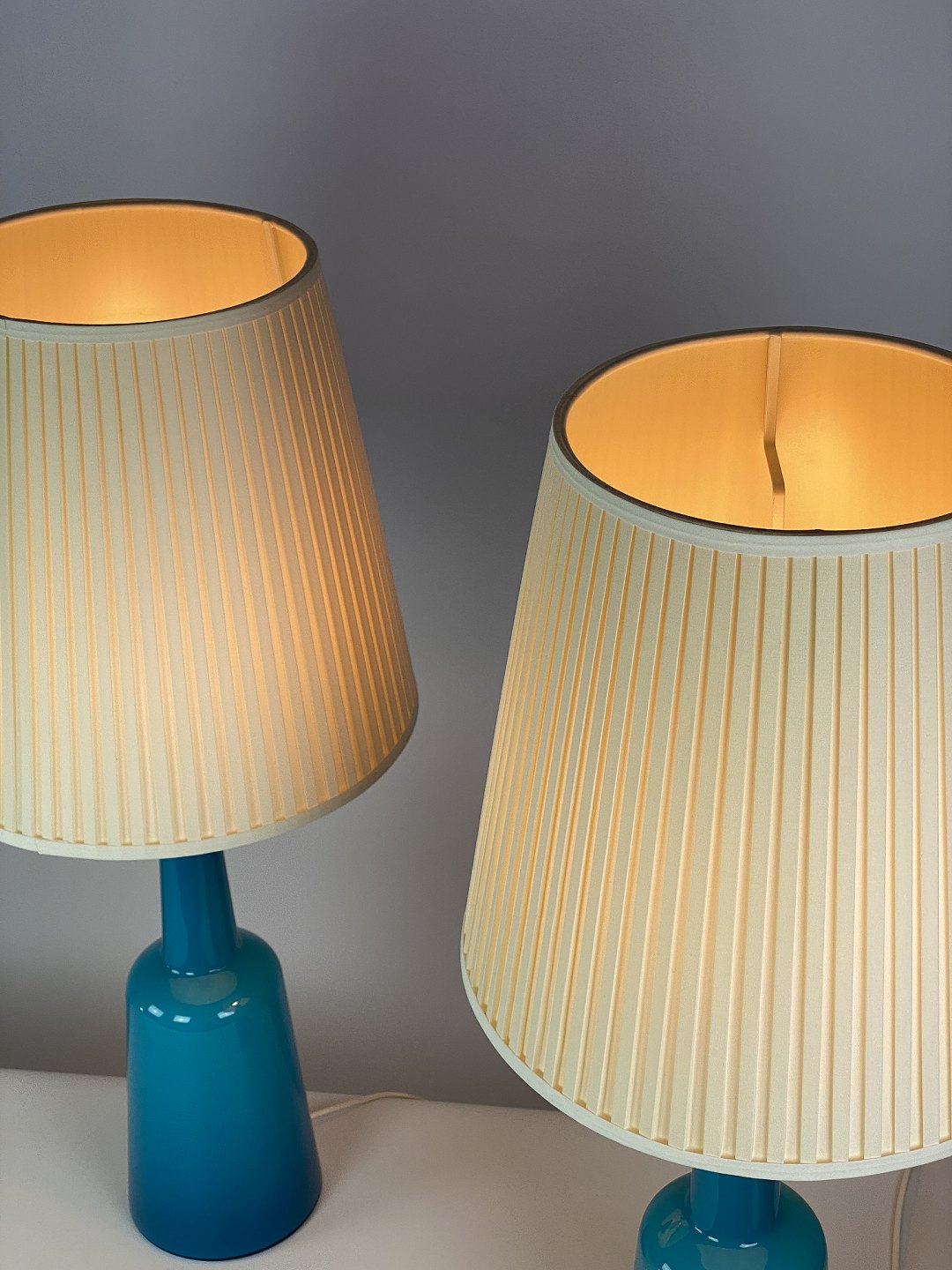 SolgtEt par bordlamper af blåt opal glas fremstillet af Kastrup Glasfabrik fra omkring 1950erne. Lamperne er i flot brugt stand.