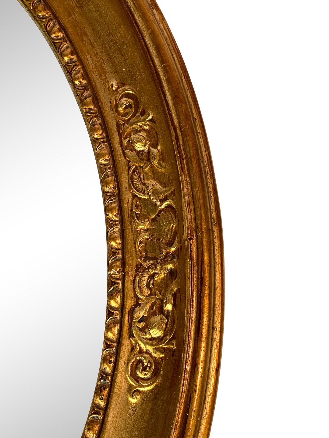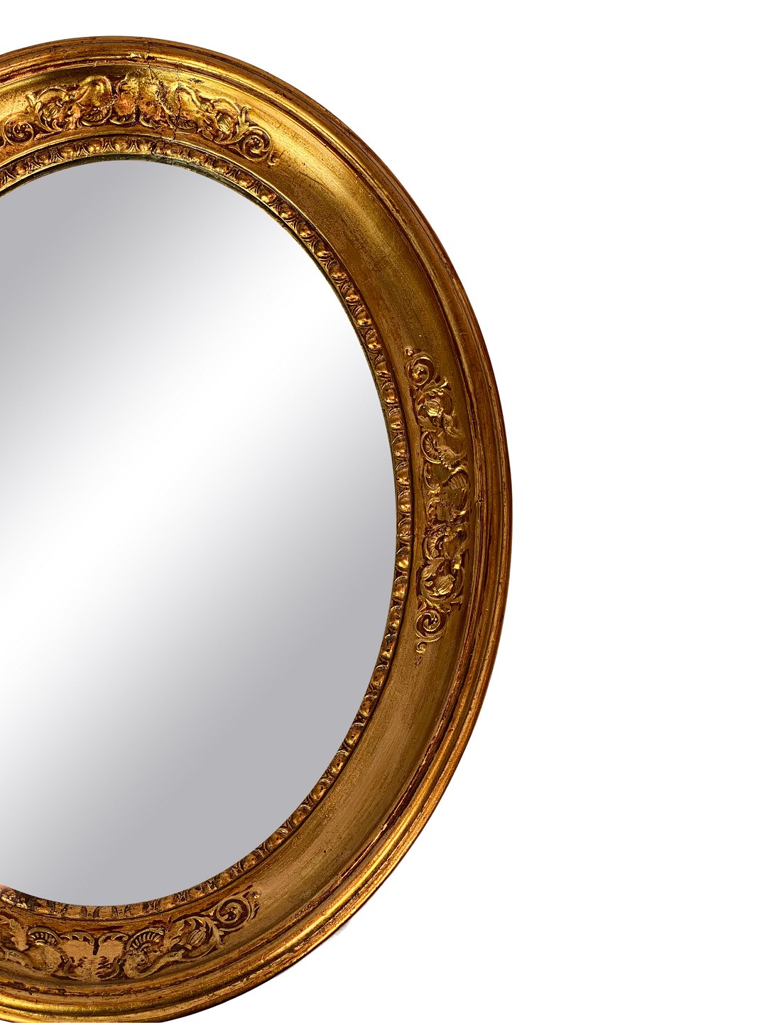 SolgtOvalt spejl med ramme af bladguld, fra 1920erne. Spejlet er i flot antik stand.