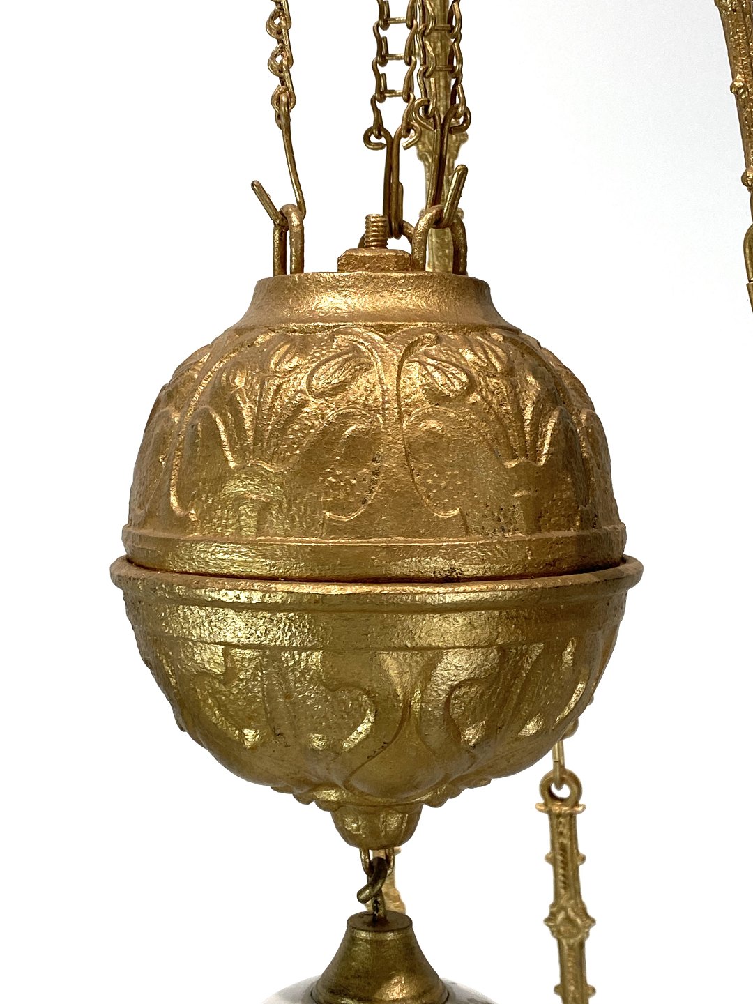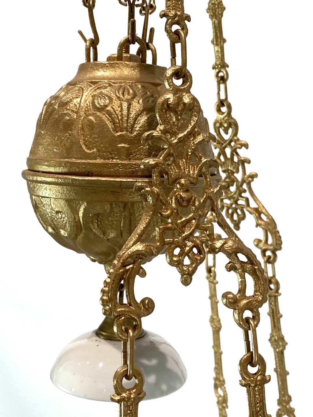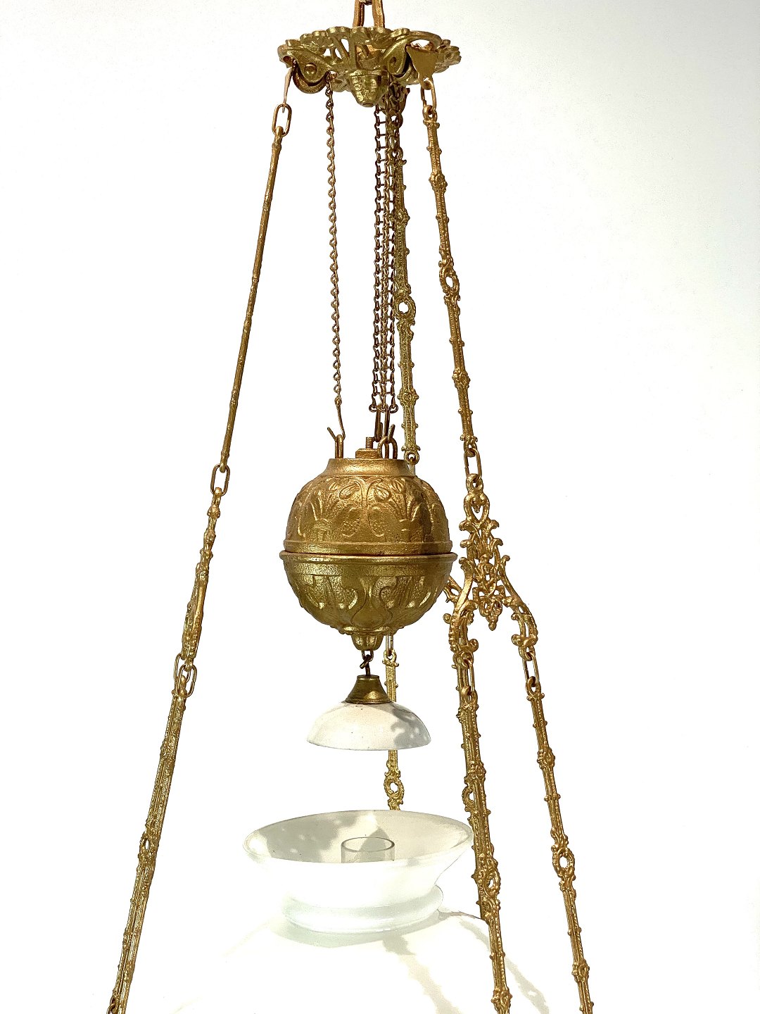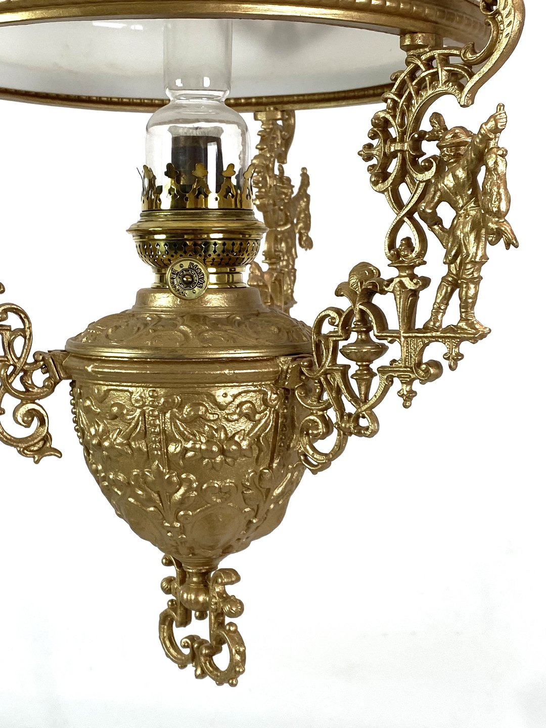 Stor petroleumslampe af patineret messing og skærm af hvid opal glass fra omkring 1880erne. Lampen er i flot antik stand.