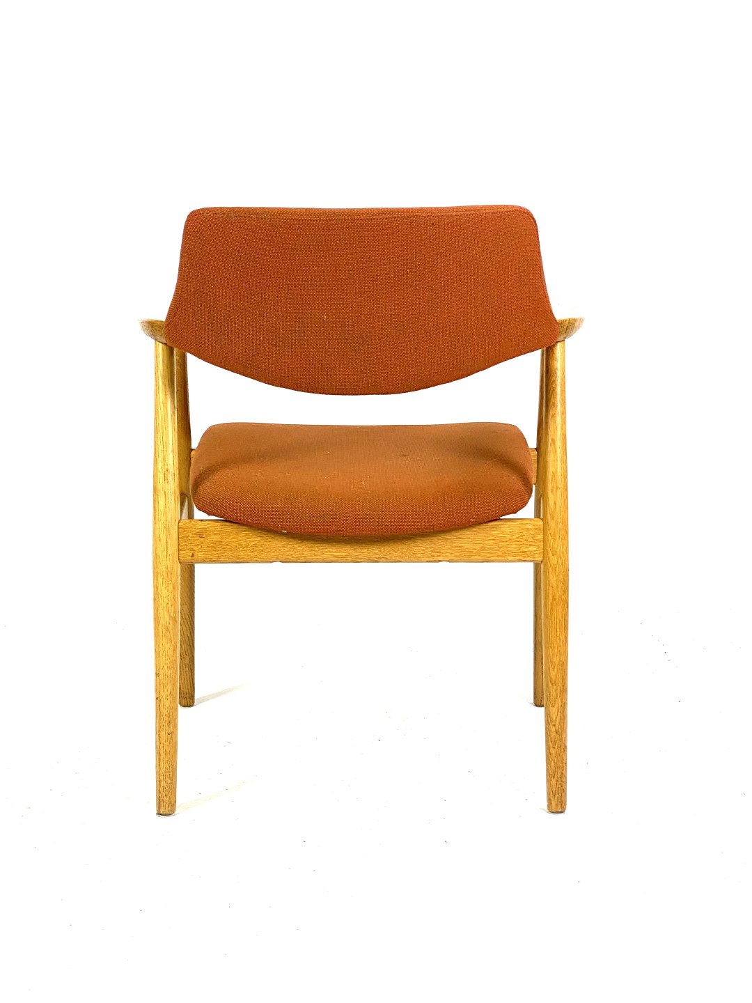 Seks armstole i eg og polstret med orange uldstof designet af Erik Kirkegaard fra 1960erne.