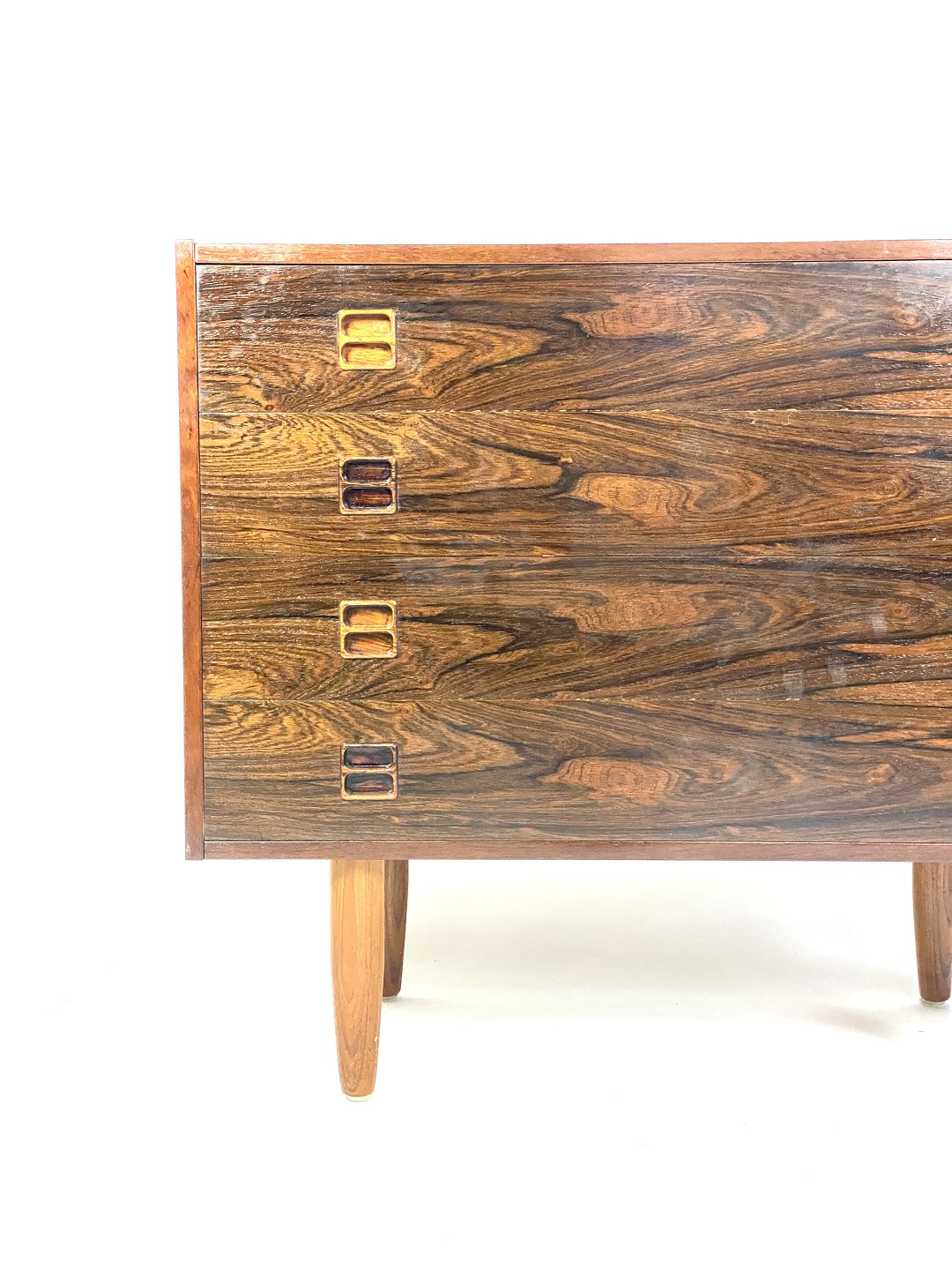 Denne kommode i palisander, designet af danske møbel arkitekter i 1960'erne, er et smukt eksempel på æstetikken fra den tid. Palisandertræet giver kommoden en varm og naturlig glød, mens dens tidløse design bringer et strejf af elegance til ethvert rum.