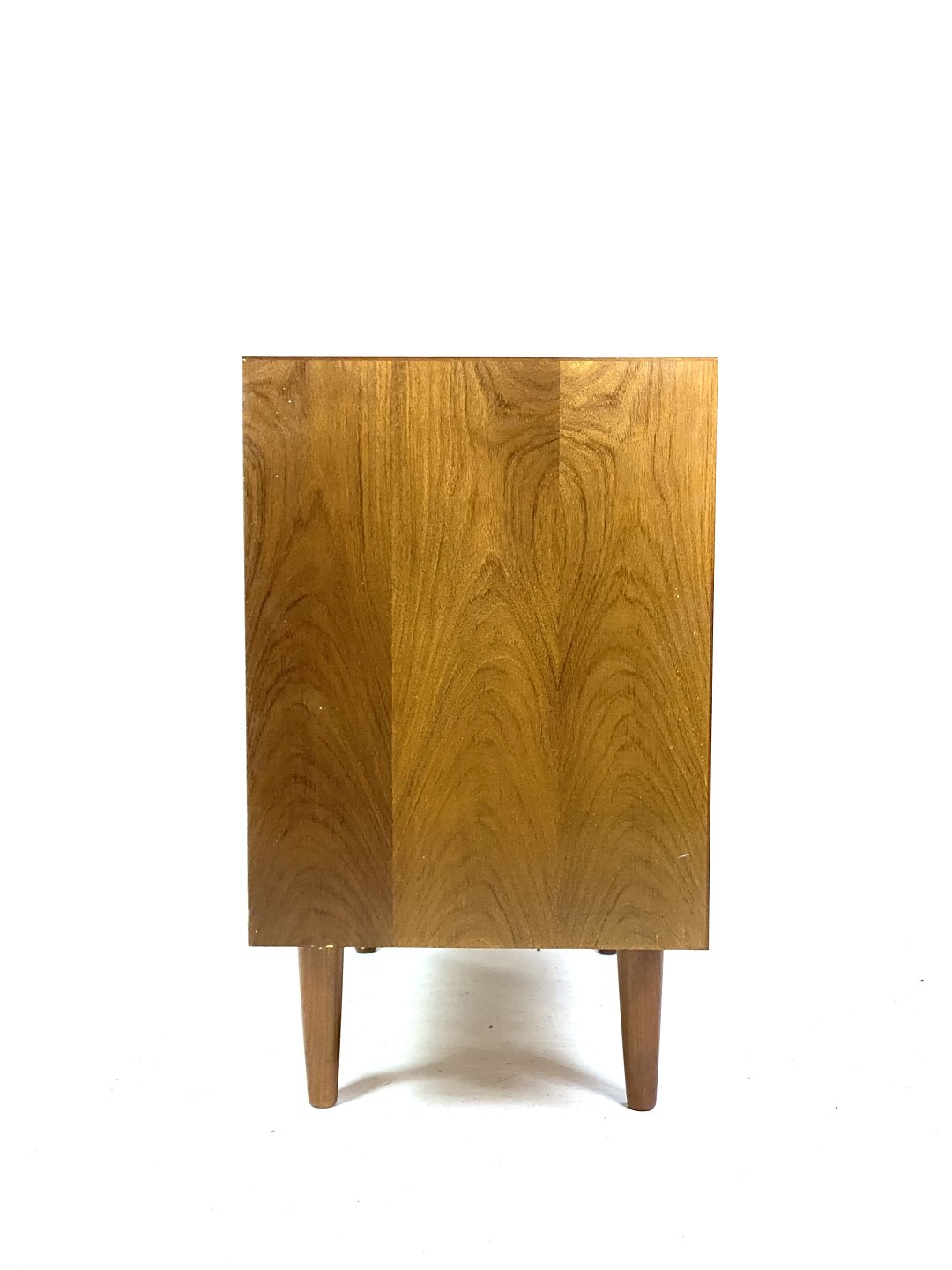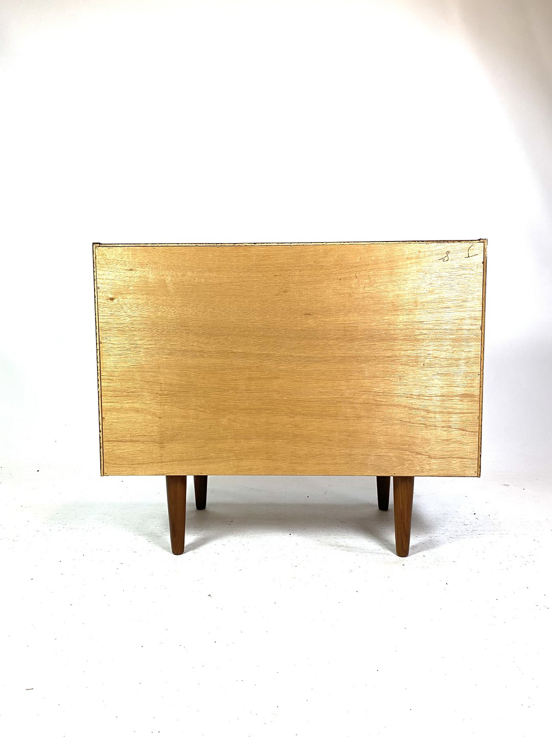 Med sine rene linjer og tidløse æstetik er denne kommode ikke kun et funktionelt møbelstykke, men også et smukt dekorativt element til ethvert rum. Den vil tilføje karakter og elegance til dit hjem med sit autentiske udtryk af møbeldesign fra 1960'erne.