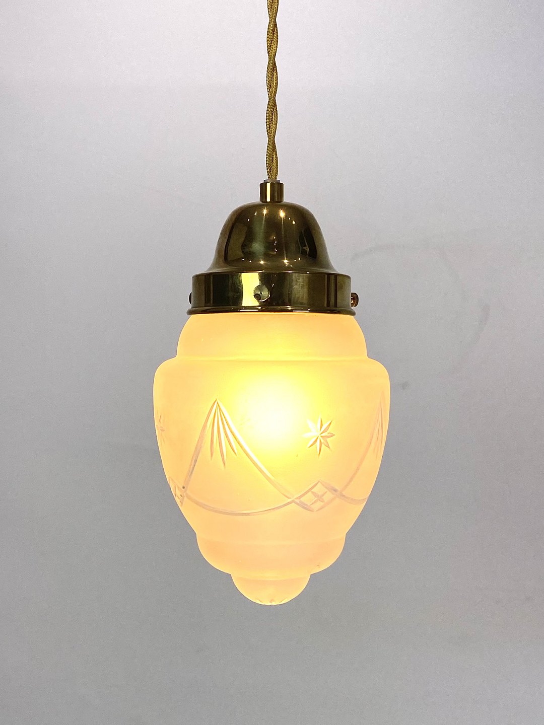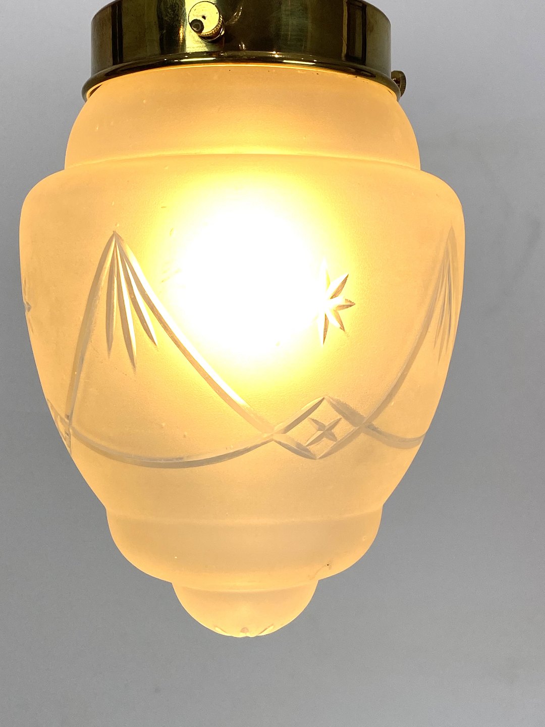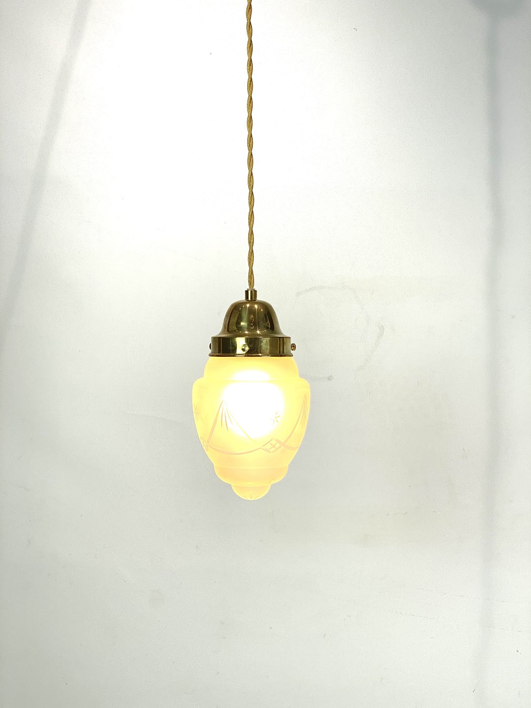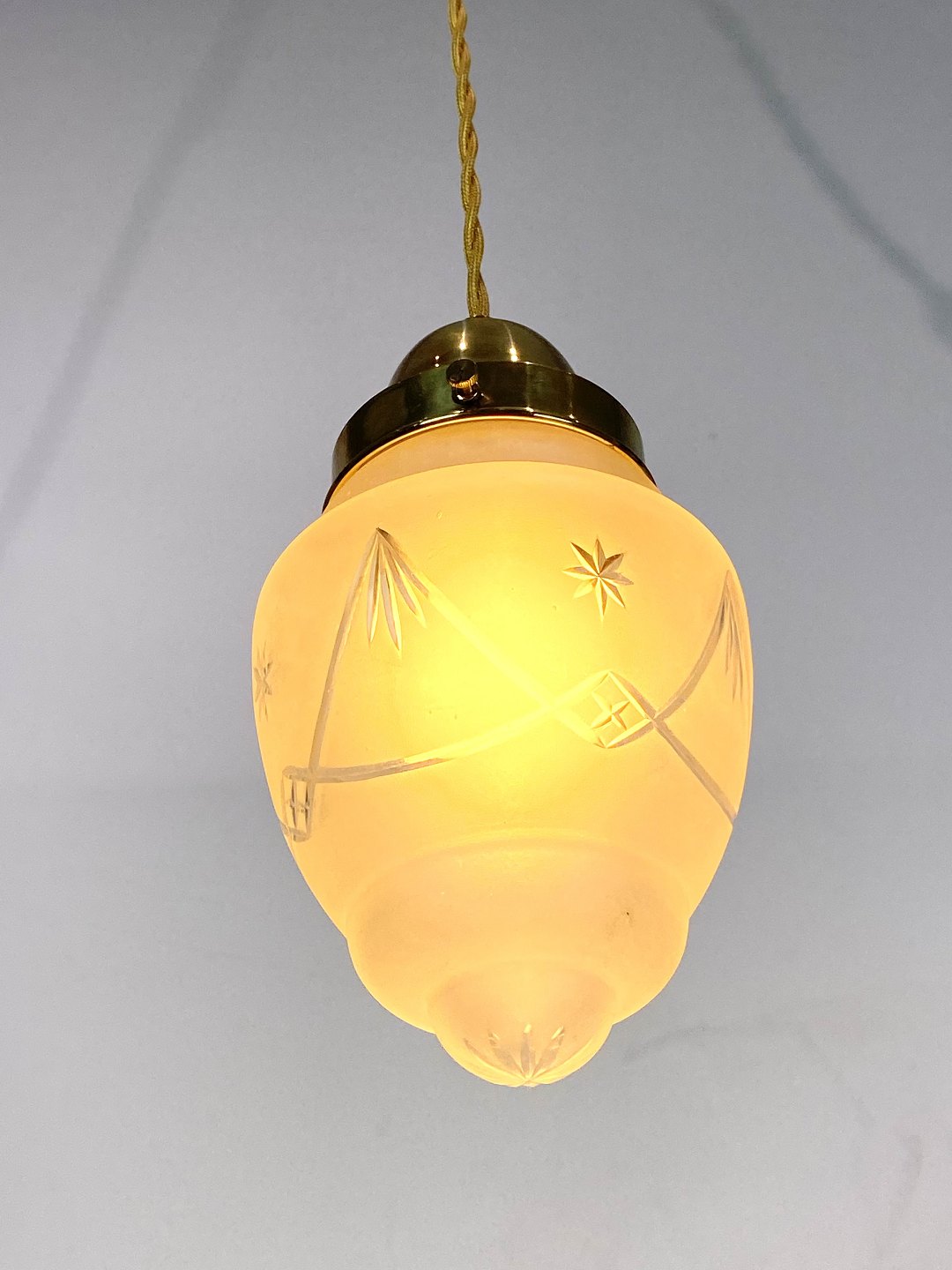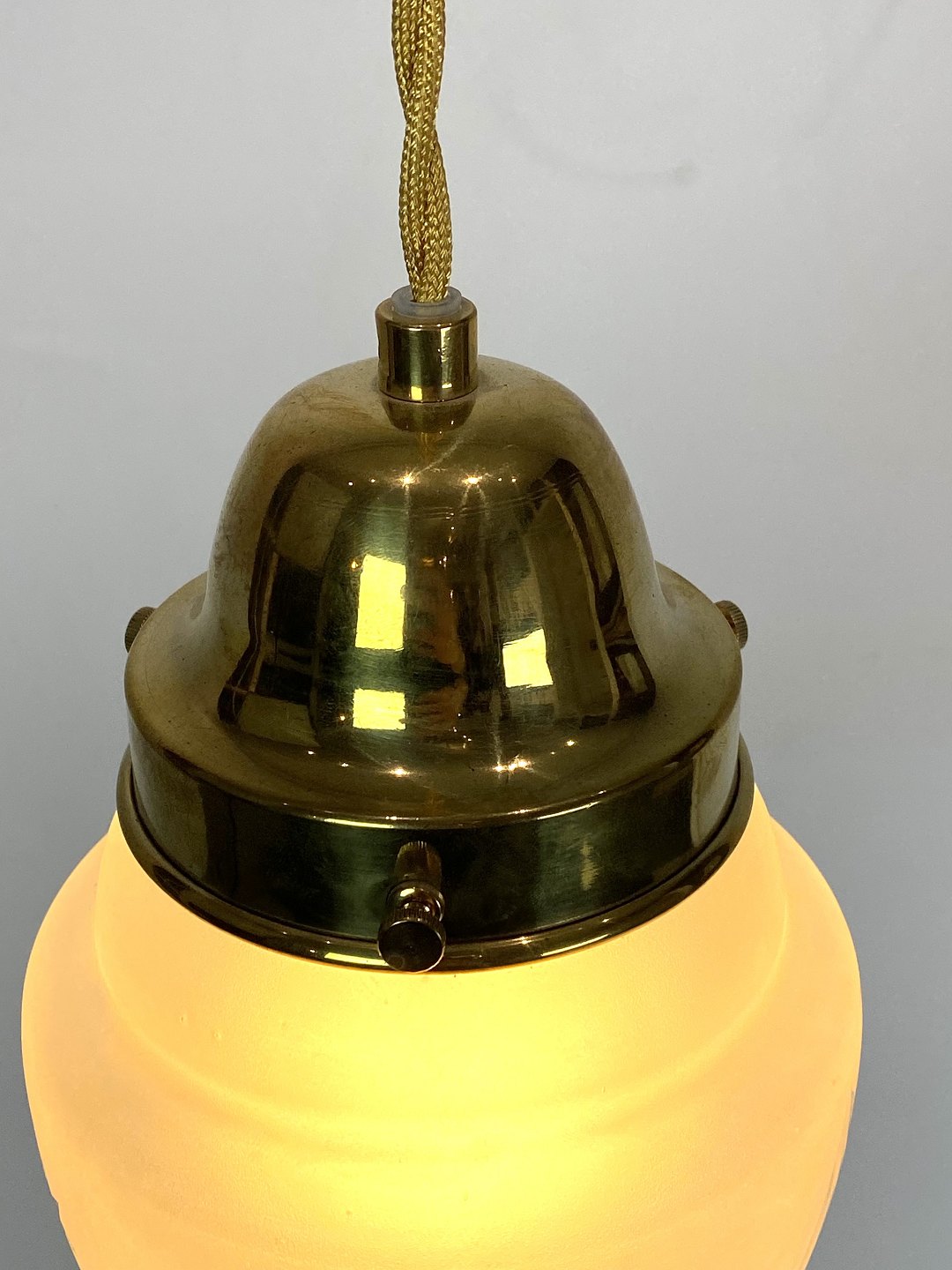 Pendel i jugend stil af messing og med glas fra Fyns Glasværk.