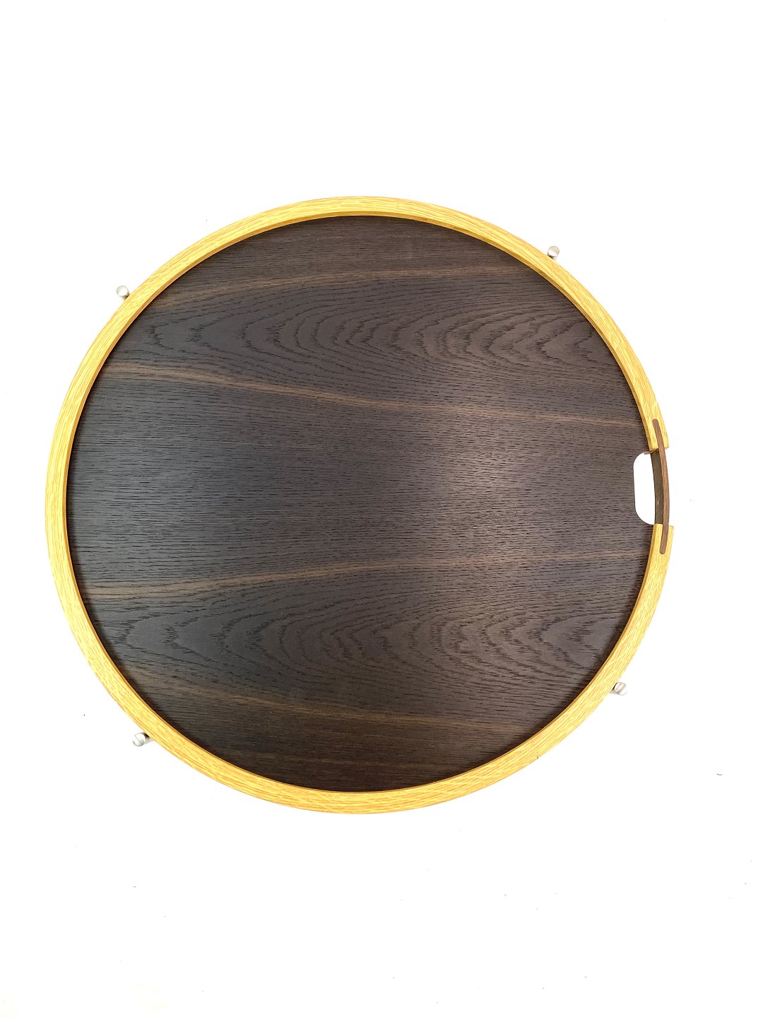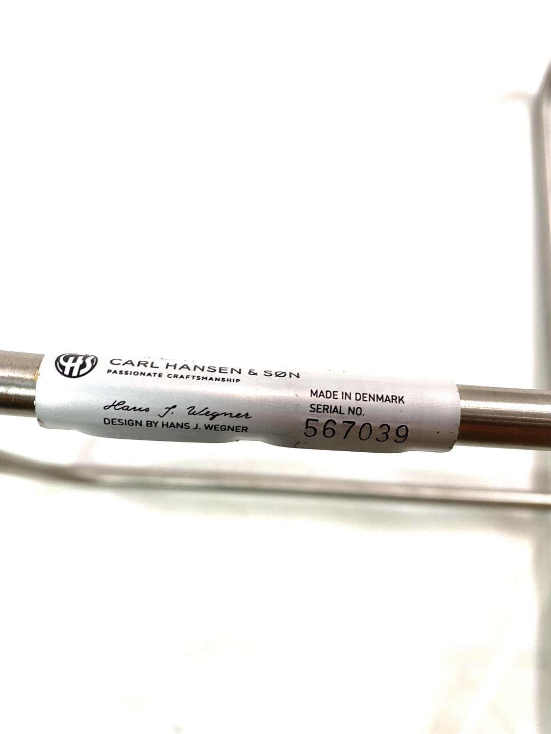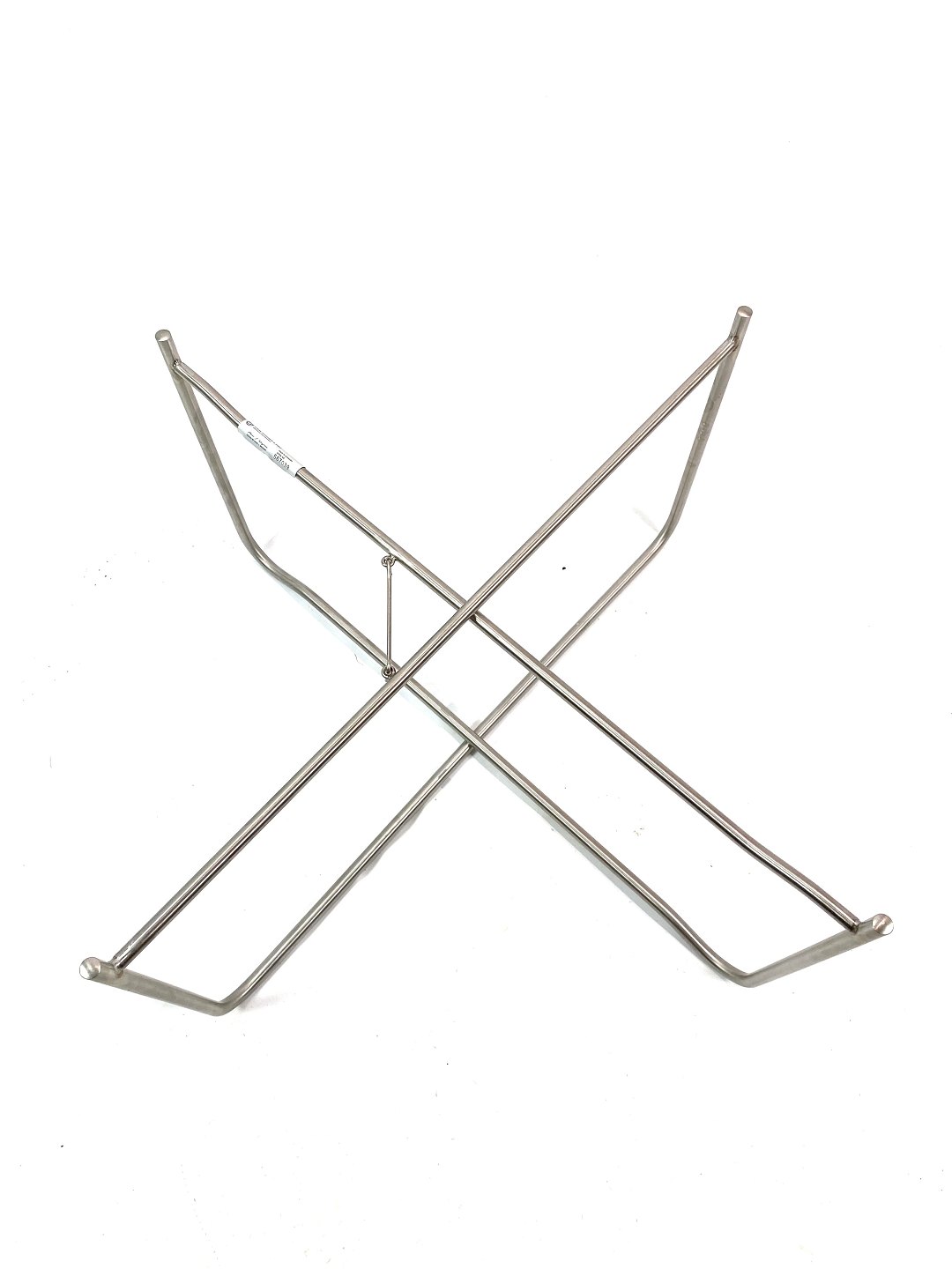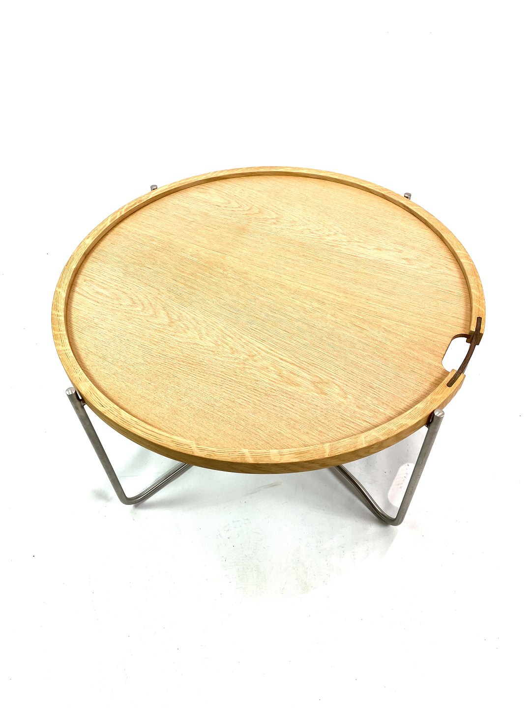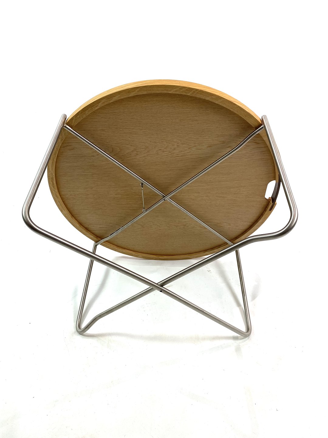 SolgtLille Bakke / Sofabord fra Carl Hansen & Søn, designet af Hans J. Wegner. Bakkebordet består af 2 dele. Et sammenklappeligt stel og en bakke. Stellet er af rustfrit stål og bordpladen er af valnød finer. Træsorten er olieret eg.