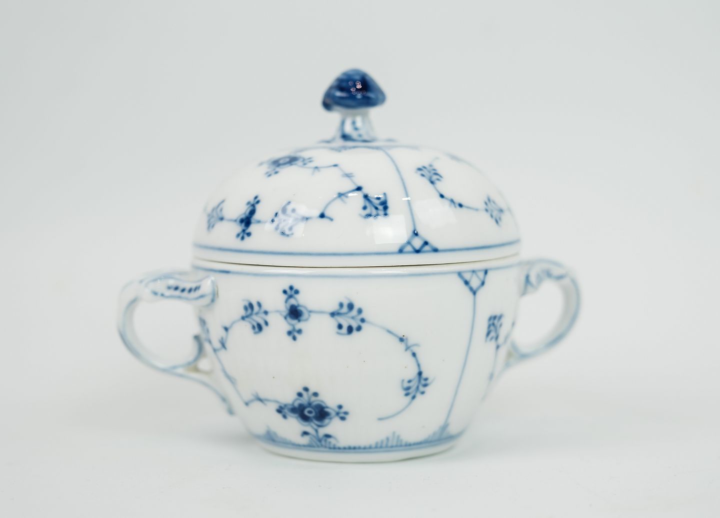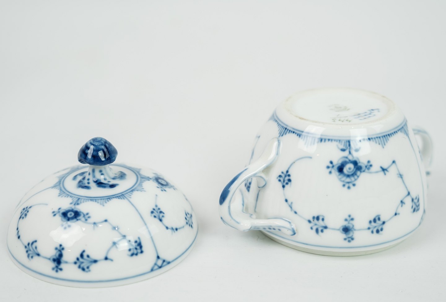 Royal Copenhagen, kgl. musselmalet riflet sukkerskål af porcelæn med låg nr. 244. 5000m2 udstilling