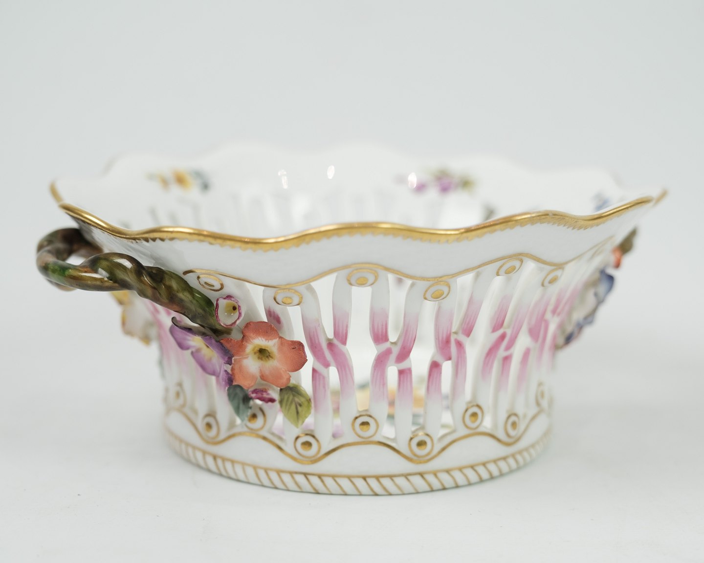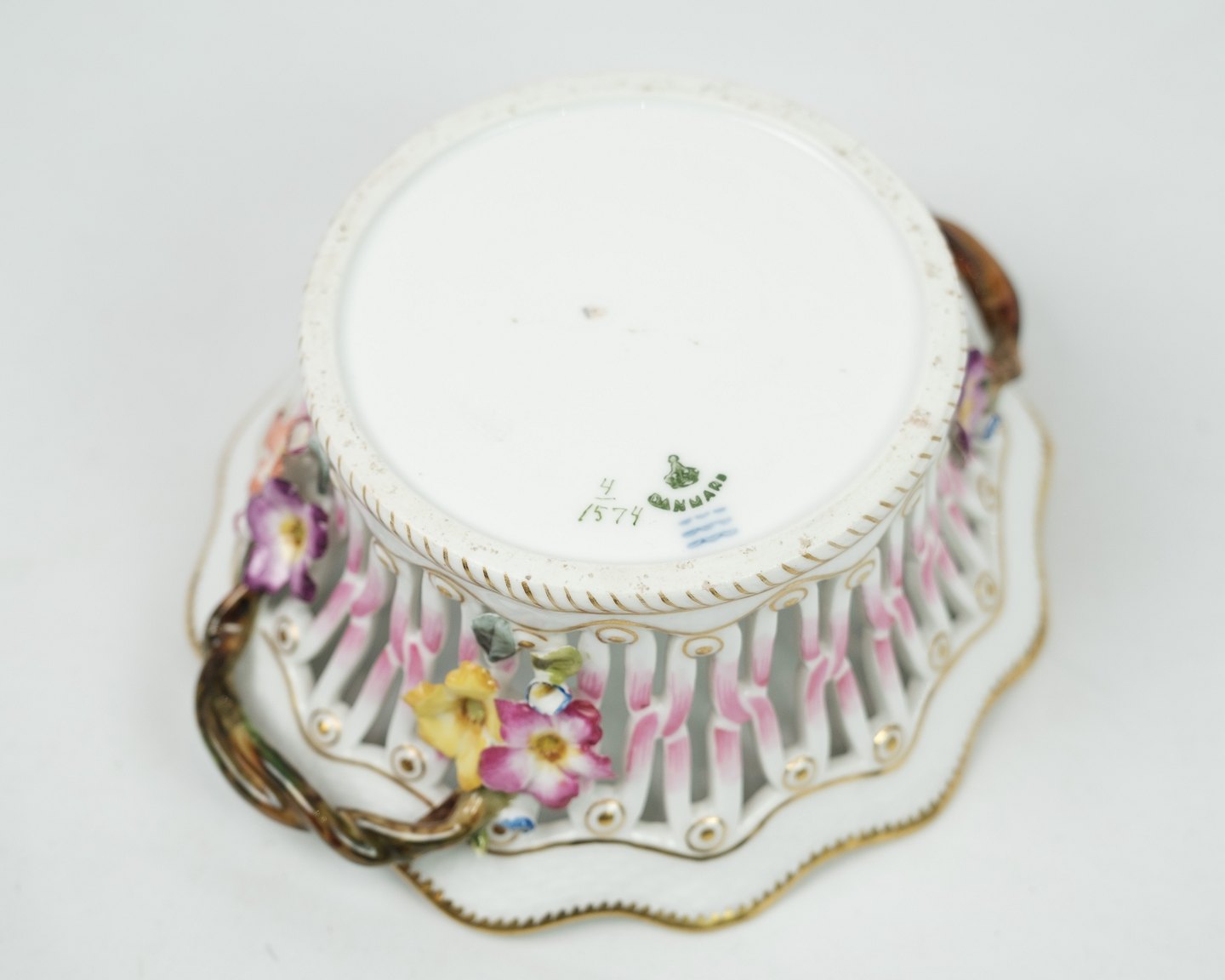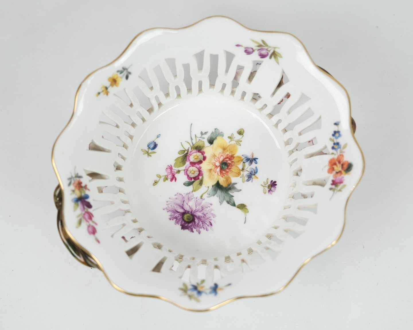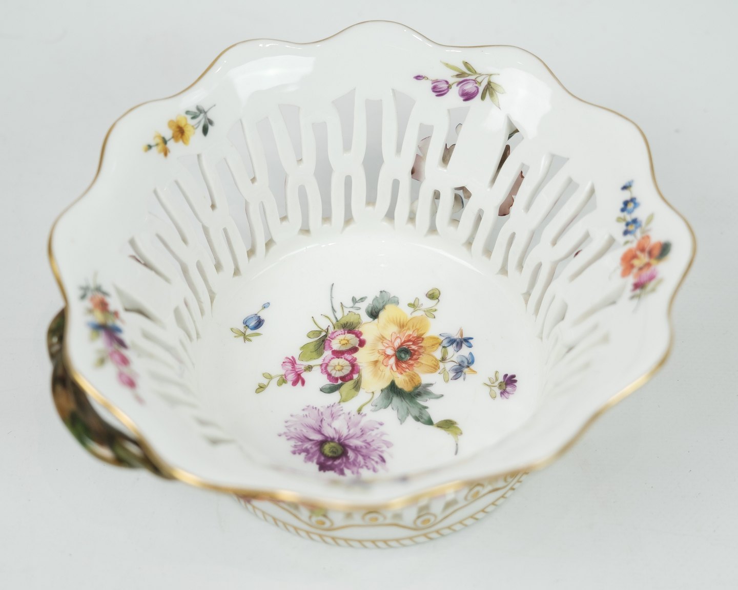 Royal Copenhagen kongelig skål i gennembrudt med flotte påsatte blomster i mønstret saksisk blomst nr. 1574. Denne varer er utrolig smuk og har ingen skader. Den er før 1923 og meget sjælden