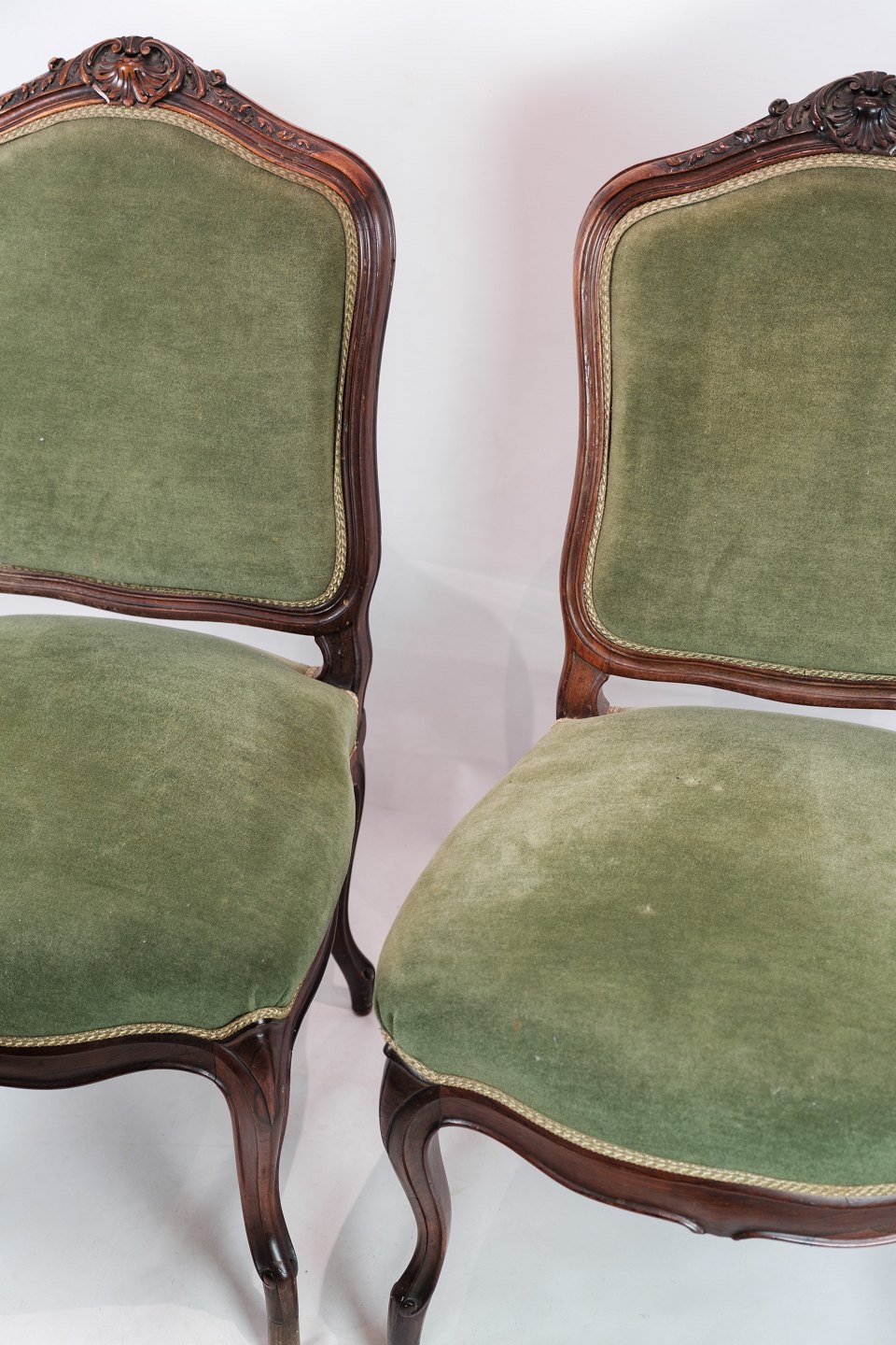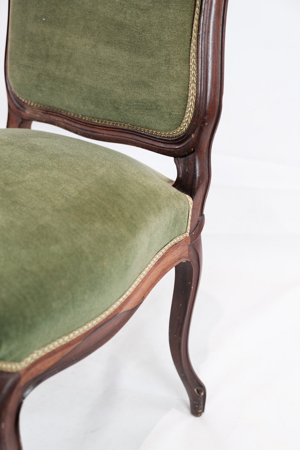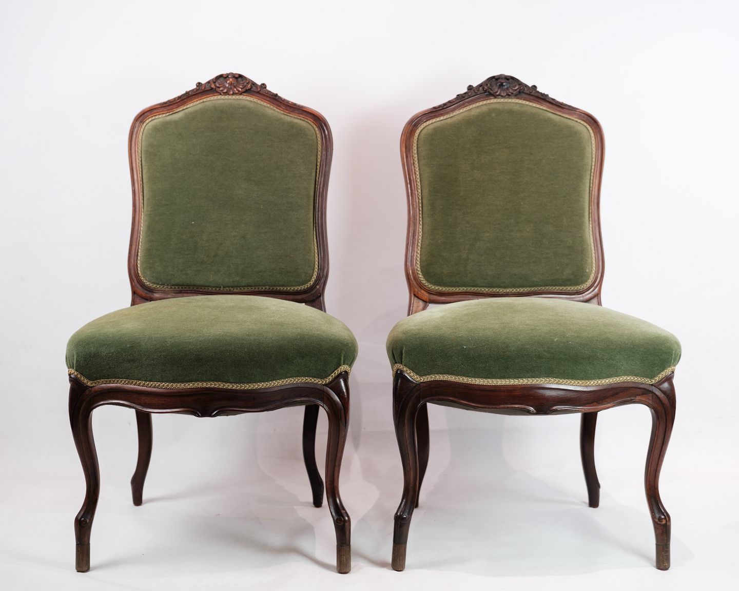 SolgtEt par salon stole ny rococo stole med grønt velour stof i mahogni fra omkring år 1860'erne. Begge står i fin brugt stand.