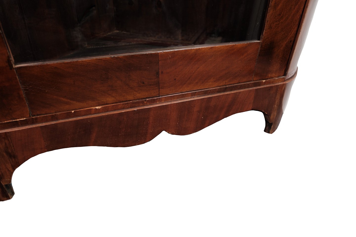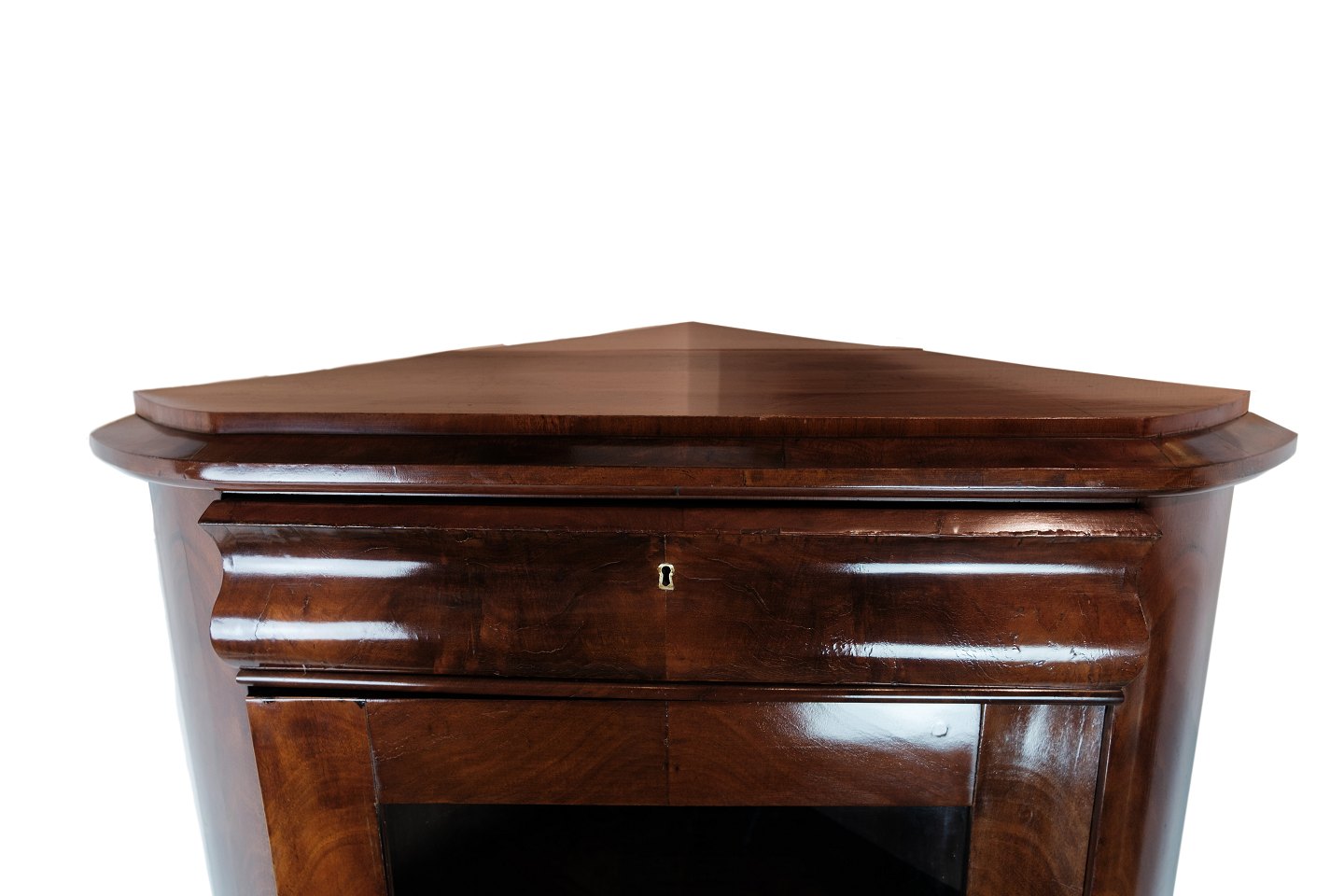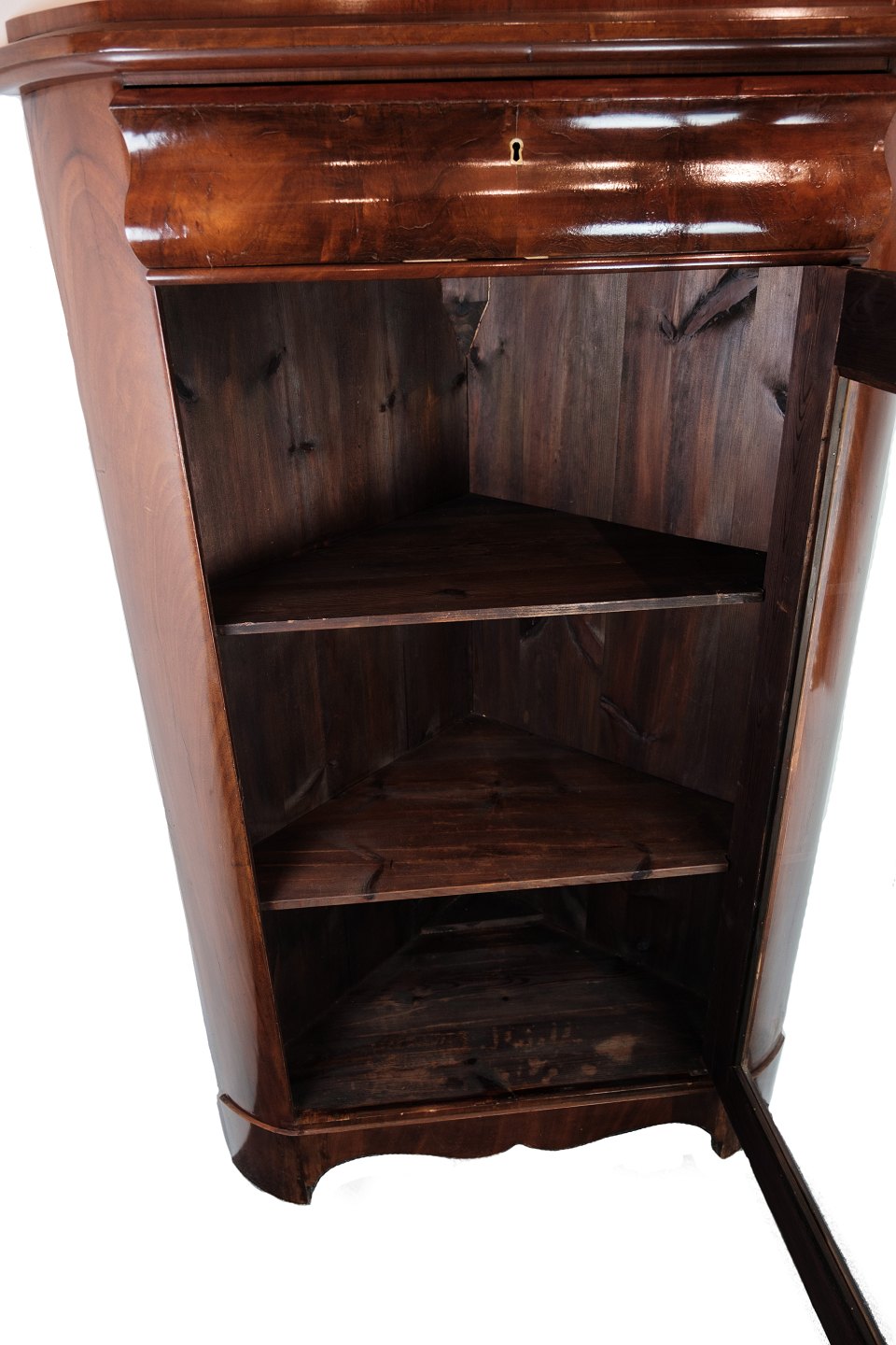 Udført i mahogni, en træsort kendt for sin varme farve og rige mønstre, har dette hjørneskab en fortryllende udstråling. Den omhyggeligt udformede ramme og dekorative elementer tilføjer en luksuriøs følelse og klassisk elegance til ethvert rum.