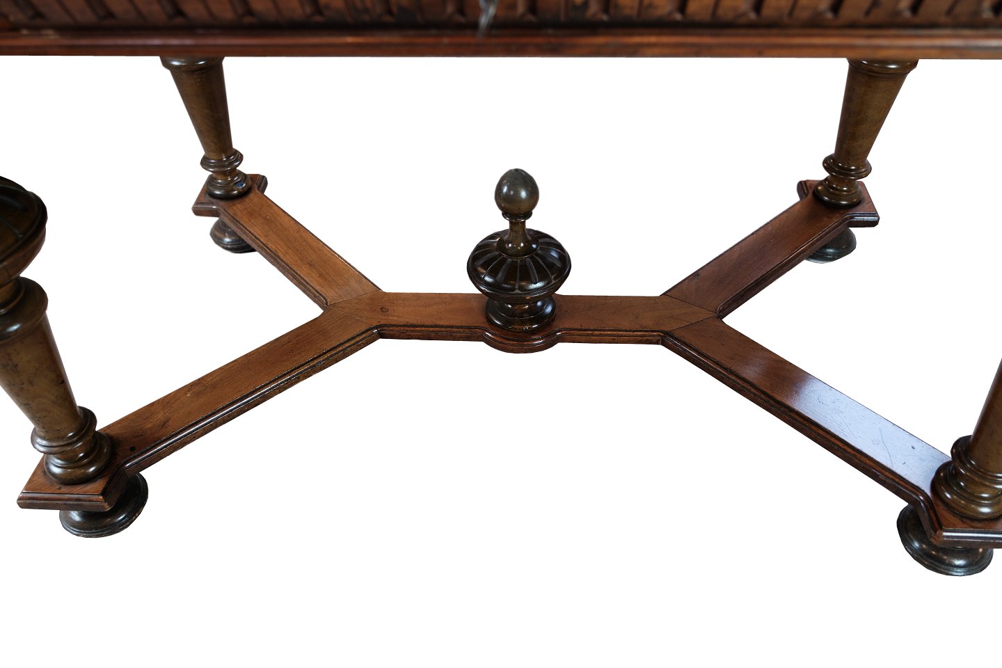 SolgtAnretterbord / skrivebord i valnød fra Danmark dekoreret med udskæringer fra år 1880'erne. Istandsat.