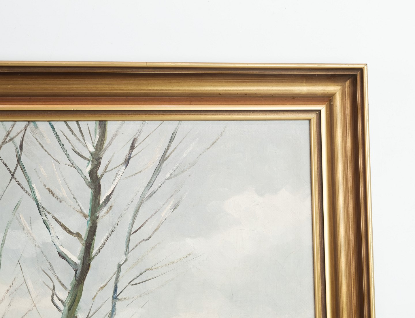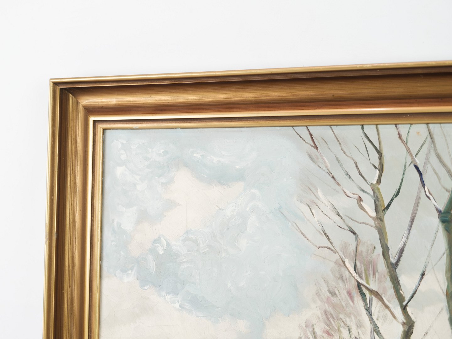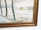 Oliemaleri på lærredet med motiv af natur med sne og bondehuse fra omkring år 1930'erne.