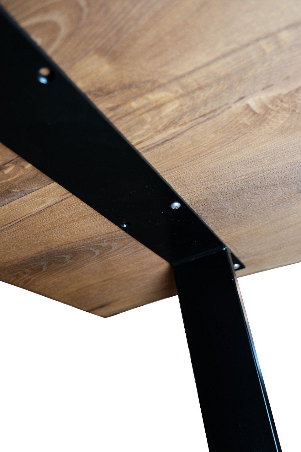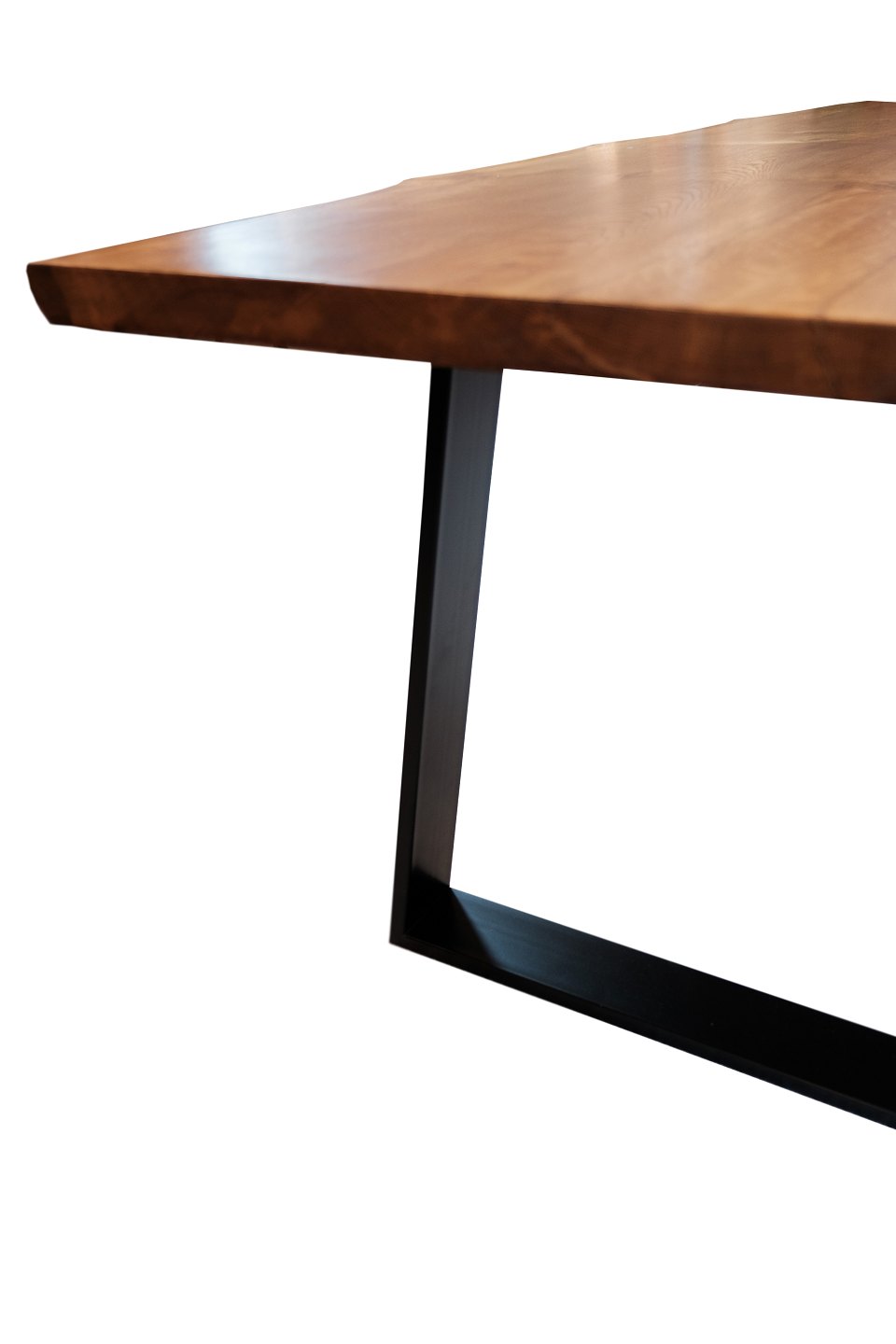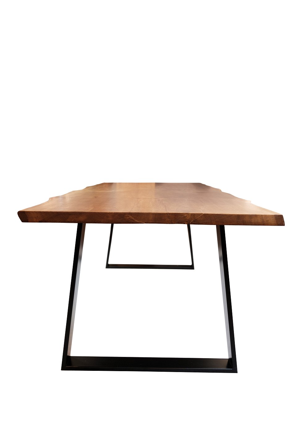 Kontakt os vedrørende prisPlankebord af egetræ og rammestel af sort metal, af 2 massive planker med naturkanter. Bordet er af eget design og ny fremstillet.