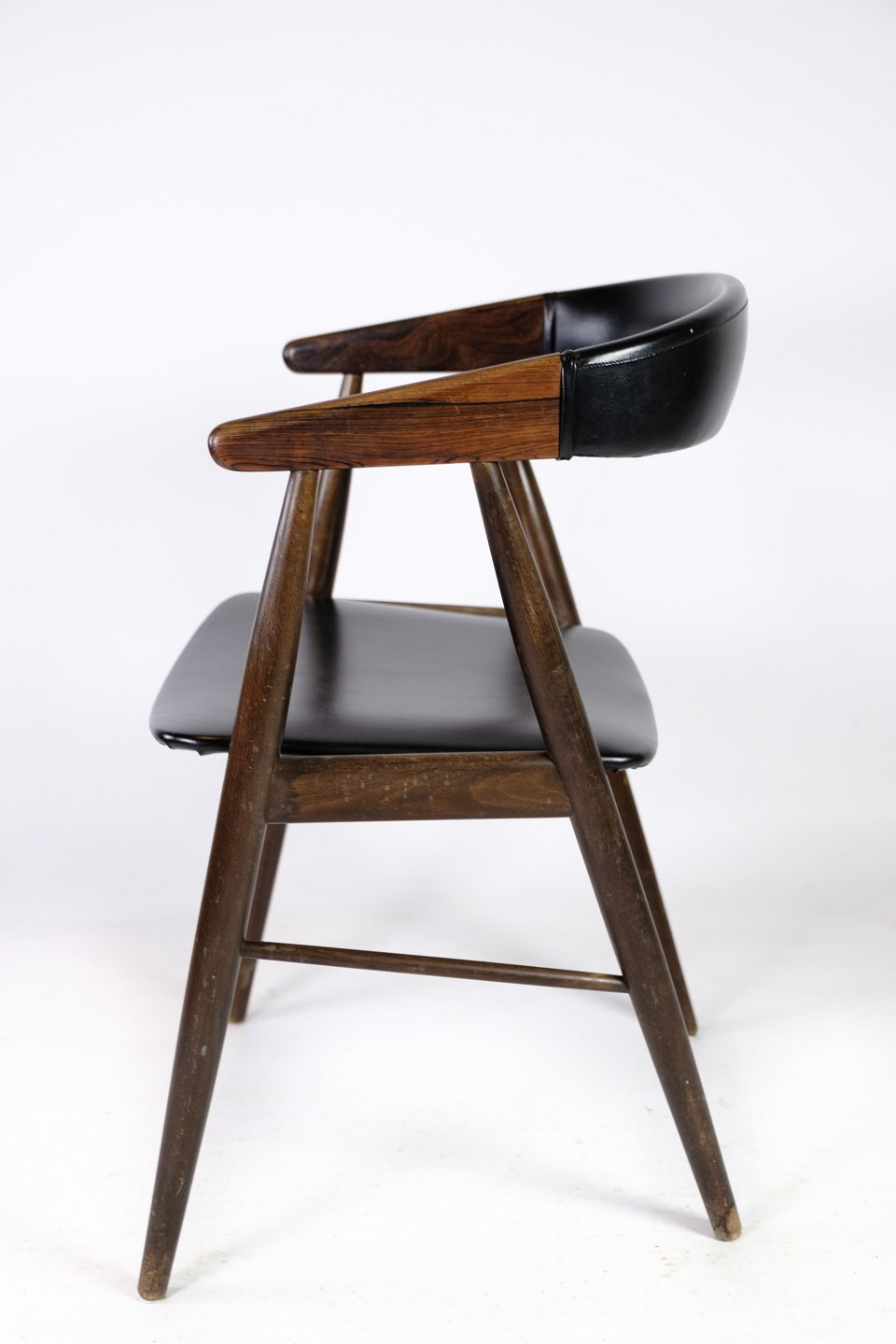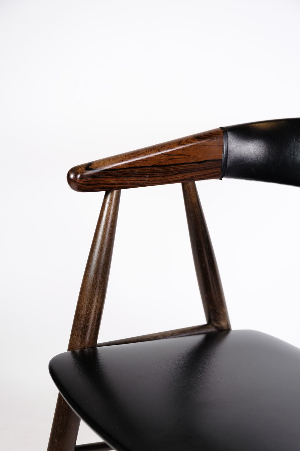SolgtSæt af fire stole i palisander i sort læder tegnet af Aksel Bender og Ejnar Larsen formgivet i 1960'erne. De står alle i meget god vintage stand. Sælges kun som et sæt på fire