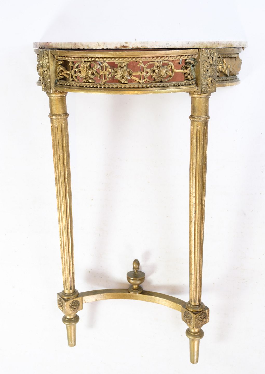Forgyldt konsolbord fra Danmark med hvid marmor plade fra perioden Louis Seize fra omkring år 1790'erne. Et konsolbord af meget høj kvalitet med meget historie.