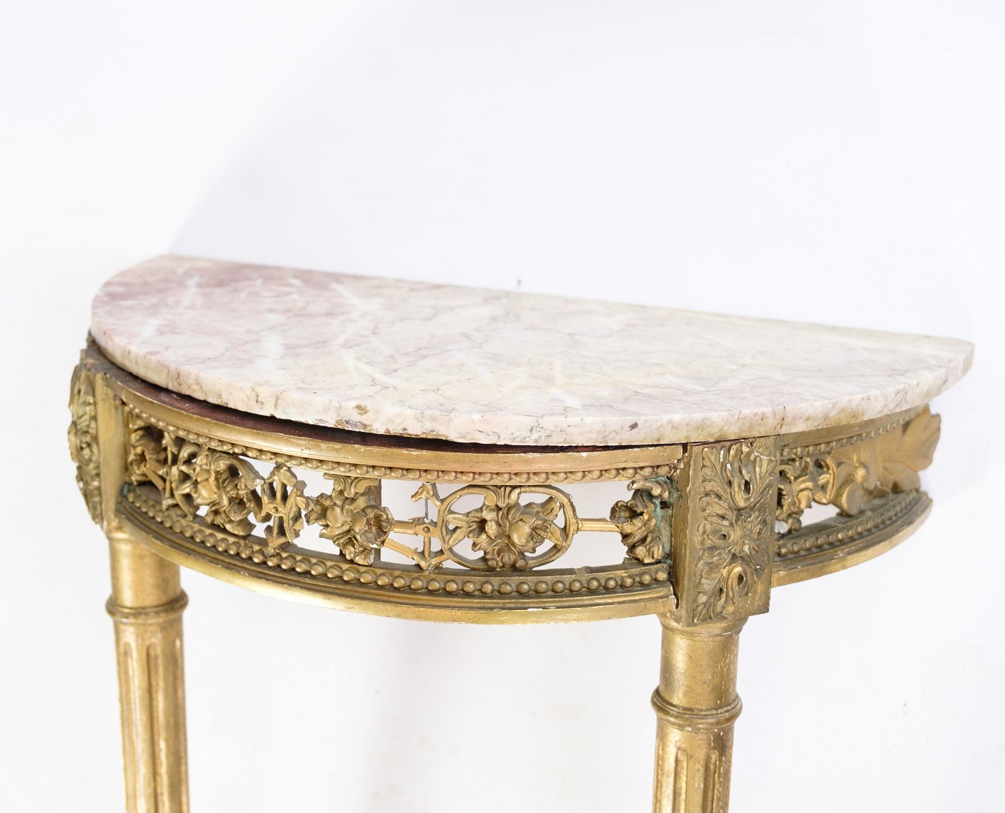 Forgyldt konsolbord fra Danmark med hvid marmor plade fra perioden Louis Seize fra omkring år 1790'erne.