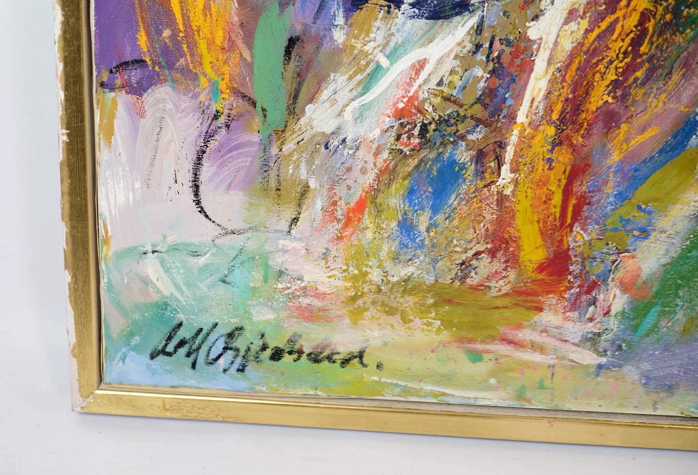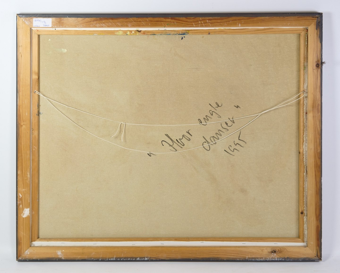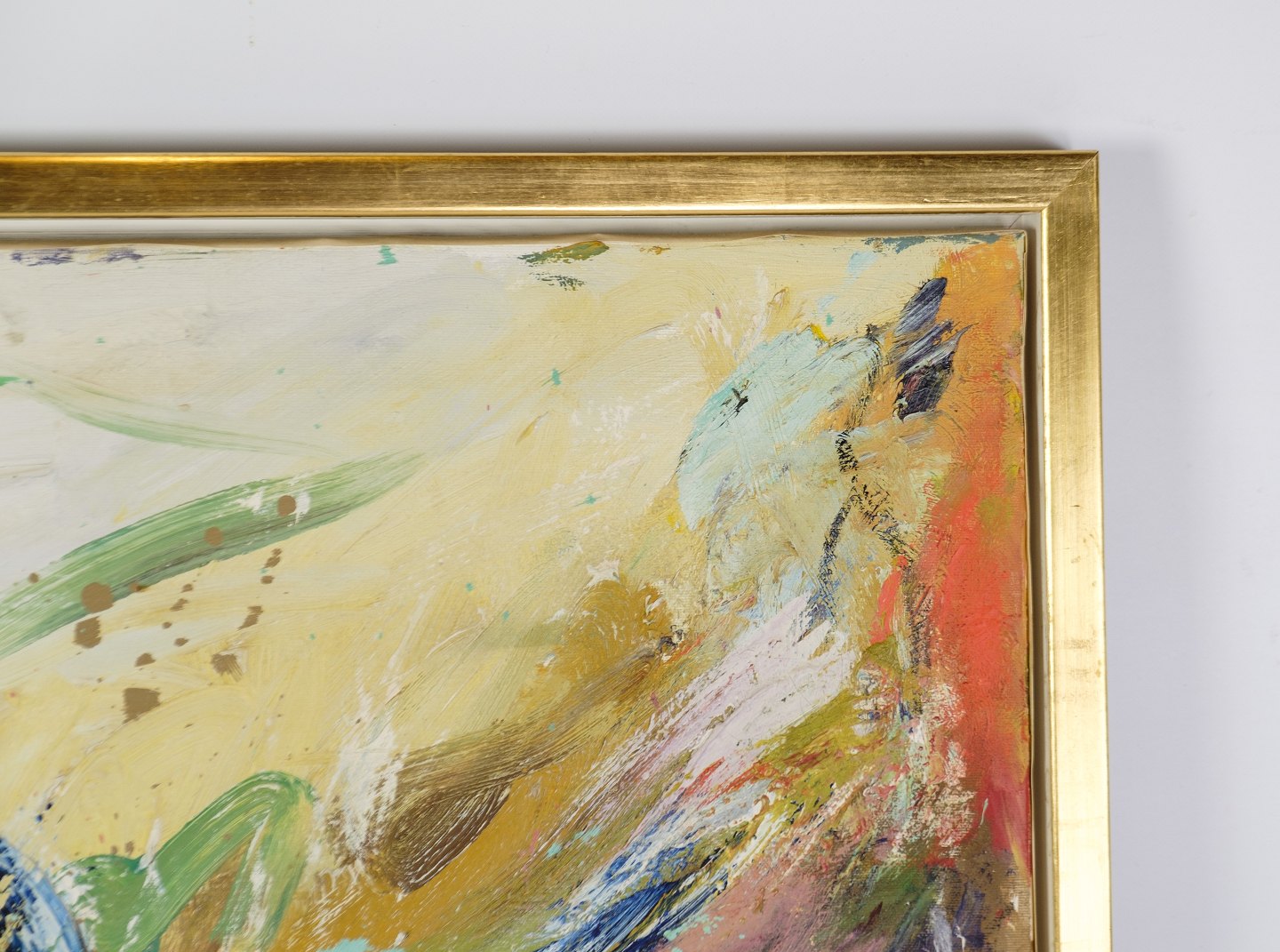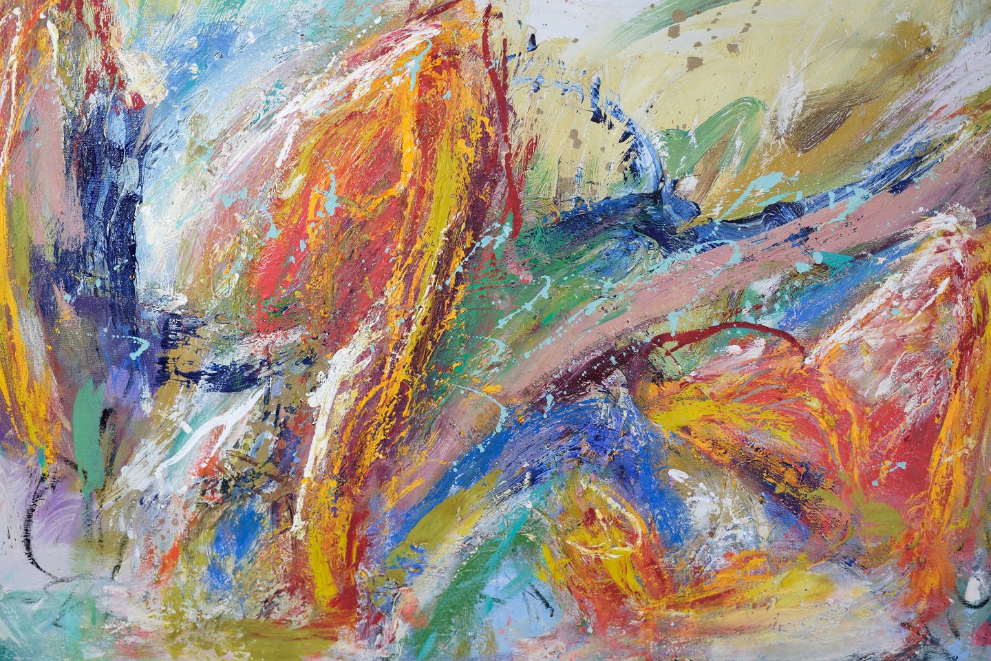 SolgtFarverigt olie maleri af kunstneren Leif Bjerregaard fra 1995 med titel "Hvor engle danser".