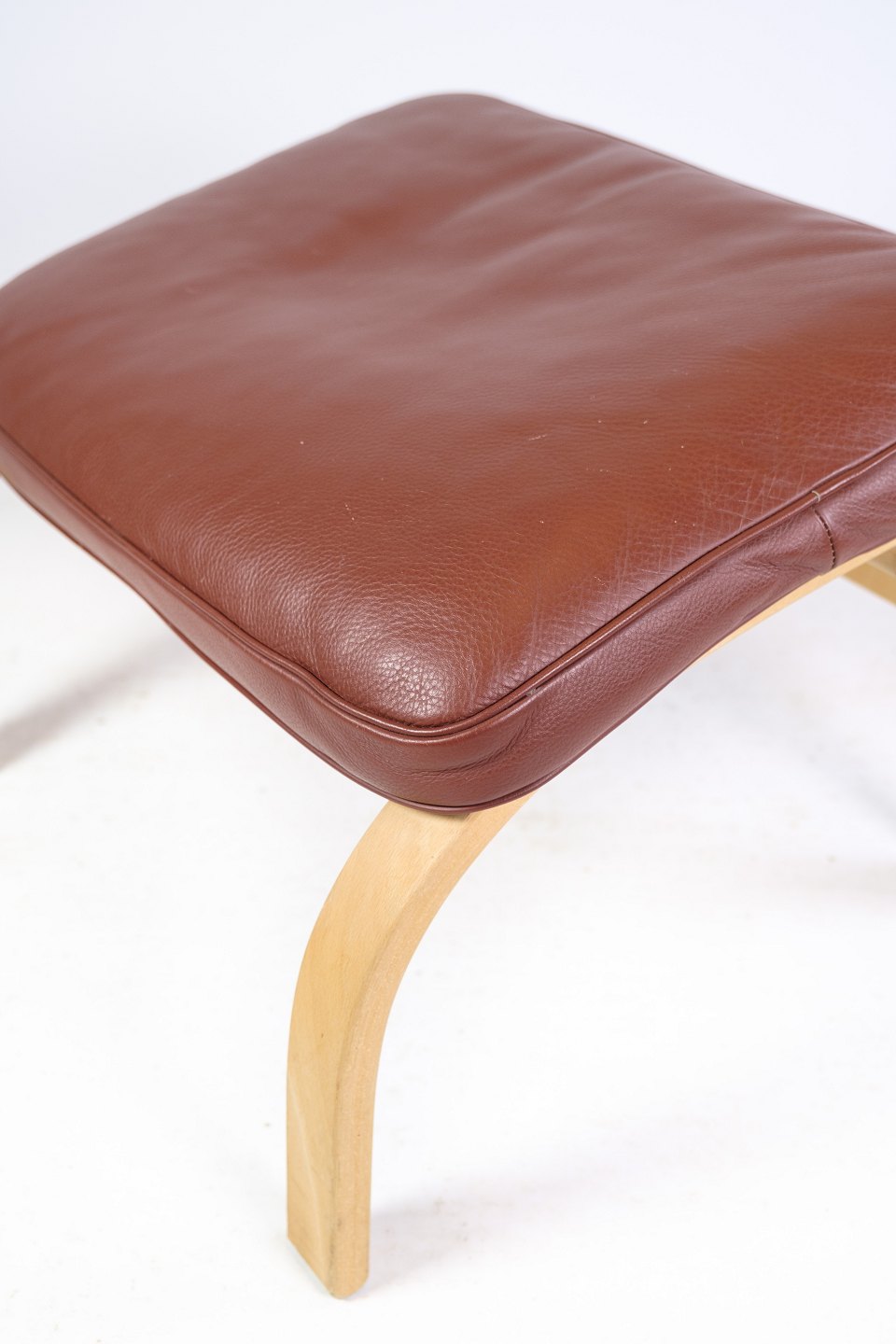 Den brune læderhynde i cognacfarve tilføjer varme og komfort til skamlen og er med til at skabe en indbydende atmosfære. Læderet er af høj kvalitet og vil med tiden udvikle en smuk patina, der kun tilføjer til skønheden i møblet.