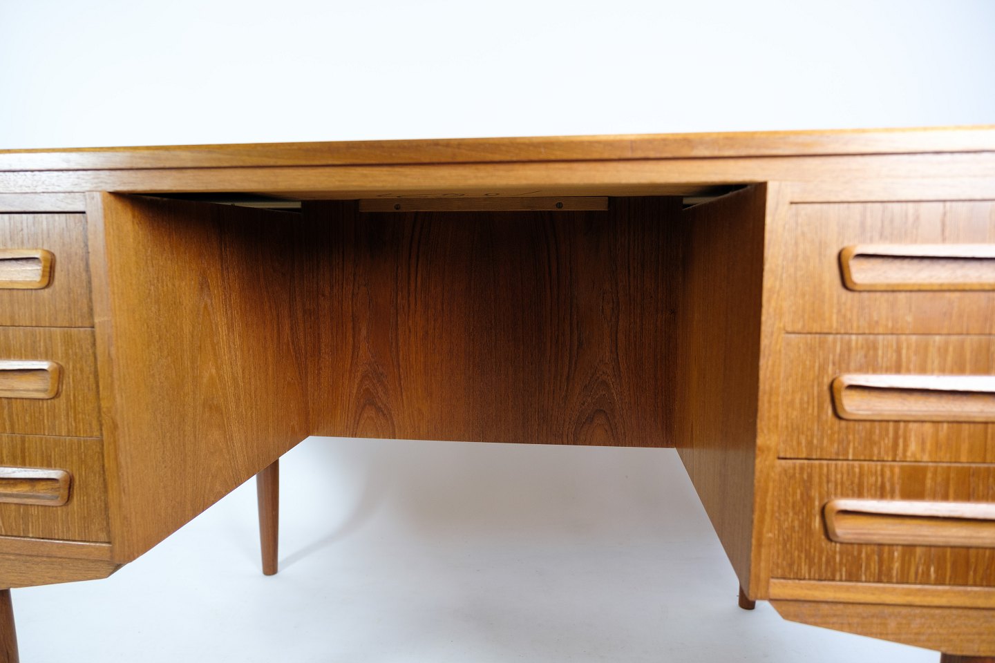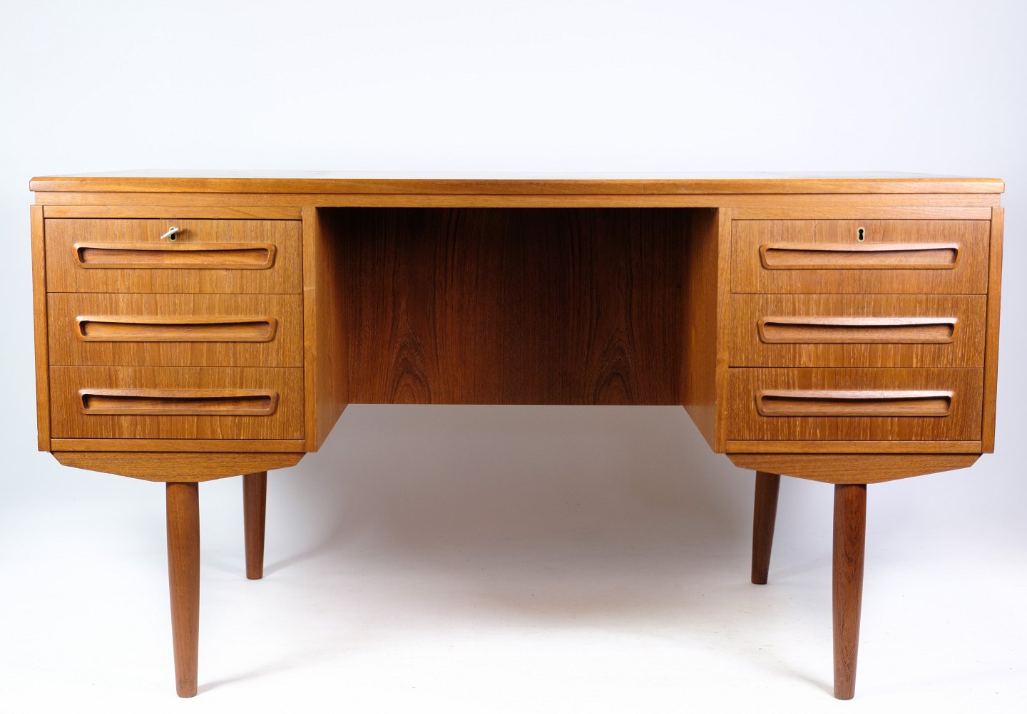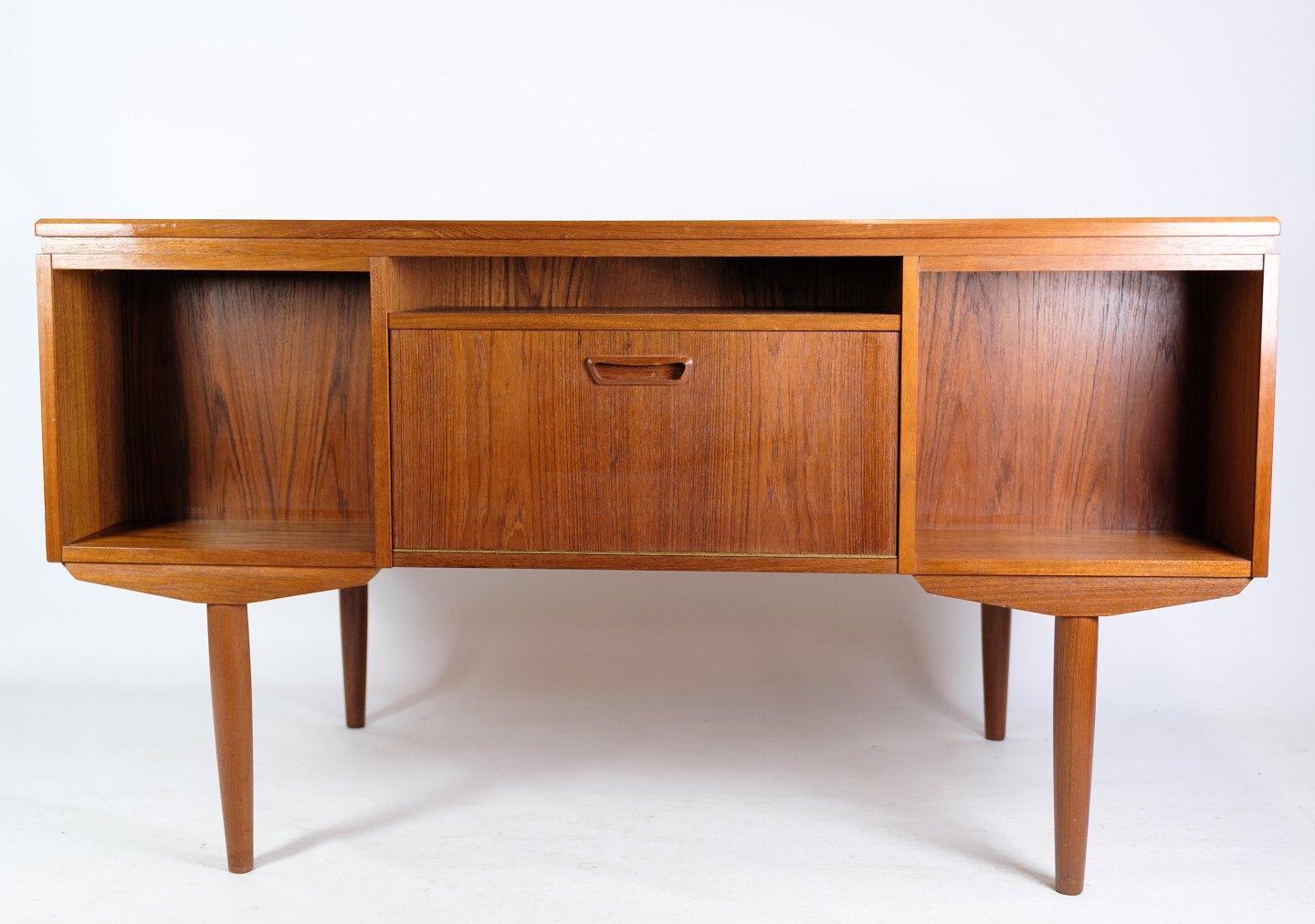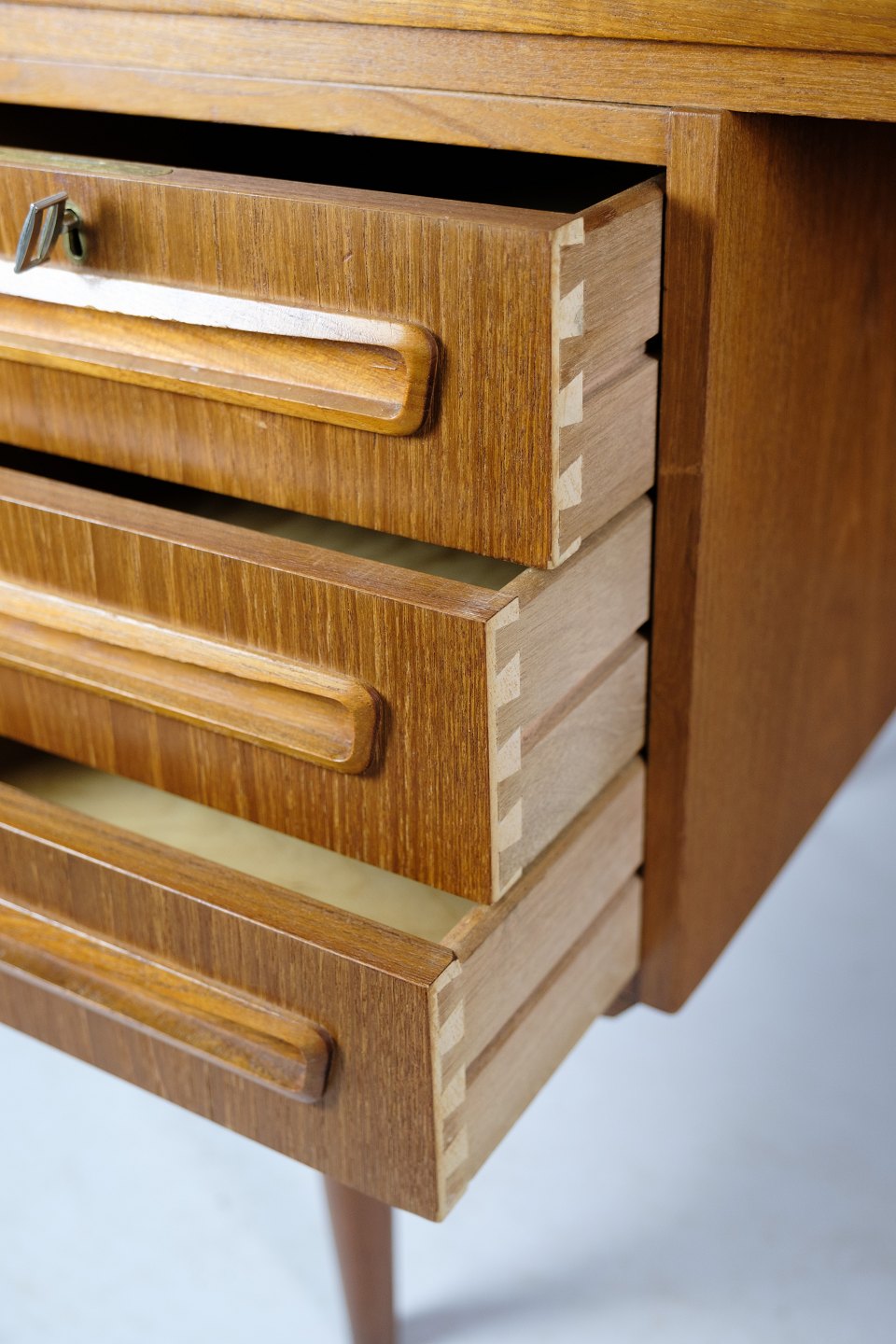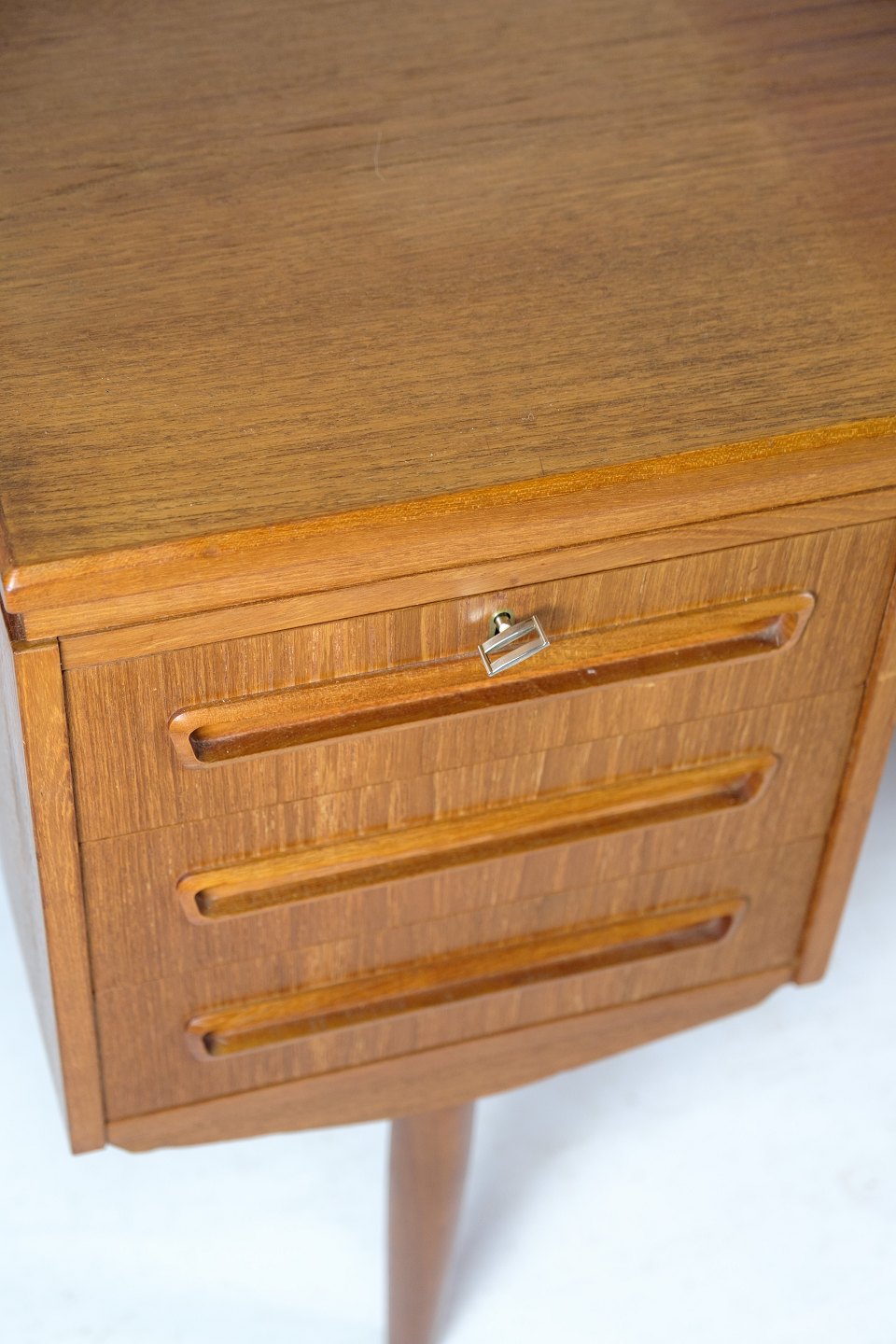 SolgtSkrivebordet i teaktræ, fremstillet af AP Møbler Svenstrup i 1960'erne, repræsenterer den høje kvalitet og det stilfulde design, der er karakteristisk for dansk møbelproduktion fra den tid.