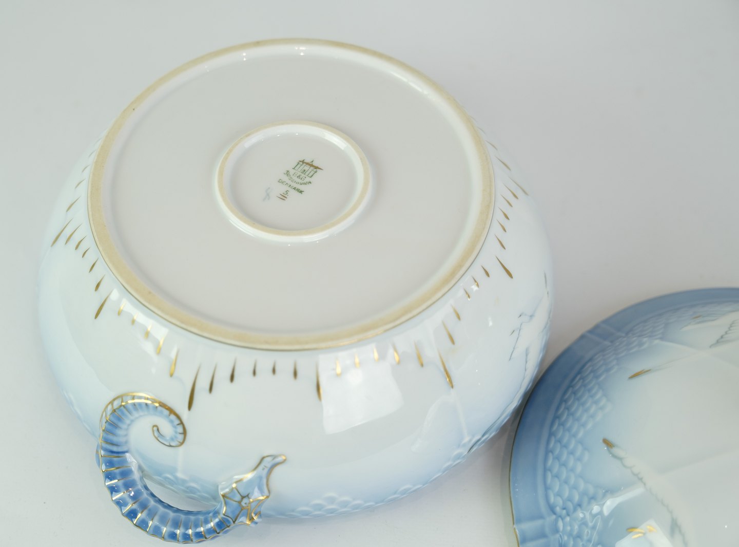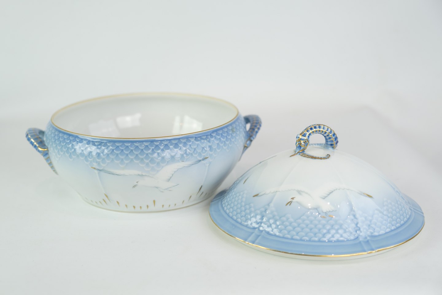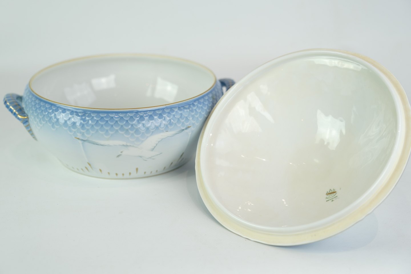 SolgtRund terrin fra Bing & Grøndahl i mågestel med guldkant.