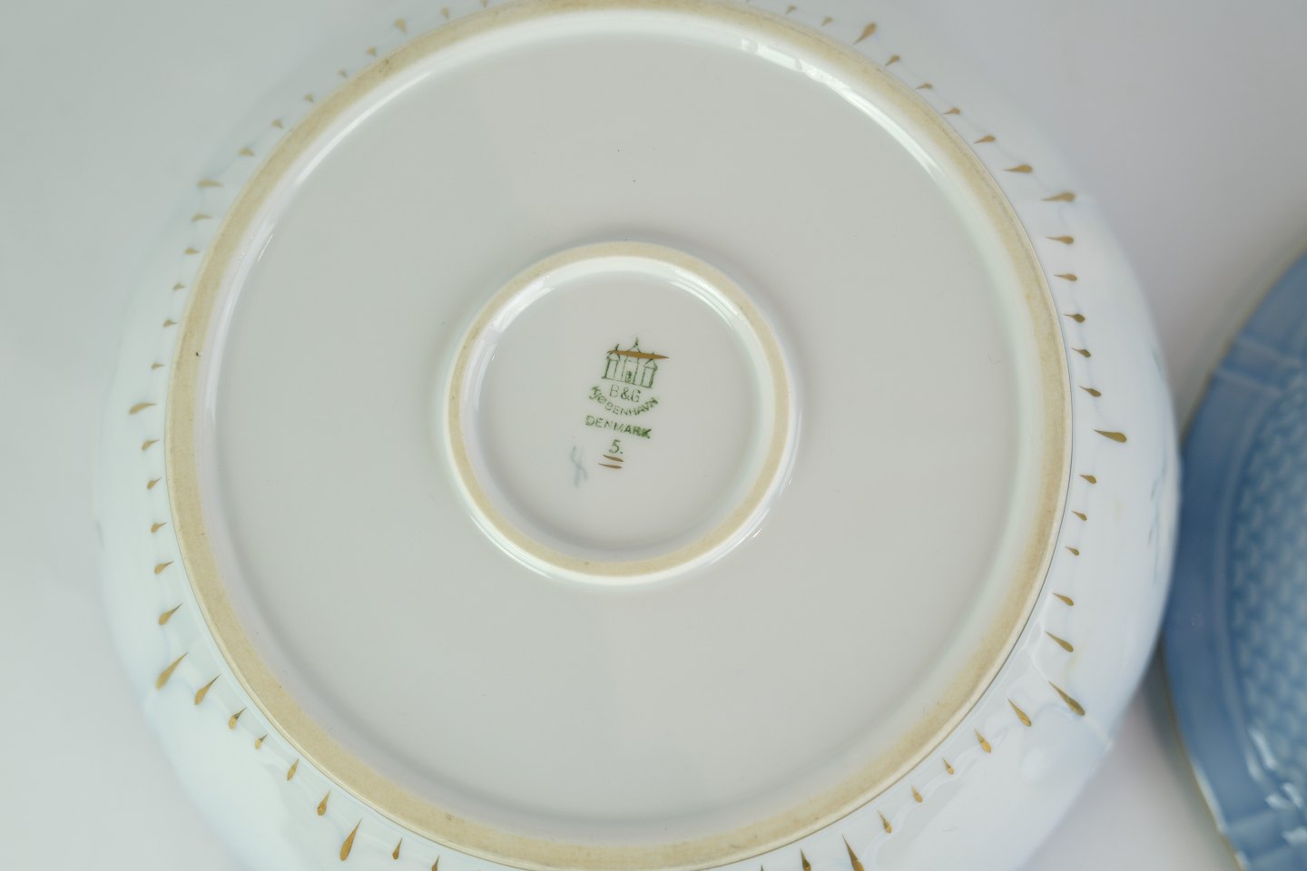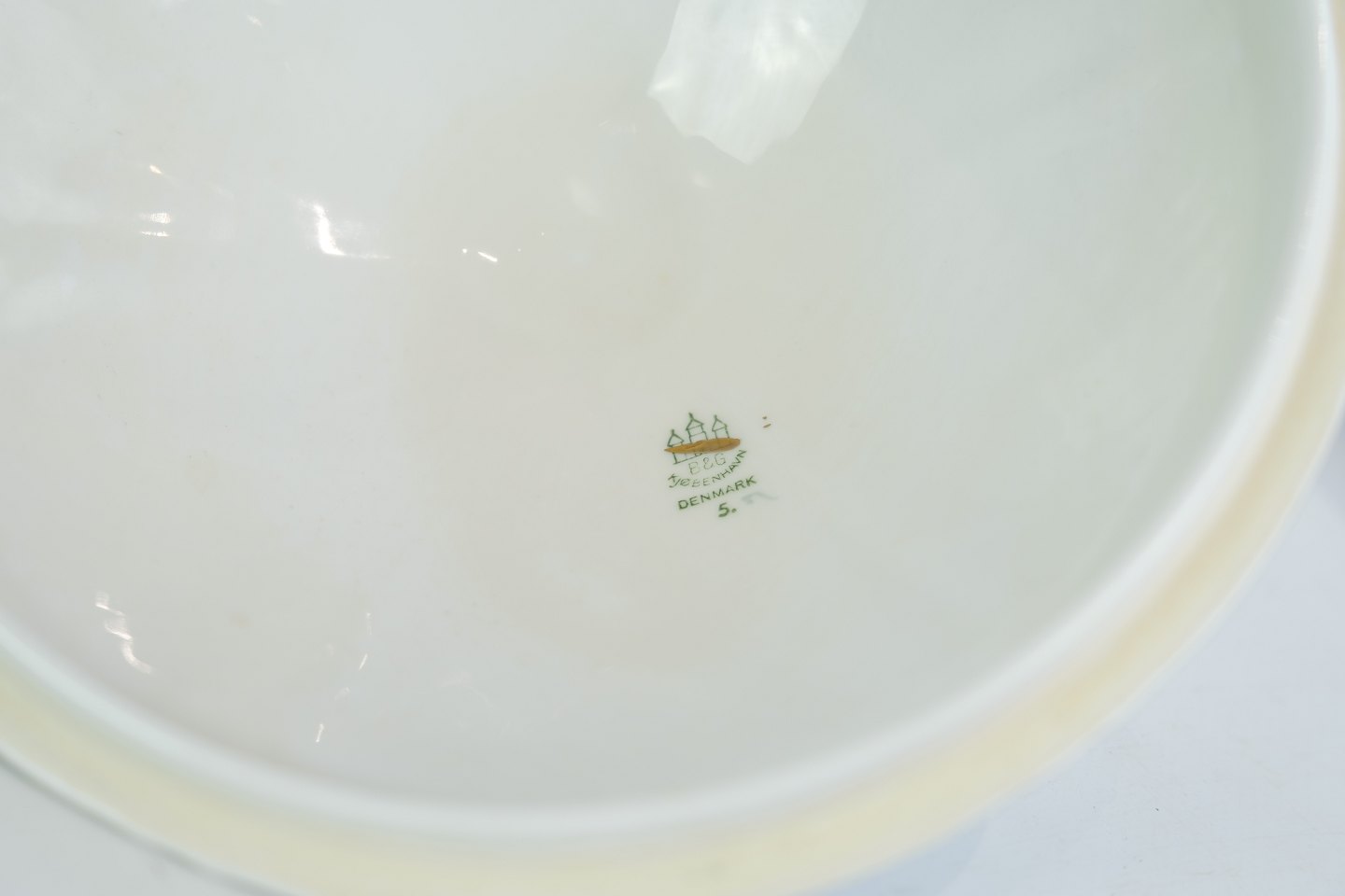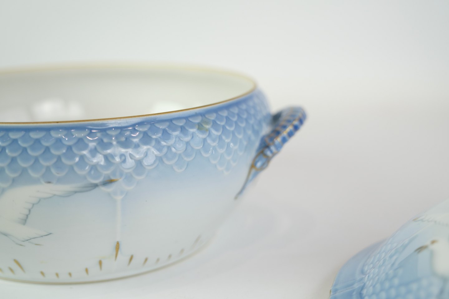 SolgtRund terrin fra Bing & Grøndahl i mågestel med guldkant.