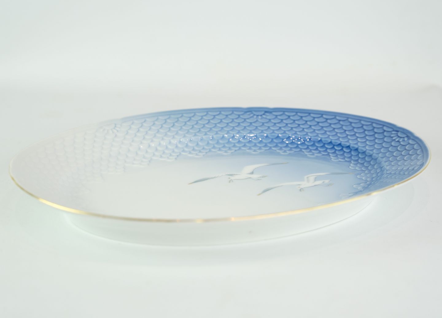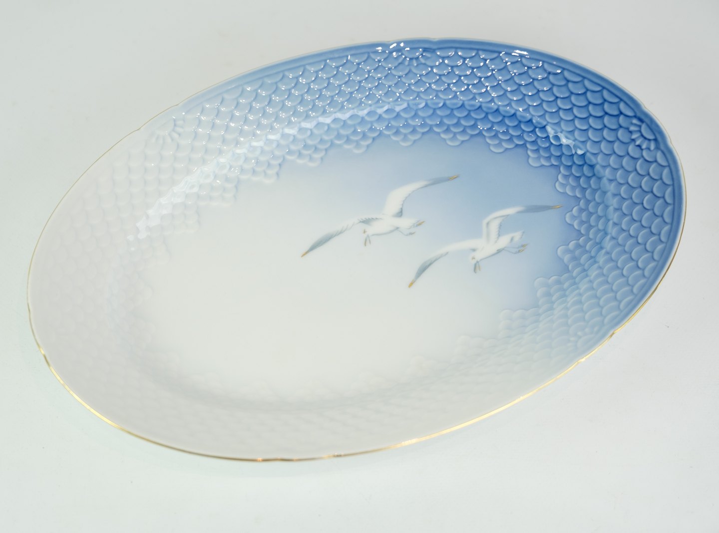 Stort ovalt fad fra Bing & Grøndahl i mågestellet med guldkant no. 16.