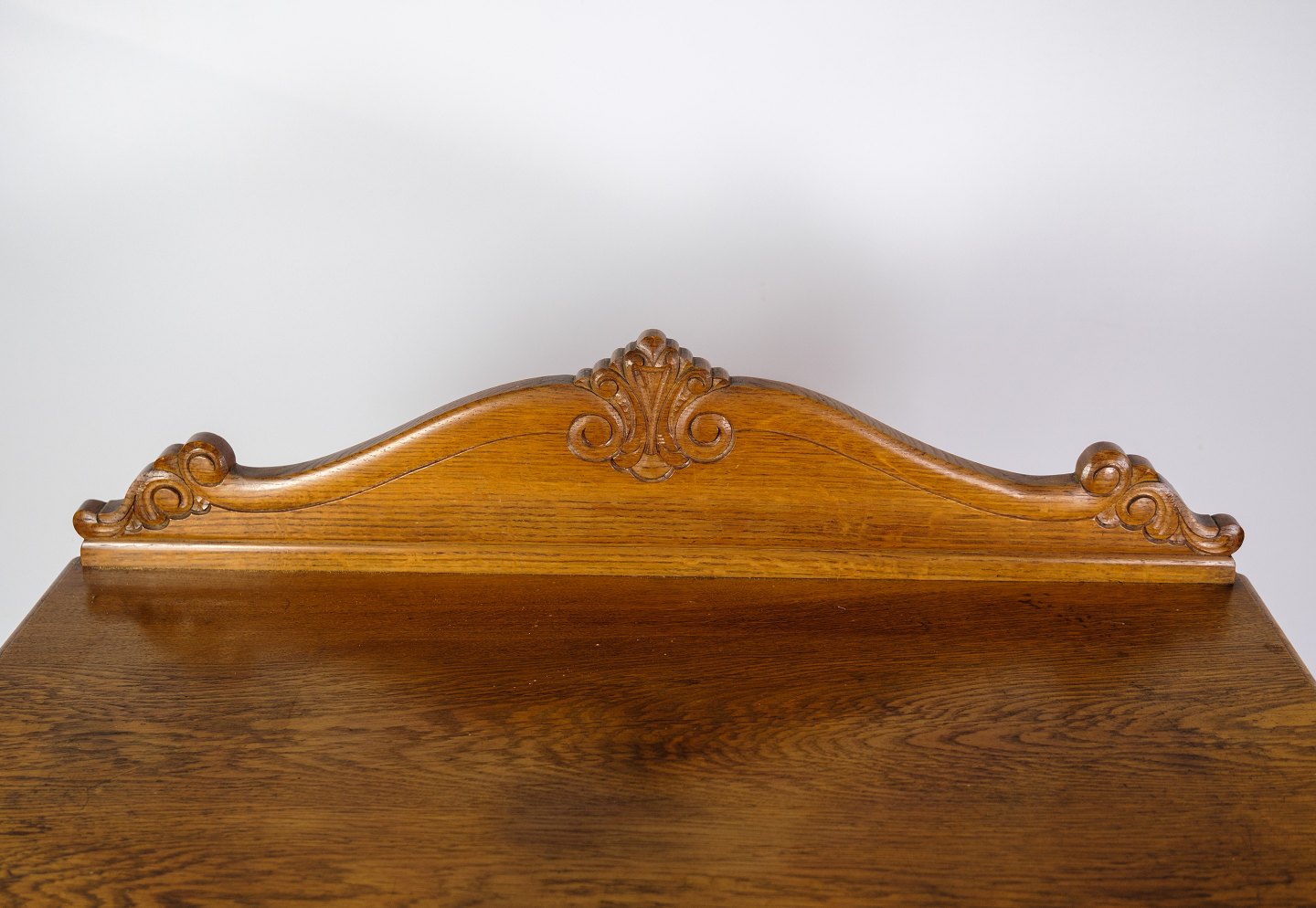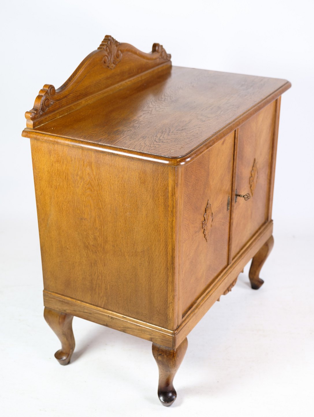 Lille skænk i egetræ med 2 låger og udskæringer fra omkring 1930’erne.